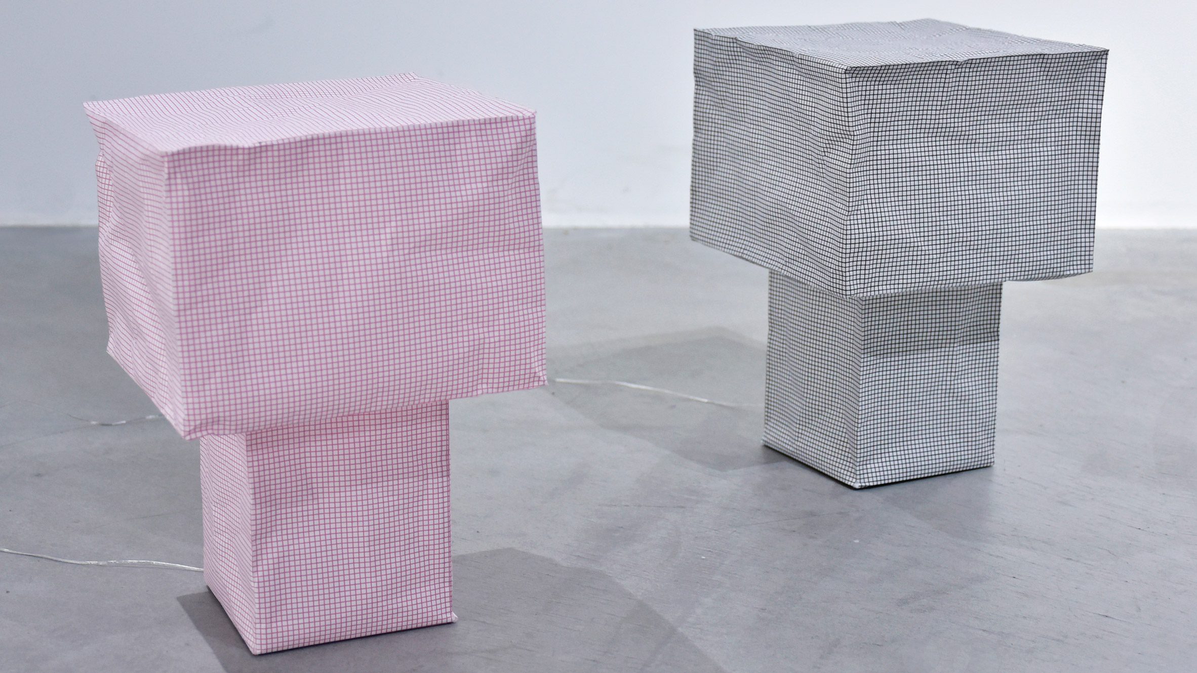 Полая лампа имеет в основании отверстия, через которые вдыхают воздух для сборки предмета. После надувания он крепится на основание из алюминиевого листа. Плоский светодиод, встроенный в основание, загораясь, подчеркивает геометричные складки бумаги.