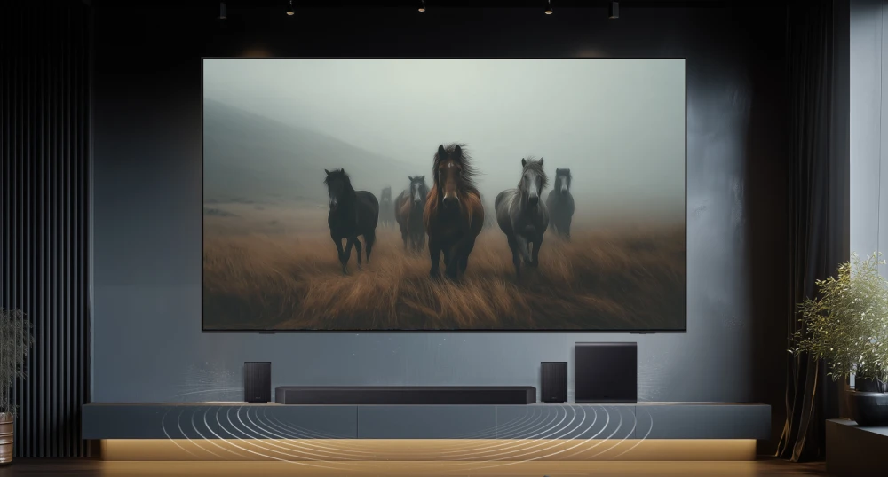 Но изображение в кинотеатре — это еще не все. Погружение в любимый контент становится глубже благодаря саундбару, который поднимает звучание на новый уровень. Технология Dolby Atmos создает трехмерное звуковое пространство, буквально «обволакивающее» слушателя, а функция Q-Symphony синхронизирует динамики ТВ и саундбара, формируя единое звуковое поле. Именно синергия большого экрана и объемного звука обеспечивает иммерсивный опыт просмотра — вы словно оказываетесь в камерном приватном кинотеатре, не выходя из дома.