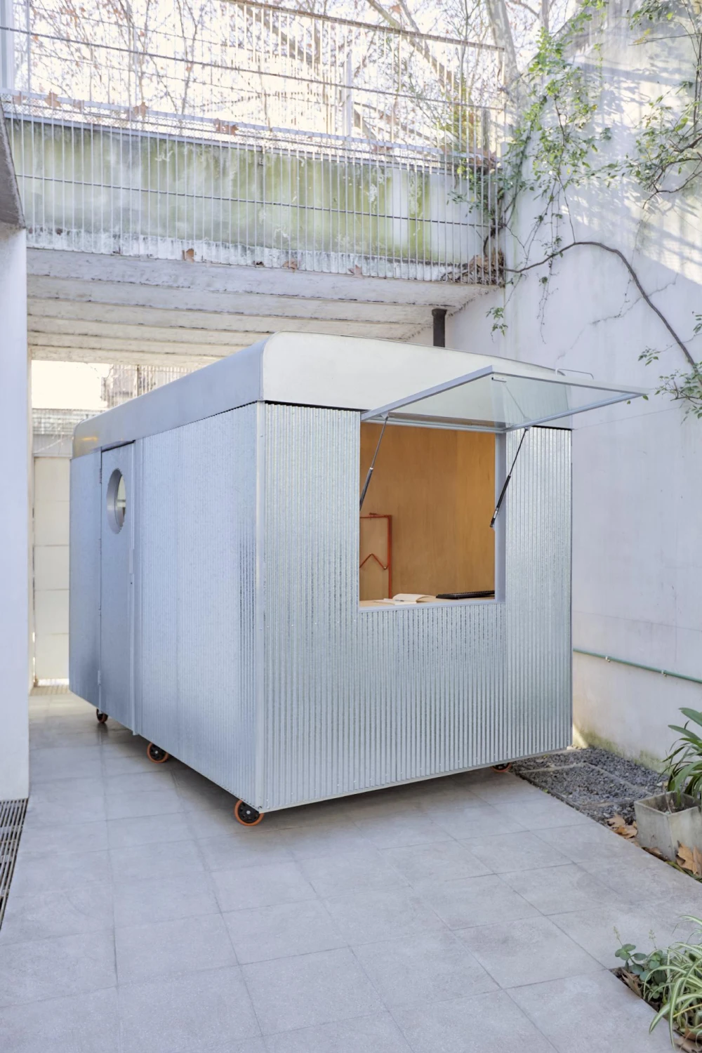 Аргентинская компания Morsa Taller разработала мобильный офис площадью 7 кв. метров. Сейчас он припаркован во дворе частного дома, но его легко можно переместить куда угодно: от городского квартала до лесной опушки и берега моря. Офис представляет собой компактный вагончик, вдохновленный культовыми автобусами Буэнос-Айреса. К знакомому силуэту отсылает плавная форма крыши, которая помогает отводить дождевую воду.