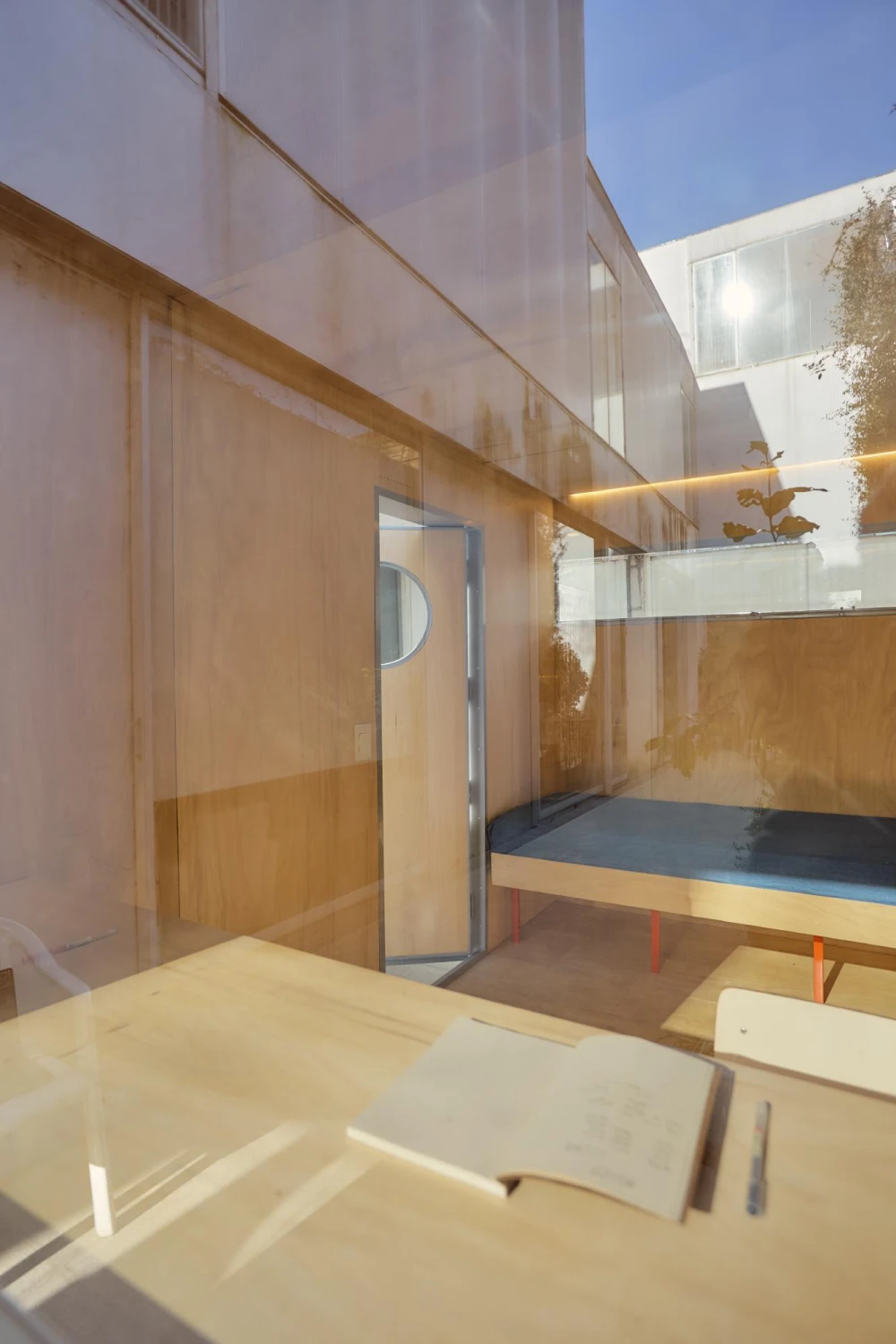 Внутри офис полностью отделан деревом, из мебели в нем есть рабочий стол с ящиками для канцелярии, стул и банкетка с приставным столиком, который можно сложить и повесить на стену. Каждый элемент интерьера разрабатывался индивидуально и изготавливался на заказ с учетом эргономики и логики пространства.