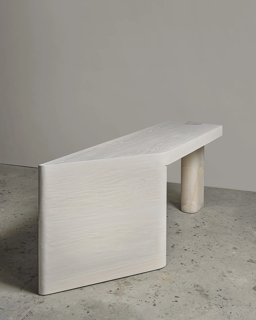 Первые предметы коллекции Castle Шарль Калпакян разработал для Booroom Gallery в 2021 году. К PAD London к серии добавились две новые работы — консоль из дерева и оникса и стул, выполненные той же техникой. Идея серии — в том, как природные материалы создают скульптурное единство, соединяя вертикаль и горизонталь, и как человек, центр интеллектуальной конструкции, преобразует элементы. Каждый фрагмент мрамора обработан так, чтобы раскрыть рисунок и почти мистические совпадения узора: несовершенство рождает особый визуальный язык, а минеральное кружево позволяет пустоте «дышать». Здесь нет декоративности ради украшения — только ясность замысла, следы времени в материале и форме. Серия Castle балансирует между радикальностью и утонченностью: радикальность — в умении соткать тишину из тяжести материала, утонченность — в точности деталей.