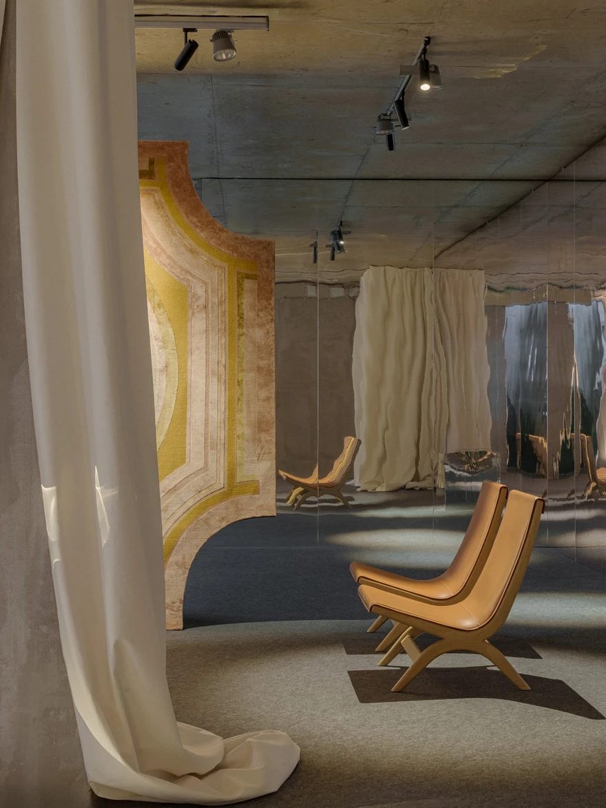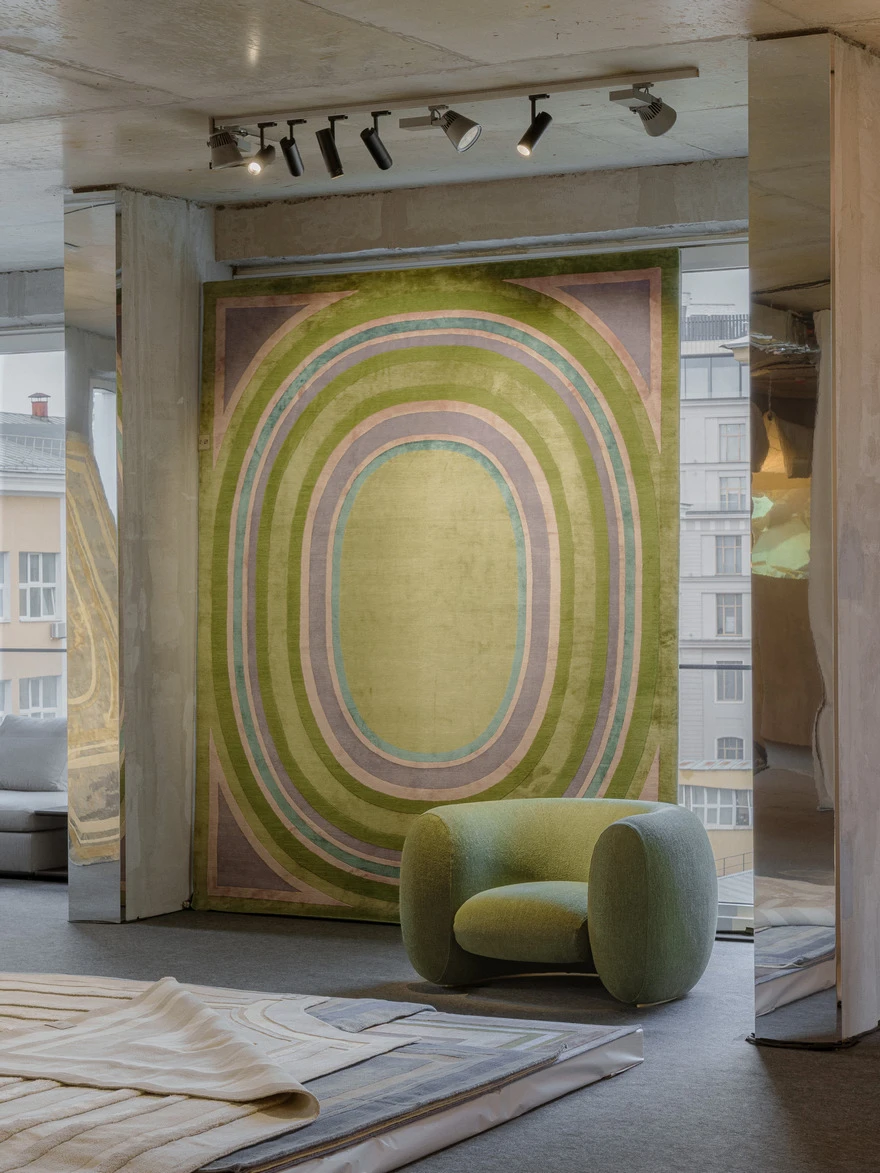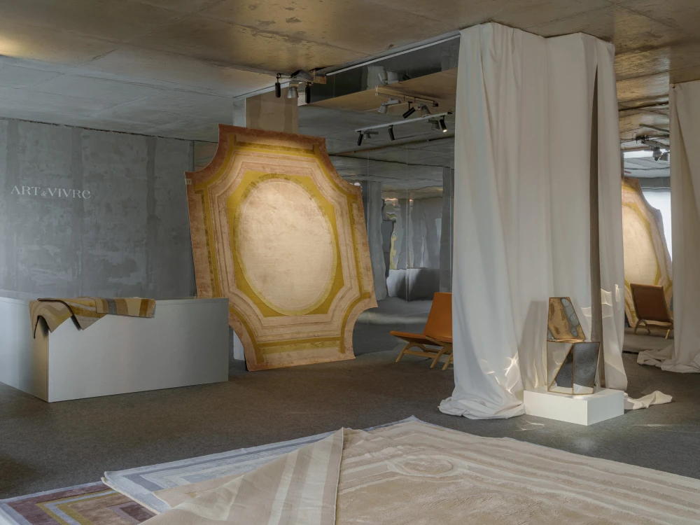 Ковры Modern History выступают центральным элементом сценографии, но ее также дополняют звук, свет и игра отражений, создающие более целостный опыт и позволяющие погрузиться в историю создания коллекции. Такой подход раскрывает ключевую идею Art de Vivre — ковер может быть чем-то большим, чем просто элементом интерьера. Ведь для бренда важно работать с эмоциональным опытом так же тщательно, как с формой.
