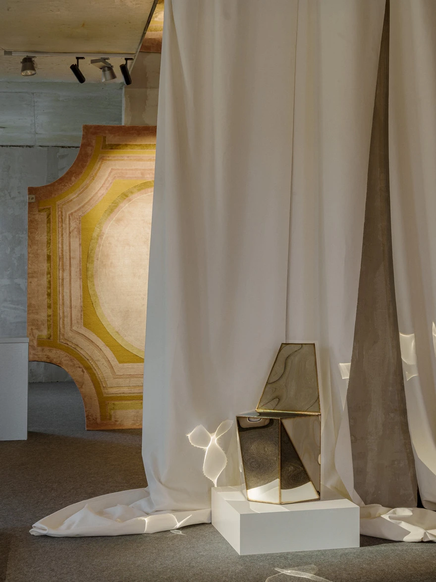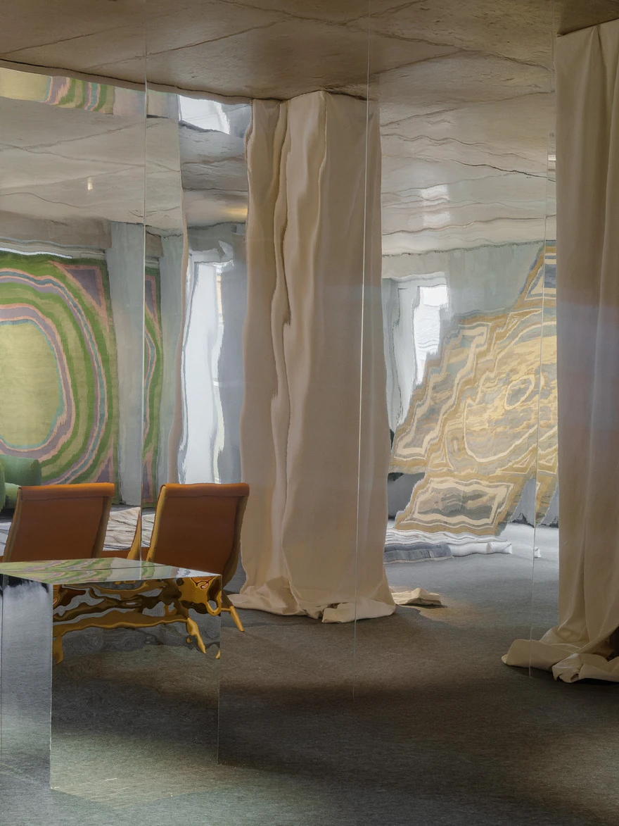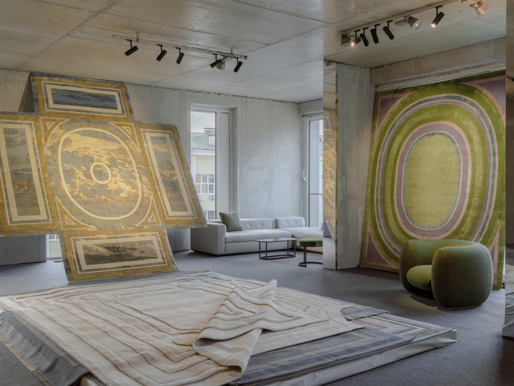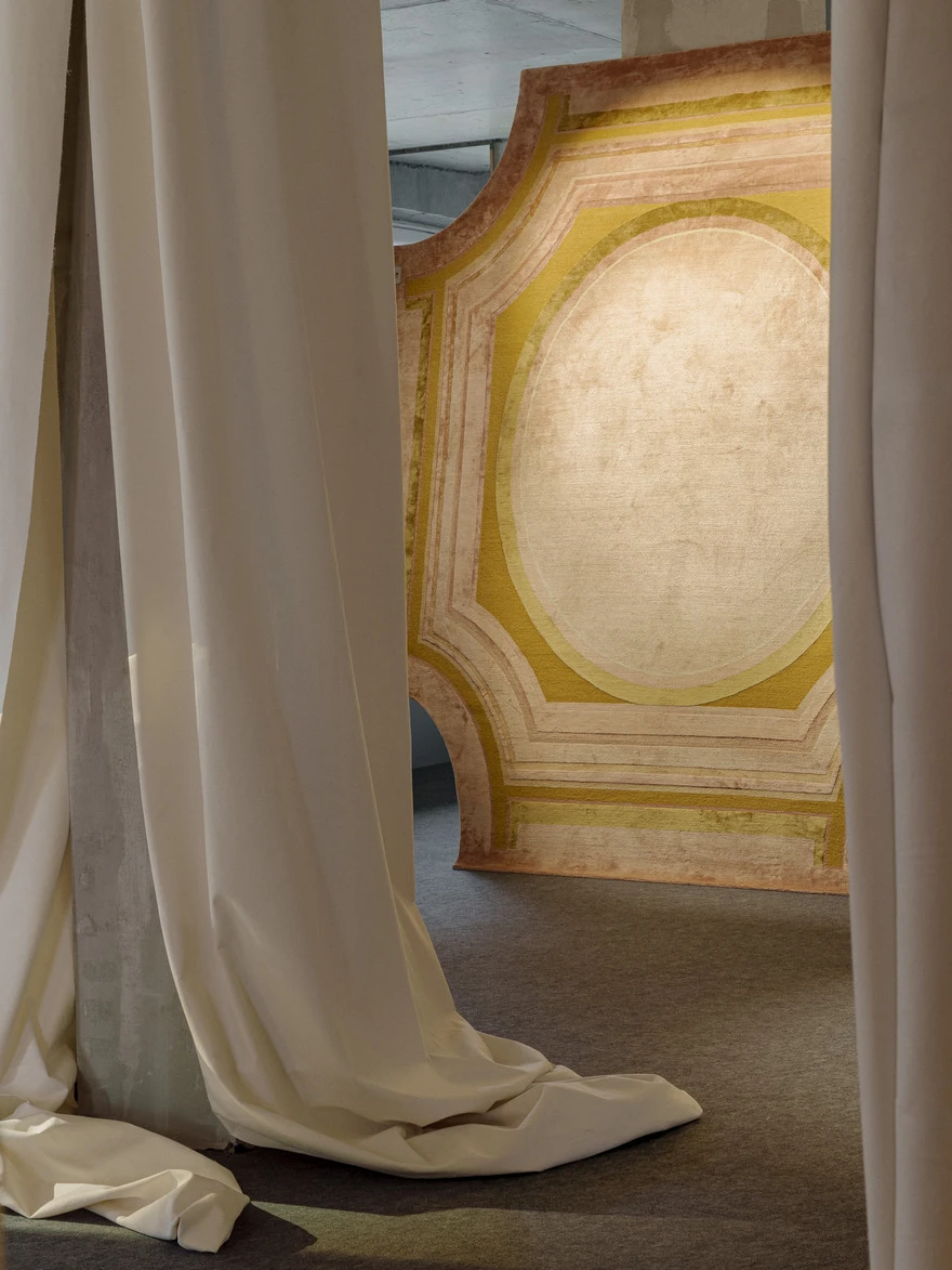 Ковры Modern History выступают центральным элементом сценографии, но ее также дополняют звук, свет и игра отражений, создающие более целостный опыт и позволяющие погрузиться в историю создания коллекции. Такой подход раскрывает ключевую идею Art de Vivre — ковер может быть чем-то большим, чем просто элементом интерьера. Ведь для бренда важно работать с эмоциональным опытом так же тщательно, как с формой.