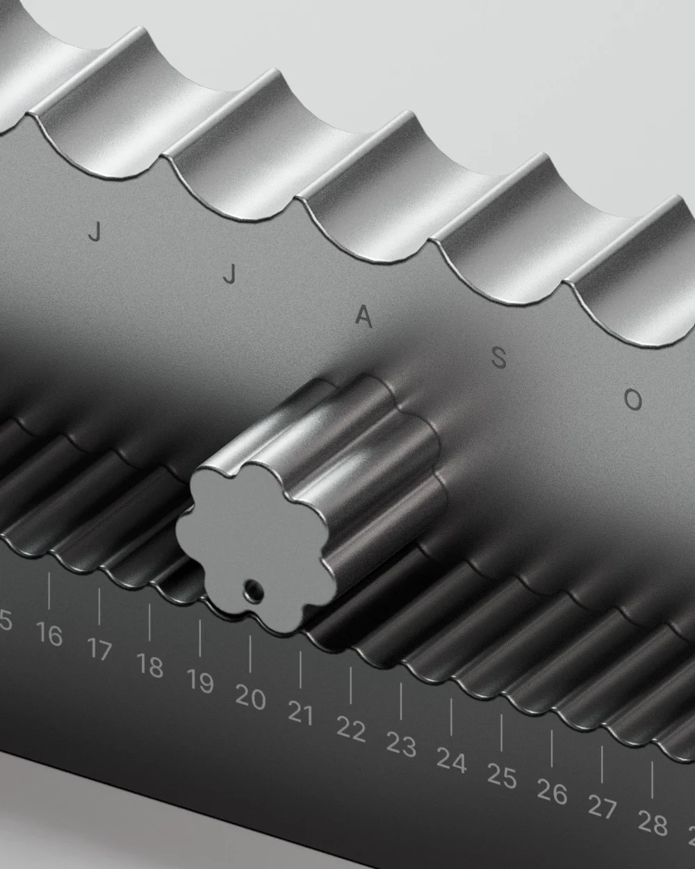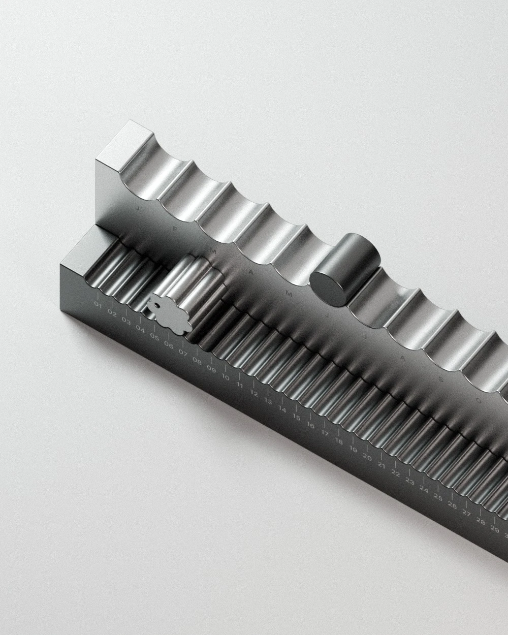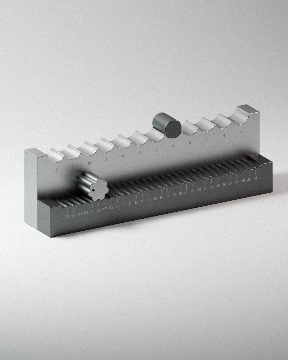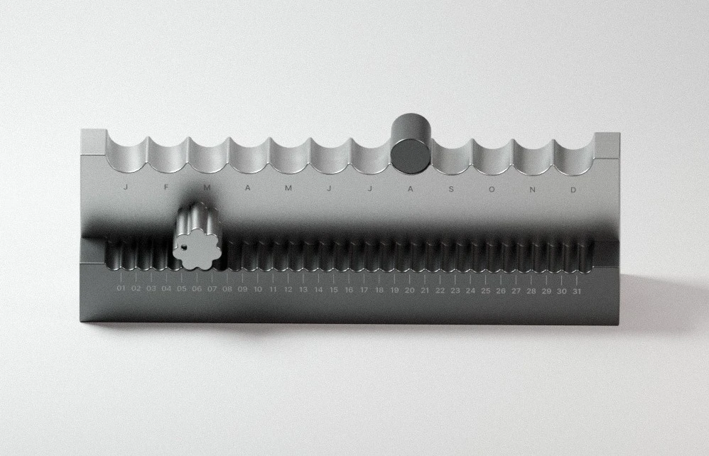 Минималистичный предмет с ритмичными поверхностями предназначен для размещения на столе или на полке. Дизайн основан на тактильном взаимодействии: чтобы узнать и установить дату, пользователь физически перемещает элементы календаря. Верхняя панель с двенадцатью выемками и цилиндрическим маркером указывает на месяц, а нижняя с регулятором, напоминающим цветок, — на число. Компания заявляет, что разработка будет запущена в производство, хотя дата выхода и цена пока не объявлены.