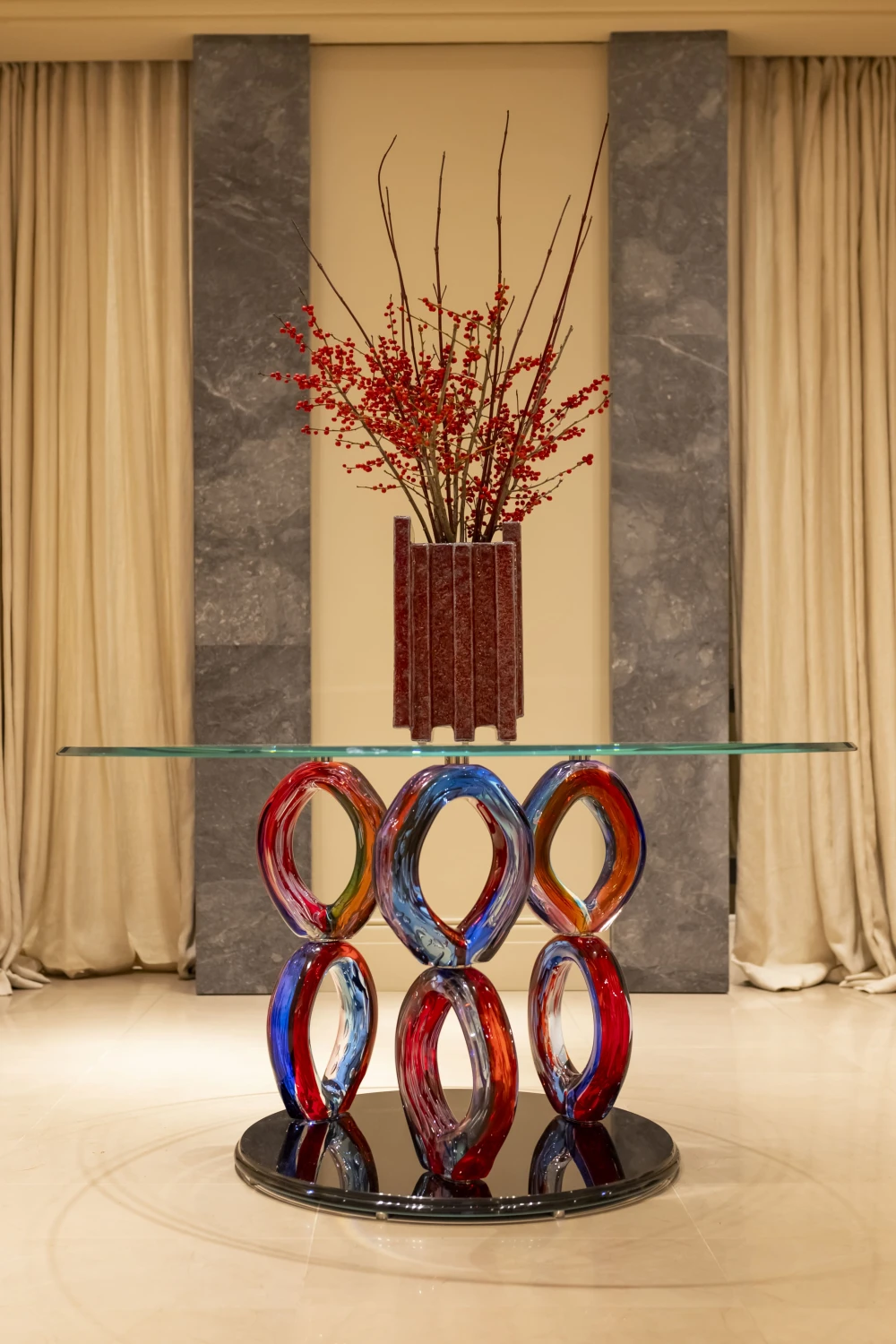 Reflex специализируется на работе с мурманским стеклом, умело сочетая его с мрамором, деревом и металлом. Среди последних моделей бренда — зеркало Dreamcatcher, украшенное расписанными вручную стеклянными бабочками, и придиванные столики Fiore с тонким подстольем из хромированного металла и столешницей в форме цветка, доступной в разных оттенках — от белого и черного до оттенков янтаря и изумрудов. Также в шоуруме в ГУМе можно найти коллекцию кофейных столиков Tau Murano, стол Neolitico с причудливым волнообразным основанием и обеденный круглый стол Venezia с ножками из цветного стекла, созданный специально для Bosco Casa по мотивам одноименной консоли.