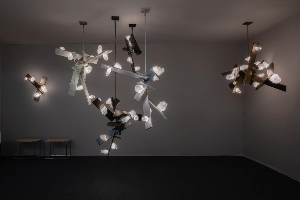 Идея движения и энергии проявляется и в световых объектах Линдси Эдельман. Представленная ею система Andromeda довольно брутальных пропорций собрана из пересекающихся алюминиевые перекладин и похожих на бесформенные кристаллы стеклянных плафонов. Неожиданно поэтичным оказался и стенд датского бренда Frama. Здесь аромат распространяется с помощью вращающегося водяного колеса, встроенного в деревянный стол: вода испаряется, постепенно наполняя пространство запахом. Инженерный механизм превращает невидимый аромат в физическое присутствие.