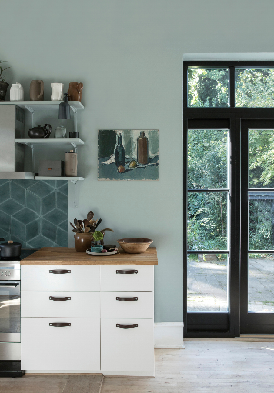 Большинство зеленых цветов из палитры Flugger отлично сочетаются со светлым и темным деревом, а также с металлами —медью, латунью и сталью.
