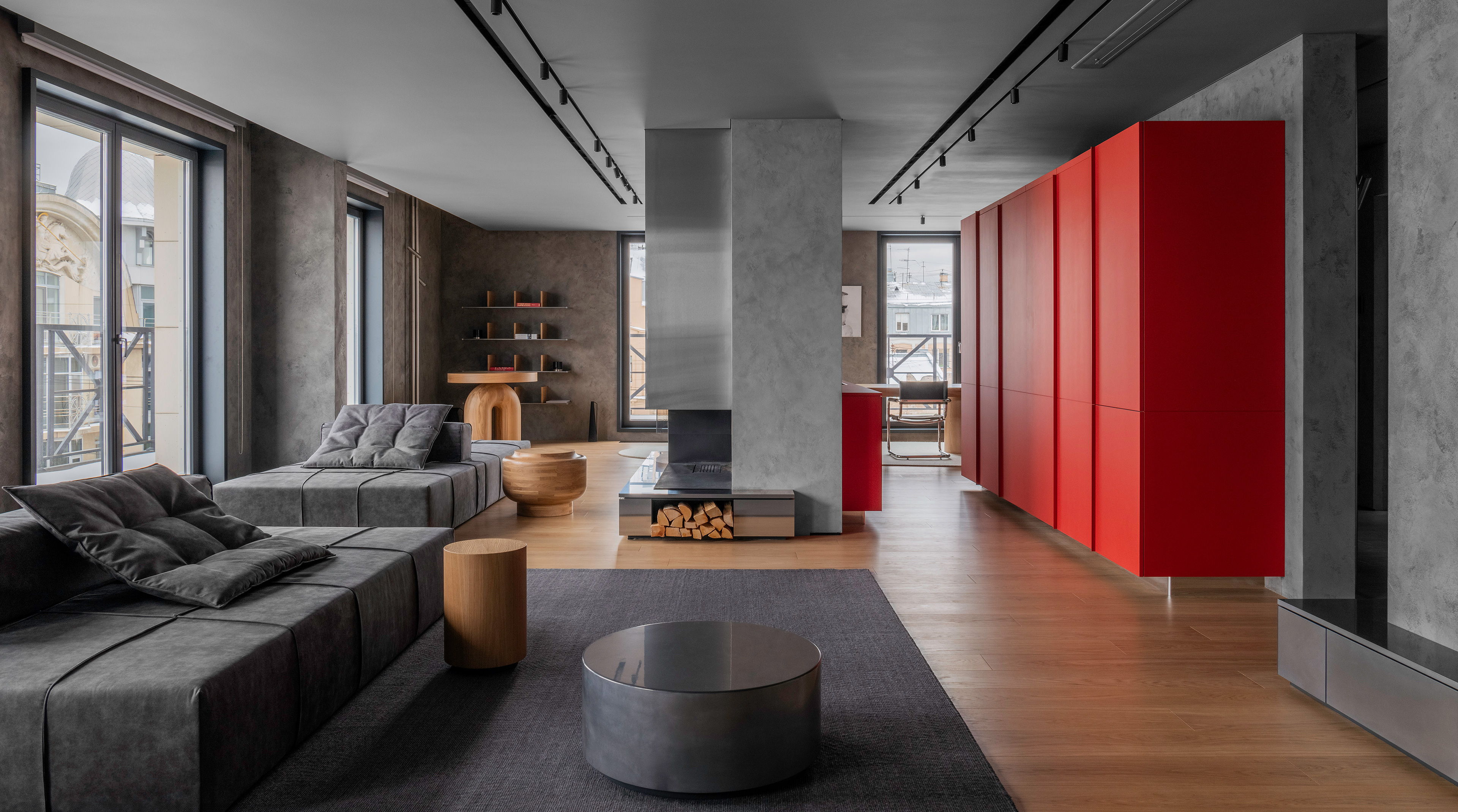 Серо-красный интерьер в Петербурге по проекту DA bureau: эра брутализма