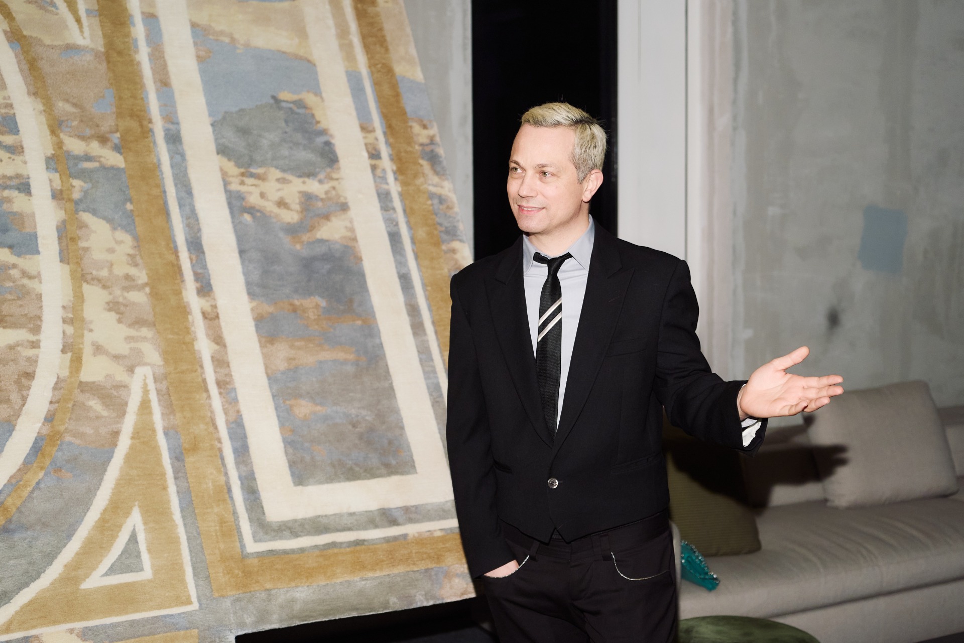 Место для экспозиции — видовой пентхаус LUMIN — выбрано не случайно. В коллекции Modern History автор переносит искусство парижских дворцовых потолков XVII века на пол. LUMIN органично продолжает эту эстетическую линию: пространство пентхауса с большой площадью и панорамными окнами «в пол» позволяет показать ковры в масштабе, которого требуют произведения ручной работы. Партнером в наполнении пространства выступил интерьерный шоурум HOMEART: предметы премиальных брендов, таких как Molteni&C, Imperfetto Lab, Halo edition, а также коллекционный стул от Julian Mayor, представленный на Cosmoscow 2025, гармонично дополнили сценографию. Атмосферу вечера поддержали вина из коллекции SimpleWine — сети винотек, входящей в группу компаний Simple. Креман из Долины Луары, бургундский совиньон блан и белый бленд из Гаскони продолжили французскую тему коллекции. На вечере присутствовал и сам создатель дизайна новых ковров Пьера Гоналон: он прилетел в Москву, чтобы лично представить коллекцию, обозначить ее художественный контекст и передать тот тонкий взгляд на форму, который лежит в основе Modern History.
