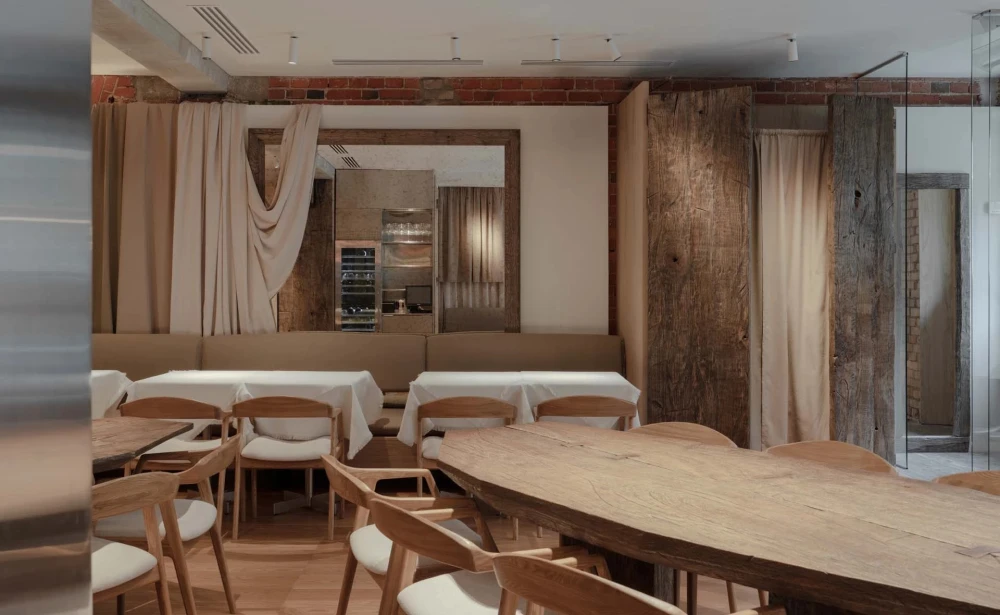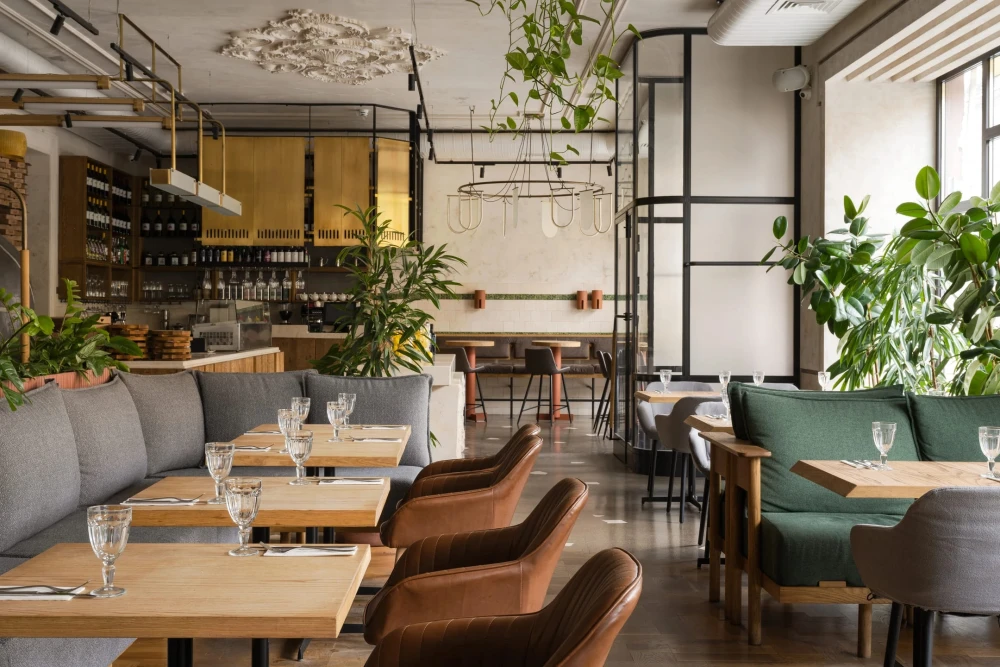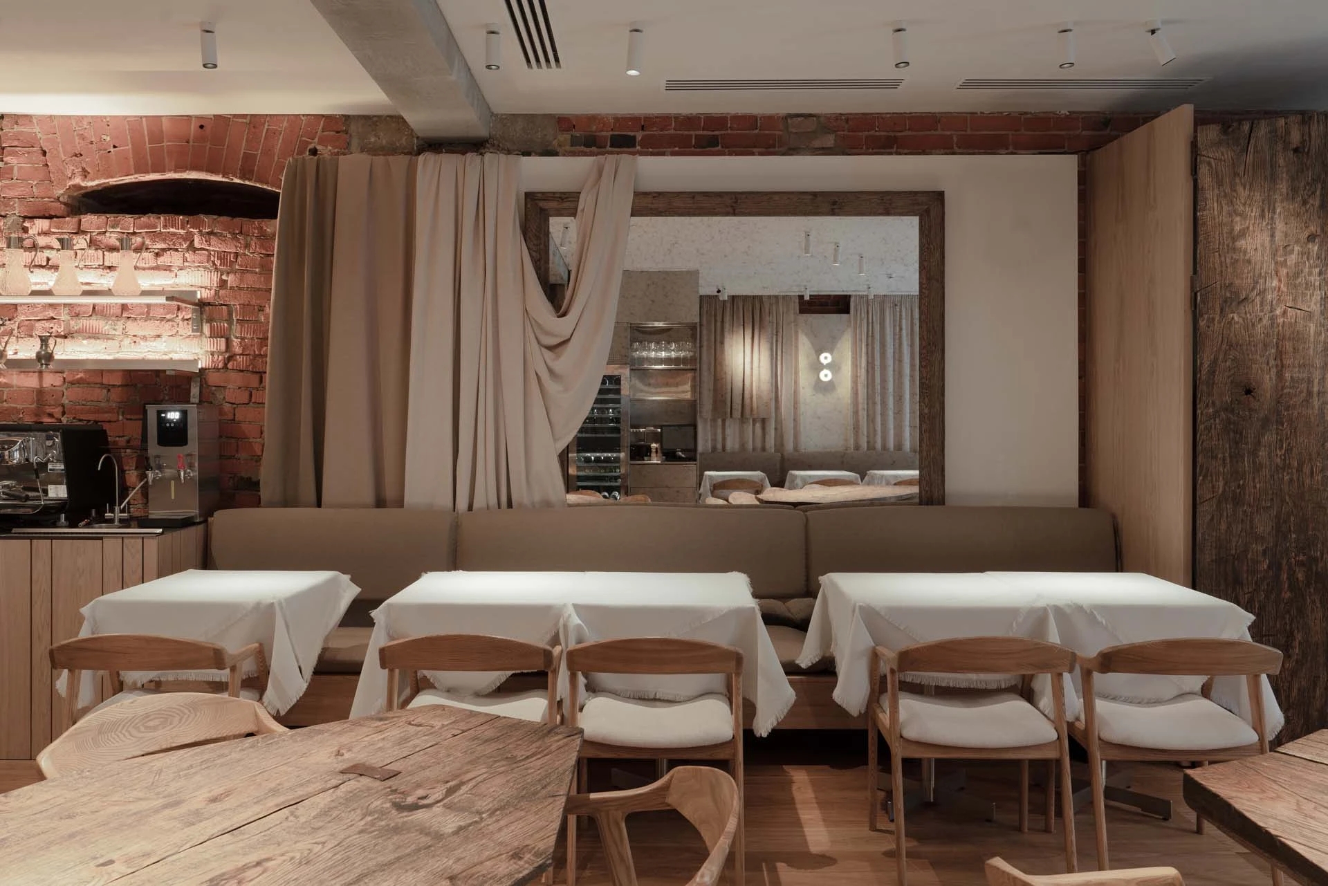Ресторан Grassa в центре Москвы вдохновлен настроением Болоньи с теплой камерной атмосферой узких улиц. За интерьер пространства отвечала студия DA bureau. «Основные ценности проекта — открытость и визуальную честность — мы подчеркнули в планировке: все происходит на глазах у гостей, — говорит команда. — Шеф ресторана приветствует посетителей прямо из открытой кухни. Рядом сушатся букеты специй, где-то видна накинутая ткань — все по-настоящему, как дома». Интерьер Grassa построен на нюансах, пространство раскрывается перед гостями постепенно. Палитра включает только натуральные материалы, максимально приближенные друг к другу по фактуре и цвету: дерево, итальянский травертин, льняной текстиль. Все это позволило сделать его спокойным, безопасным и будто «обнимающим» гостя. «Для нас было важно найти тонкий баланс между современностью и винтажными объектами. Акценты помогли расставить незаметные с первого взгляда детали: винтажные стулья из Болоньи, посуда с европейских барахолок, латунные элементы, инкрустированные в столы и пол», — объясняют архитекторы. Вместо современного декора студия использовала настоящие объекты с историей, а некоторые деревянные элементы состарили специально, подчеркнув связь с историей.