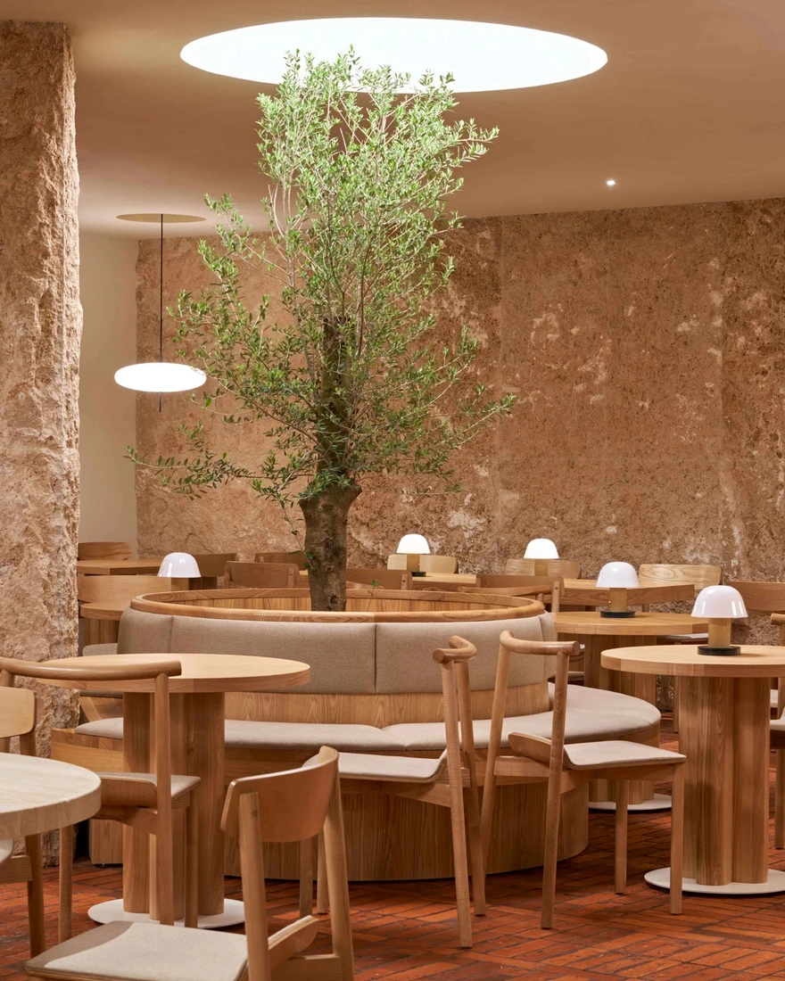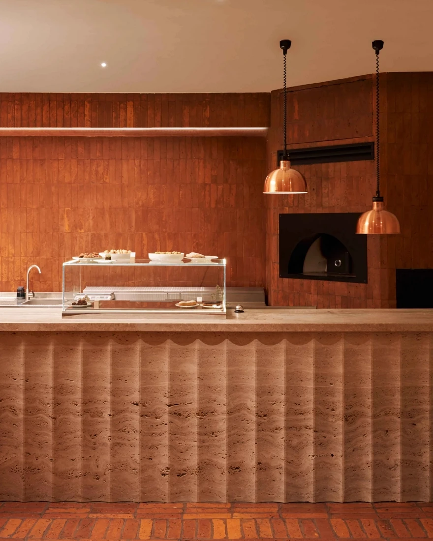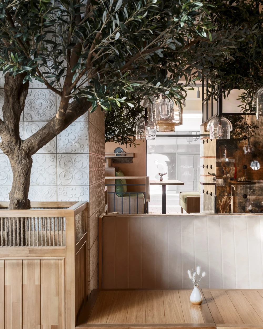 Семейный ресторан Olio похож на двор итальянской траттории где-то на южном побережье: фактура камня, стихийный рисунок клинкерной плитки и терракотовые оттенки переносят в жаркое средиземноморское лето. За интерьер нового проекта в Екатеринбурге отвечало бюро ludi_architects. «Ресторан расположен на цокольном этаже, поэтому главной задачей для нас было «впустить» улицу туда, где мало света и воздуха», — объясняет команда. В пространстве много аутентичных итальянских материалов: стойка бара выполнена из тосканского травертина, мрамор привезен из города Брешиа. К культуре Италии отсылают и оливковые деревья, «выросшие» в залах. Пространство ресторана разбито на три зоны: бар с открытой кухней и дровяной печью, главный зал и детская зона. Зона посадки сформирована вокруг колонн и оливковых деревьев. Для посетителей предусмотрели самые разные опции: это большая круглая скамья у оливы, отдельные столики и длинная скамья вдоль стены. Особое внимание уделили созданию детской зоны: в ресторане есть отдельный зал для игр, чтения и рисования, отдыха и проведения мастер-классов.