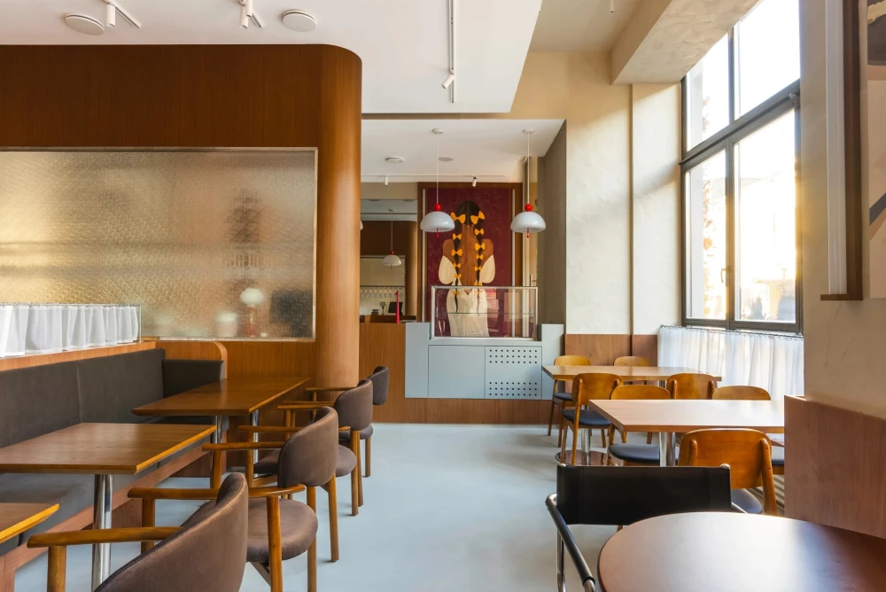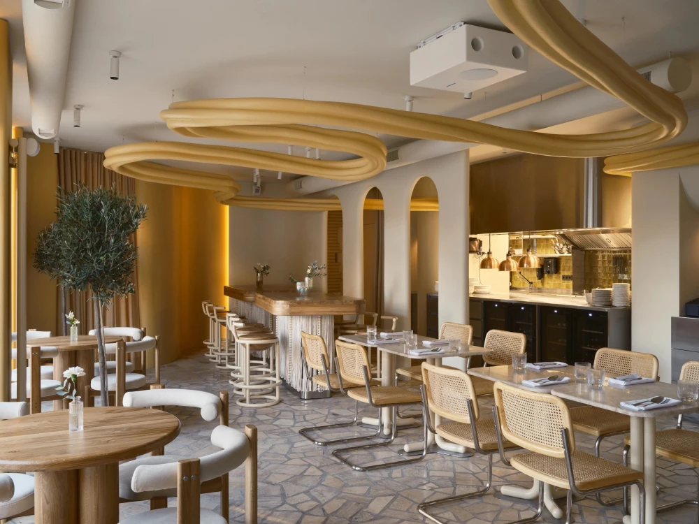 Студия Line Design создала интерьер современной остерии Tutto в Калининграде. Любовь к Италии стала движущей силой проекта и определила дизайн интерьера, в котором запечатлен образ главного блюда итальянской кухни — пасты. «Интерьер наполнен атмосферой итальянской страсти к еде и гостеприимству, — говорят авторы проекта. — Именно поэтому концепция олицетворяет пластичность — главное свойство, характеризующее пасту. Этот мотив буквально пронизывает все пространство: плавные изгибы стен, отсутствие прямых углов, мягкие формы в мебели и многообразие декоративных форм, напоминающих о гибкости продукта. Мы настолько сильно прониклись идеей пластичности, что воссоздали макаронину в гипертрофированной форме! Эта декоративная инсталляция, извиваясь сквозь открытую кухню, проходит через все пространство зала, создавая визуальный и концептуальный диалог между кухней и гостями». В проекте активно применяется натуральное дерево, а пол выложен из битых кусочков травертина, из которого также были выполнены столешницы столов и раковина в зоне санузла. Керамическая плитка на открытой кухне имеет оливковый оттенок и выступает как яркий акцент, напоминая о зелени итальянской природы. Живые оливковые деревья в кадках привносят ее частицу в интерьер в буквальном смысле.