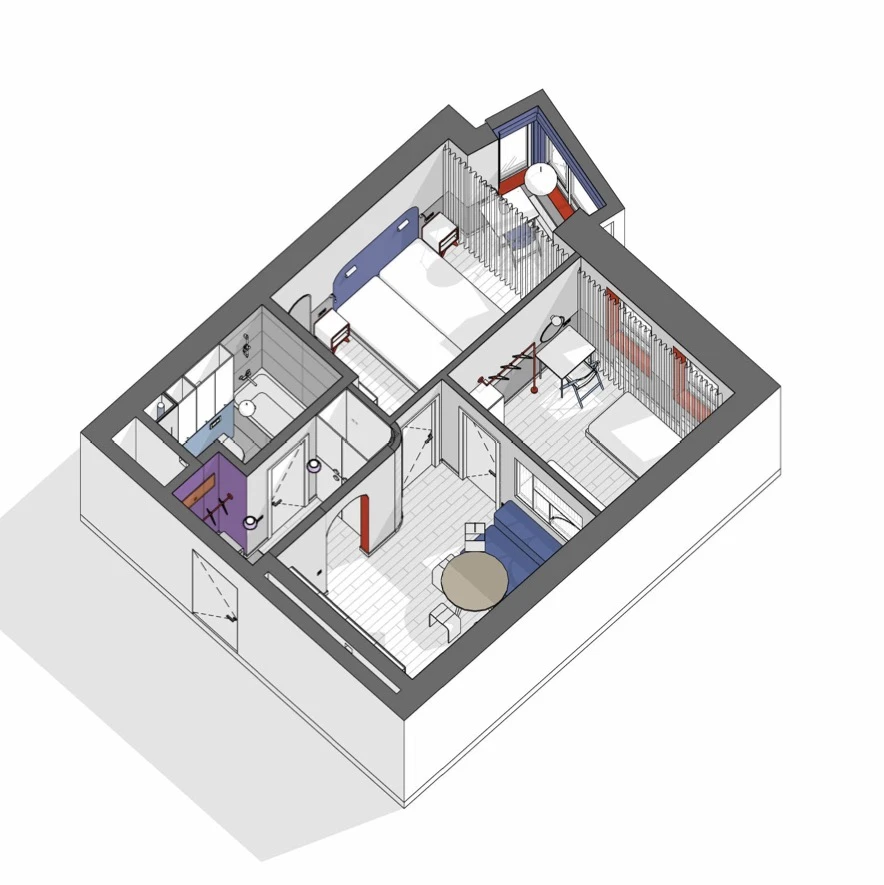 «В процессе создания планировки я была недовольна эргономикой получившихся спальных комнат: проходы между кроватями были слишком маленькими. Тогда я решила заменить стандартные кровати на кровати конструкции Box Spring без изголовий и бортов. Так при аналогичном размере спальных мест их габариты на 10-20 сантиметров меньше по сравнению с обычными кроватями. А изголовья просто нарисовали на стене. Громоздкие платяные шкафы заменили на систему хранения со штангами для вешалок и дополнили их небольшими шкафчиками для хранения одежды и полками для нижнего белья».