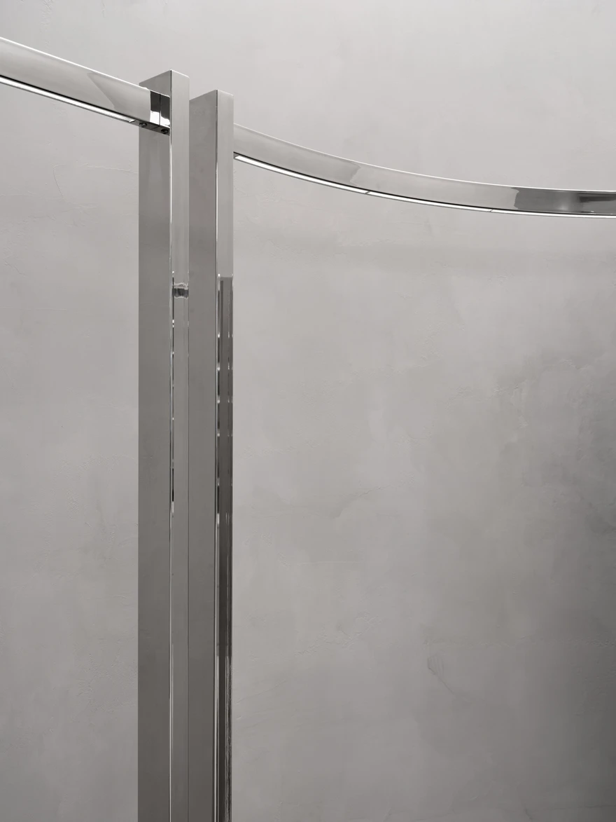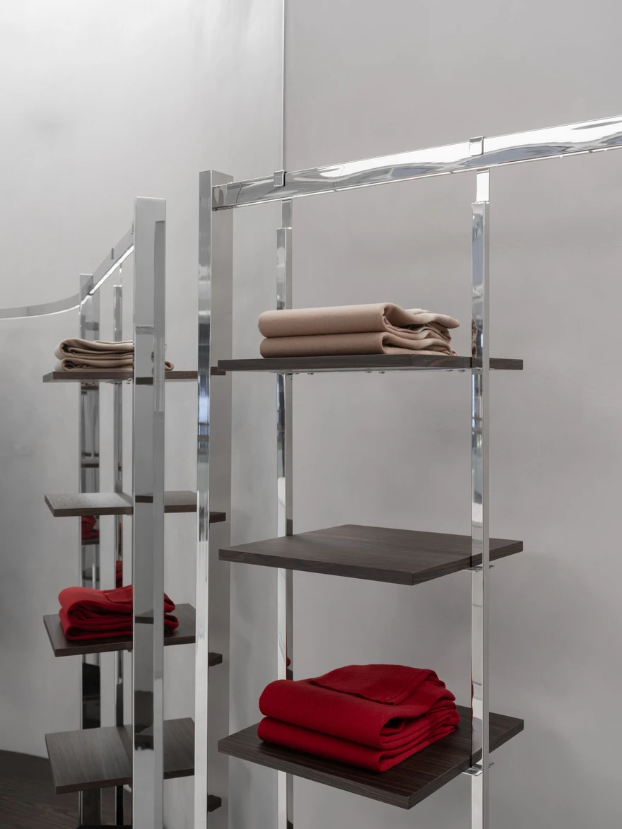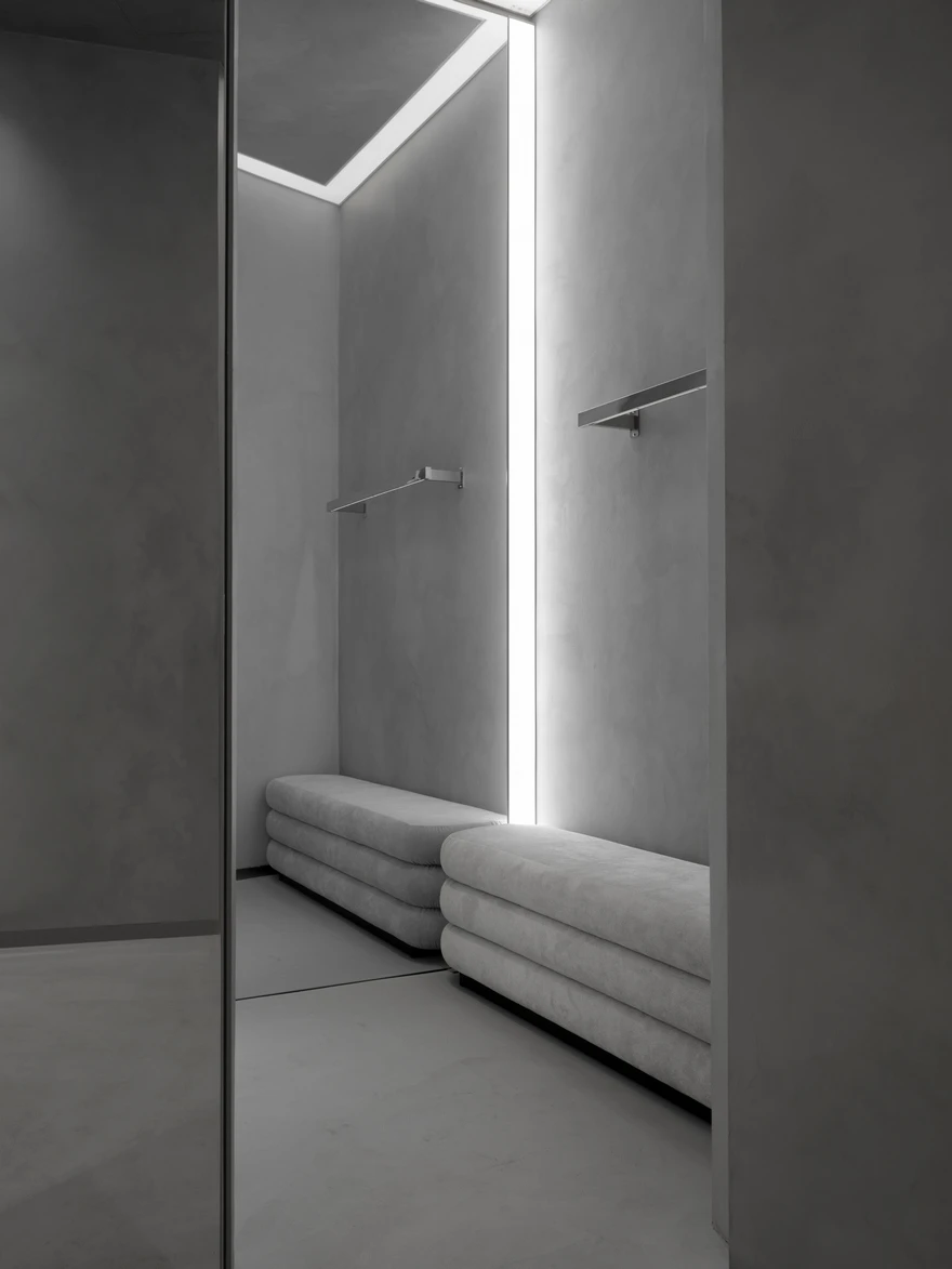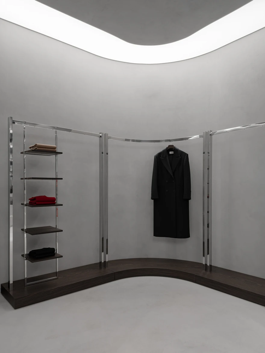 Магазин общей площадью 61,6 кв. метра находится в московском ТРЦ «Метрополис». Прежде это помещение занимал обувной магазин, поэтому первым этапом работы стал демонтаж. «У заказчика было четкое пожелание: создать выставочные стенды для продукции бренда, — рассказывает архитектор. — На встрече он предоставил референсы c деталями, идеями по материалам и настроению. Кроме того, необходимо было предусмотреть компактную зону для демонстрации одежды, примерочную, а также небольшие пространства для хранения и работы сотрудников».
