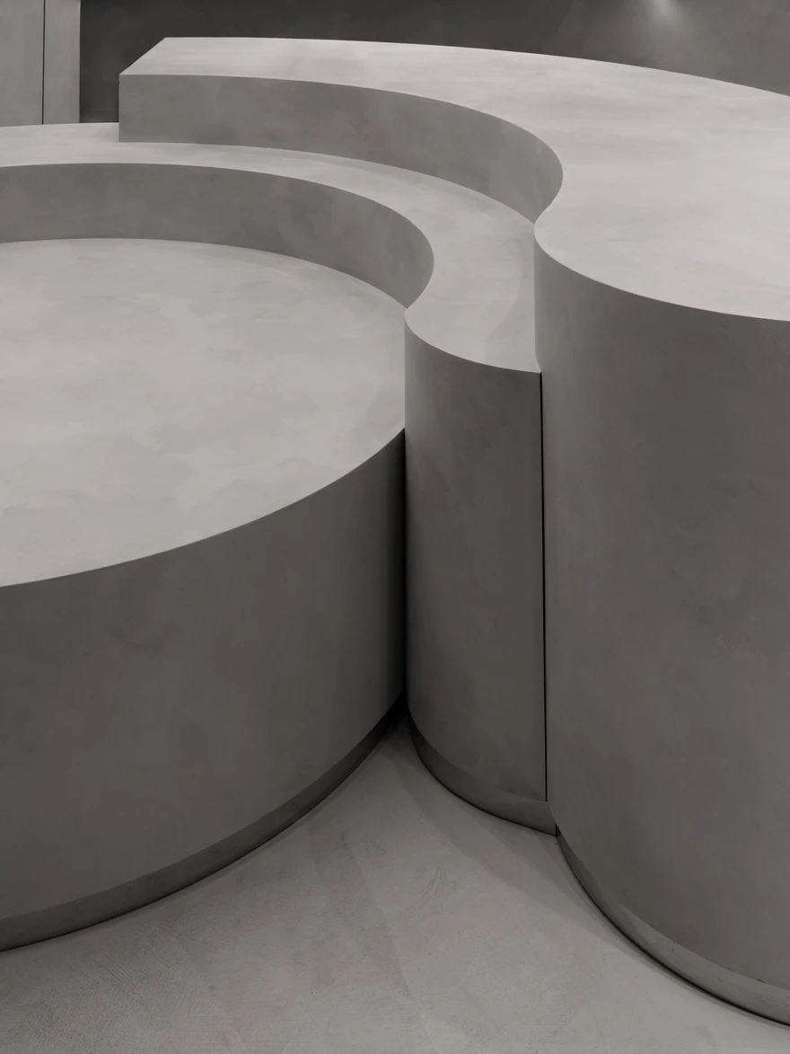 Скульптурный характер пространства подчеркивает сдержанная бетонная палитра — она была задана заказчиком изначально. Несмотря на кажущуюся простоту, она потребовала большого внимания: компании по чистовым отделочным материалам изготовили около 15 образцов серых оттенков, которые потом отправили заказчику, чтобы он выбрал подходящий тон. Вся мебель была разработана командой архитектора и изготовлена специально для этого проекта компанией Plotnikov Family. Полы доверили компании Polifloor, свет — «Центрсвет» и Arlight.
