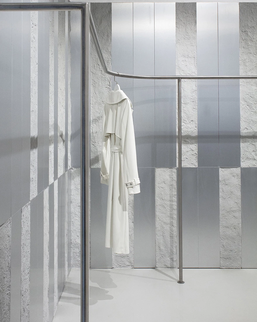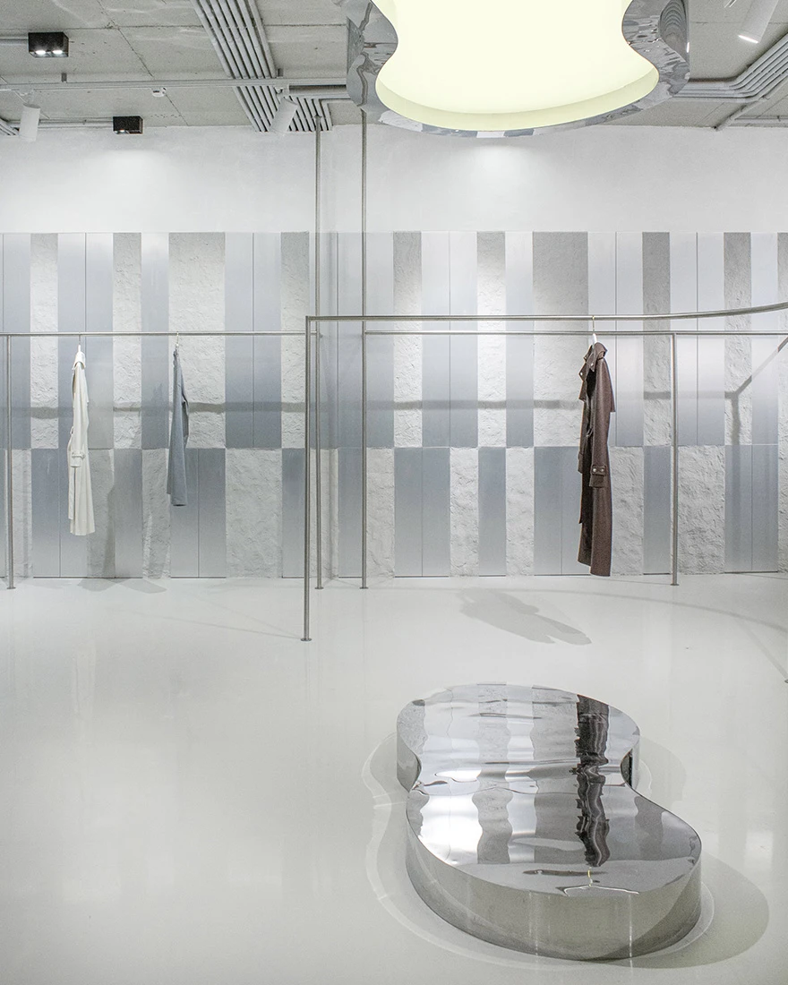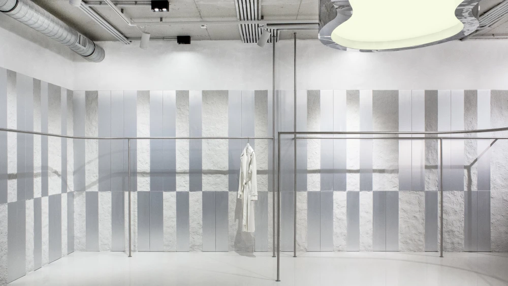 «Поскольку вся мебель — кастомное производство, с точки зрения формообразования мы можем выделить лайтбокс и каплеобразный подиум. Оба этих изделия формируют вокруг себя пространство и, безусловно, притягивают к себе внимание, — говорят авторы проекта. — Обшивка стен чередует панели из алюминиевого композита и фактурной штукатурки, а рейлы выполнены из нержавеющей стали. Прием со «штрихкодом» мы считаем особенно успешным. Эффектный фон для яркой одежды передает характер бренда».
