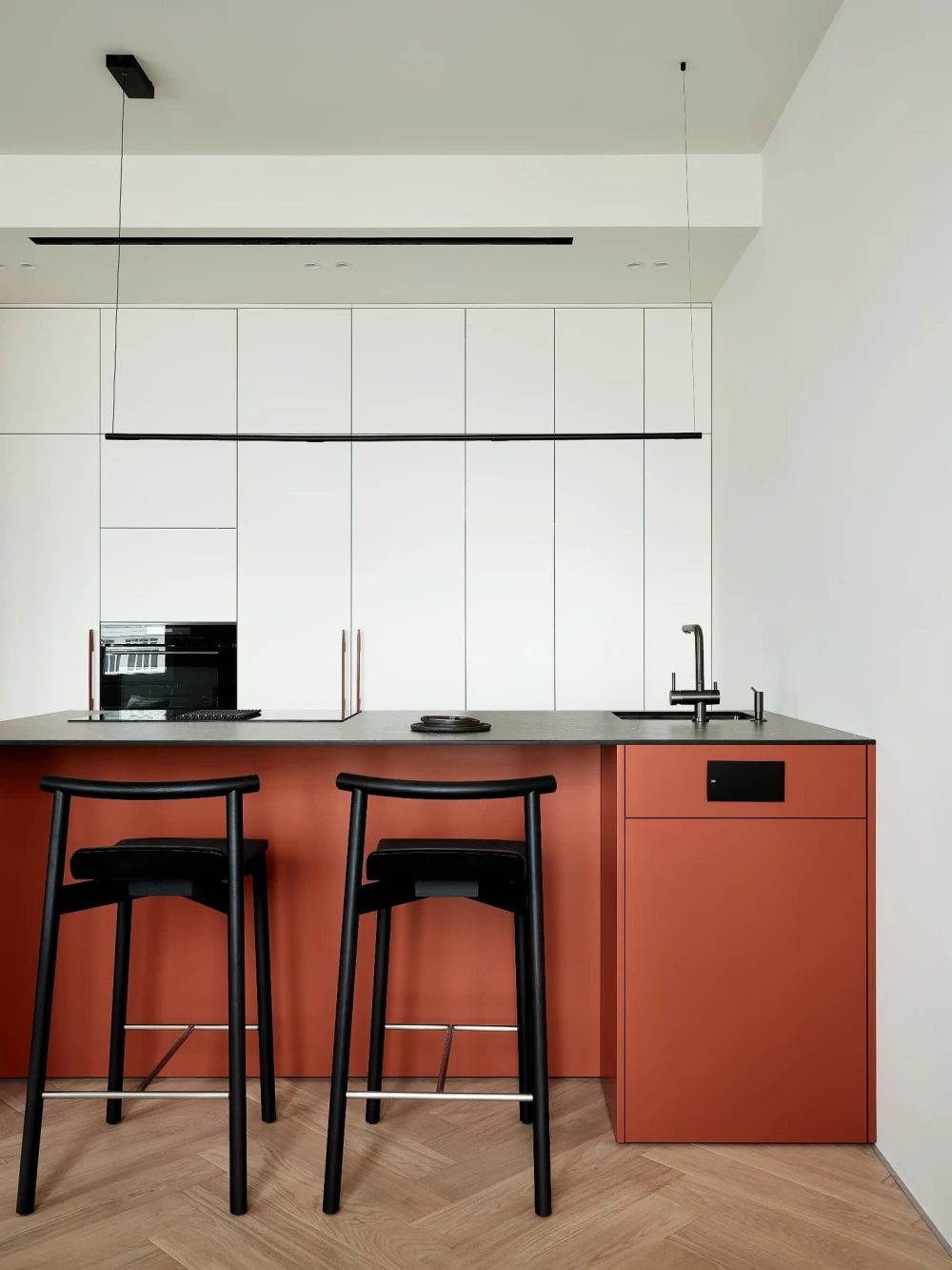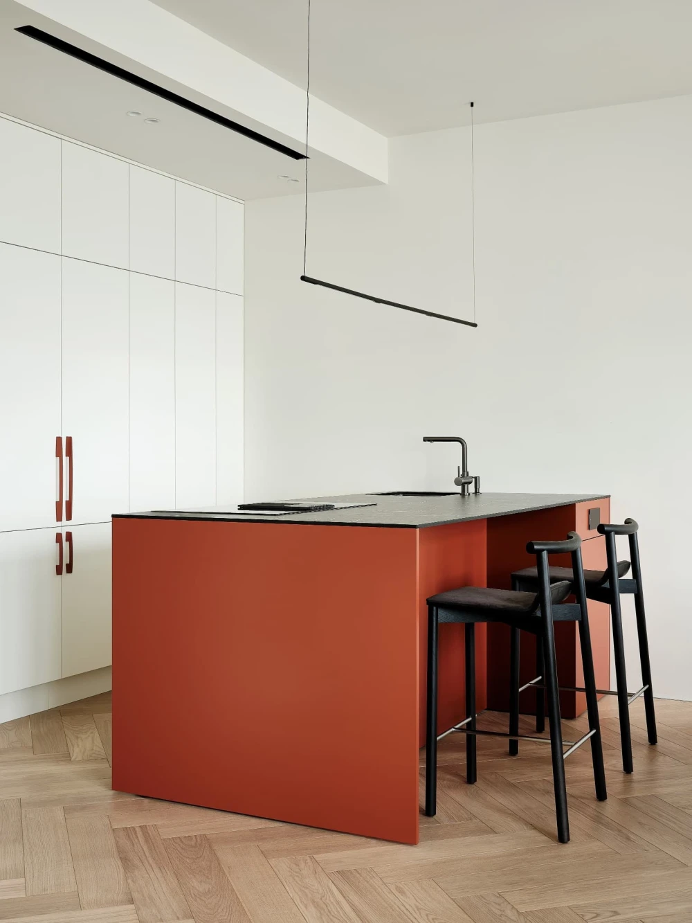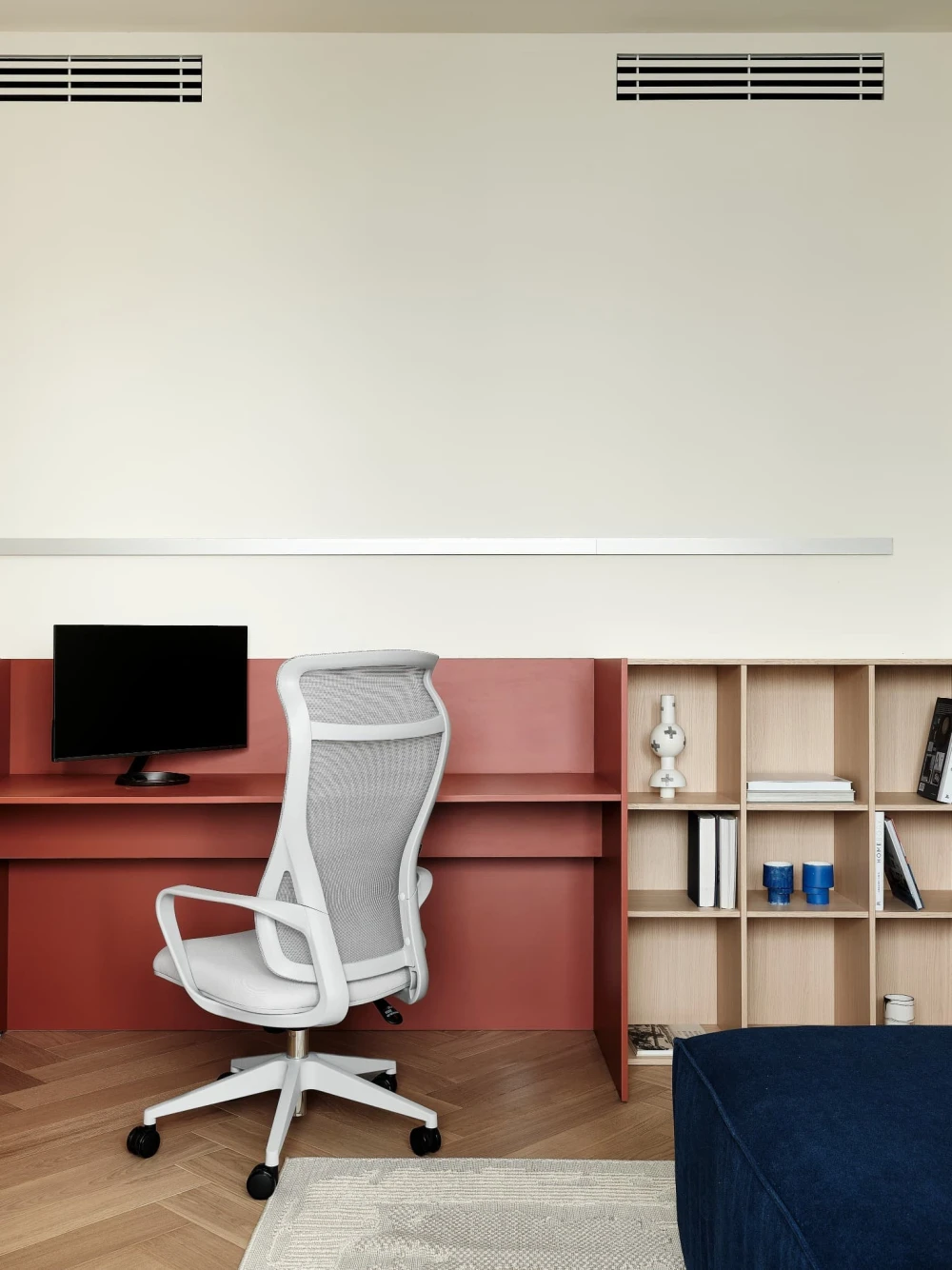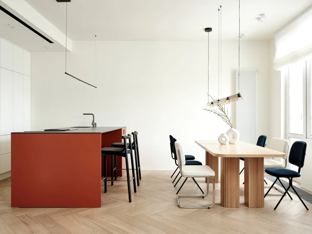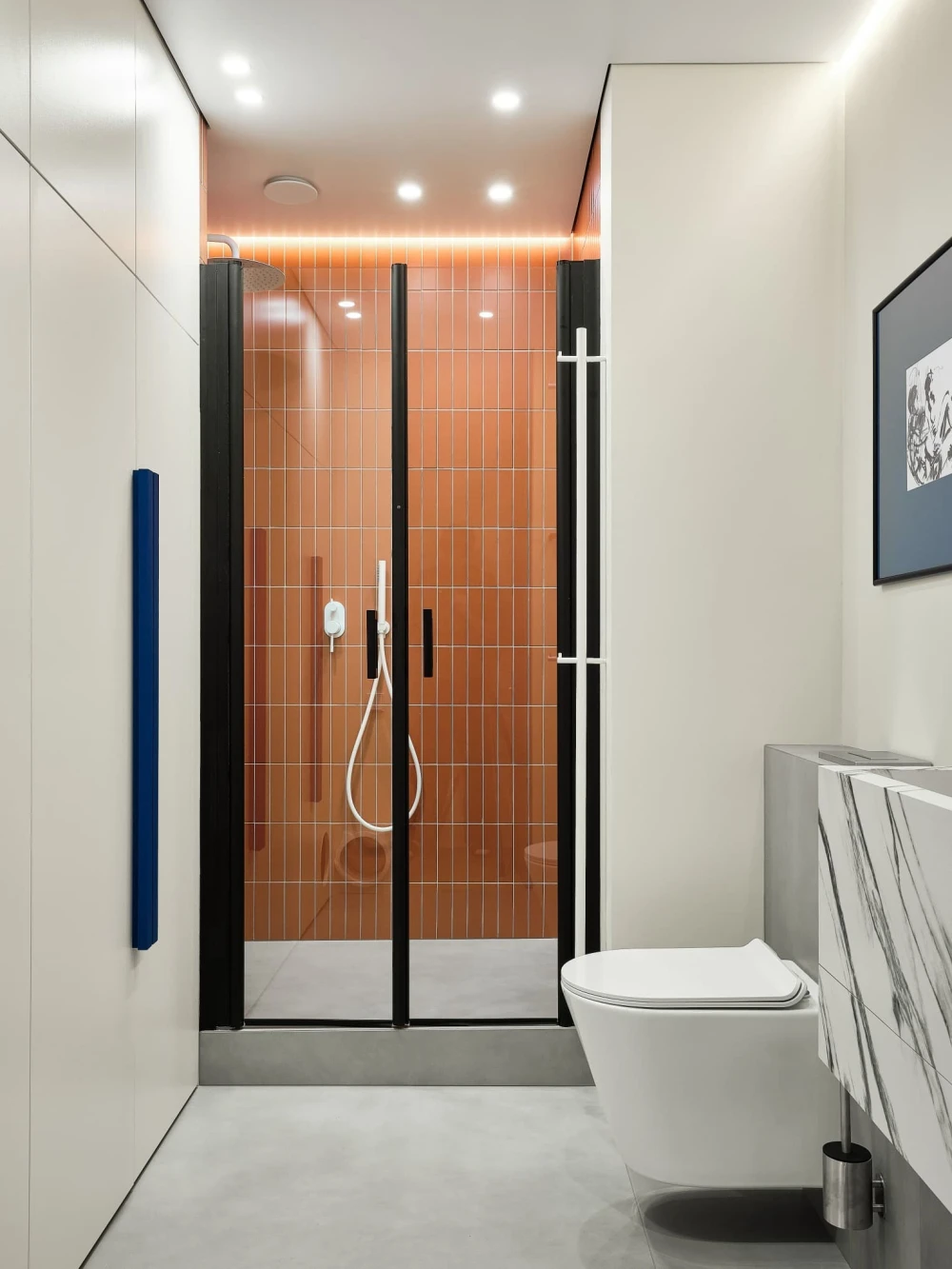 «В отделке использовали паркет «английская елочка» цвета натурального дуба и краску Baked Milk (топленое молоко) для стен. Это создало теплую нейтральную базу, на фоне которой акценты — ультрамариновый синий и сложный терракотовый — звучали выразительно. Мы назвали этот проект Sahara Sand («Песок Сахары») из-за палитры: теплые молочно-белые тона, выжженные терракотовые оттенки и синие акценты напоминают оазис в пустыне».
