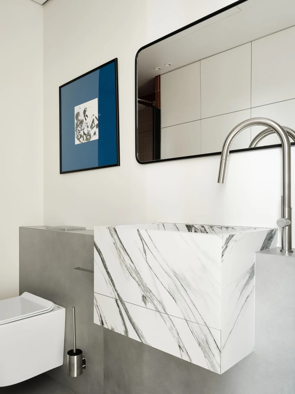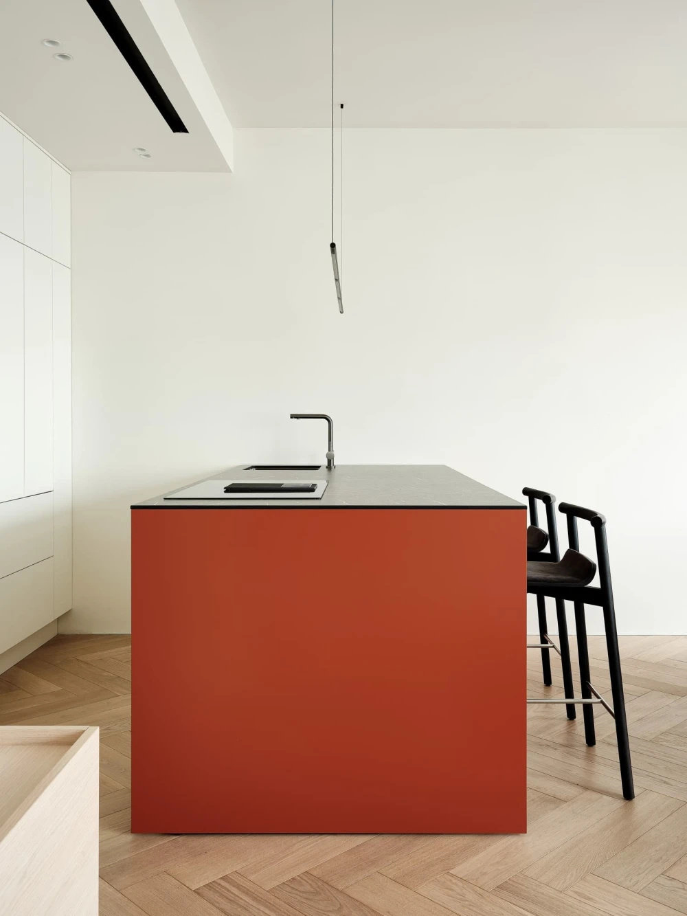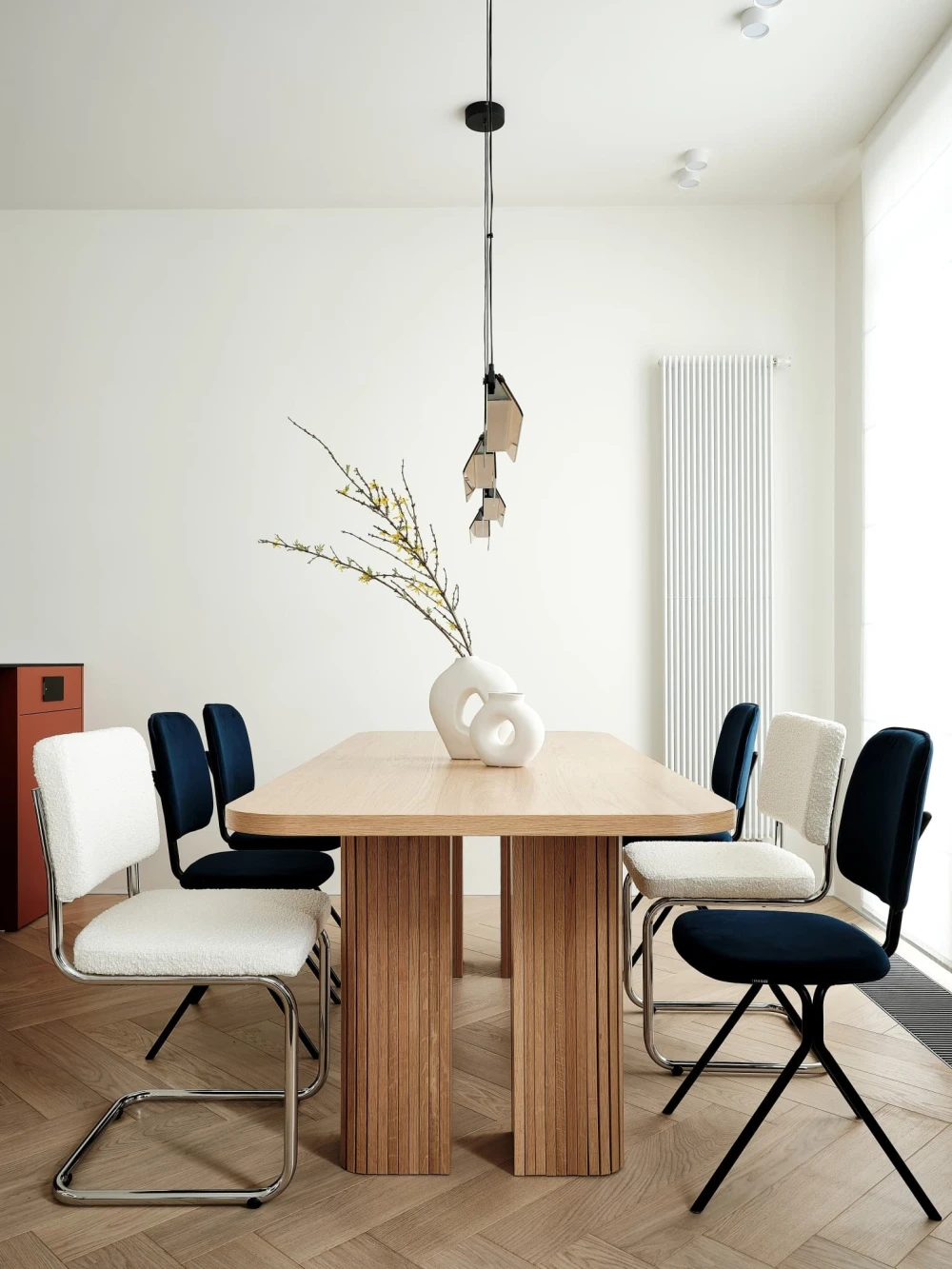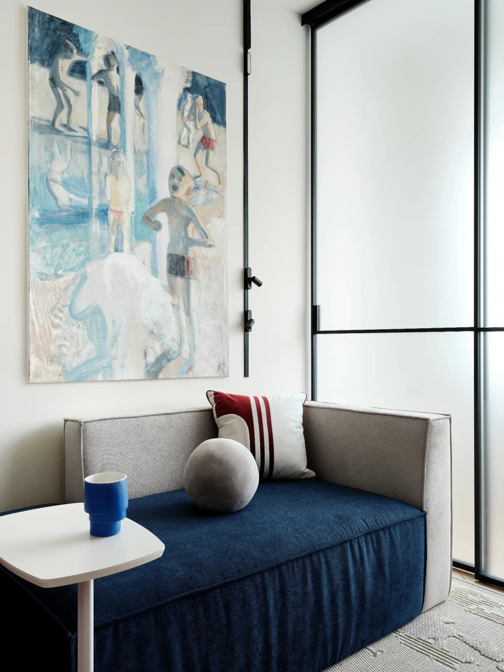 «В отделке использовали паркет «английская елочка» цвета натурального дуба и краску Baked Milk (топленое молоко) для стен. Это создало теплую нейтральную базу, на фоне которой акценты — ультрамариновый синий и сложный терракотовый — звучали выразительно. Мы назвали этот проект Sahara Sand («Песок Сахары») из-за палитры: теплые молочно-белые тона, выжженные терракотовые оттенки и синие акценты напоминают оазис в пустыне».