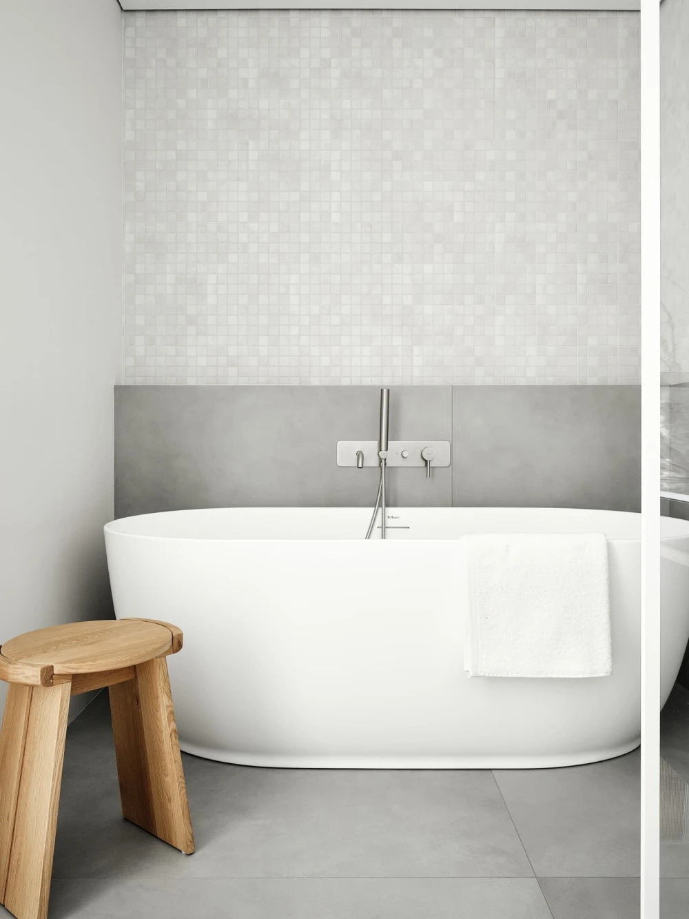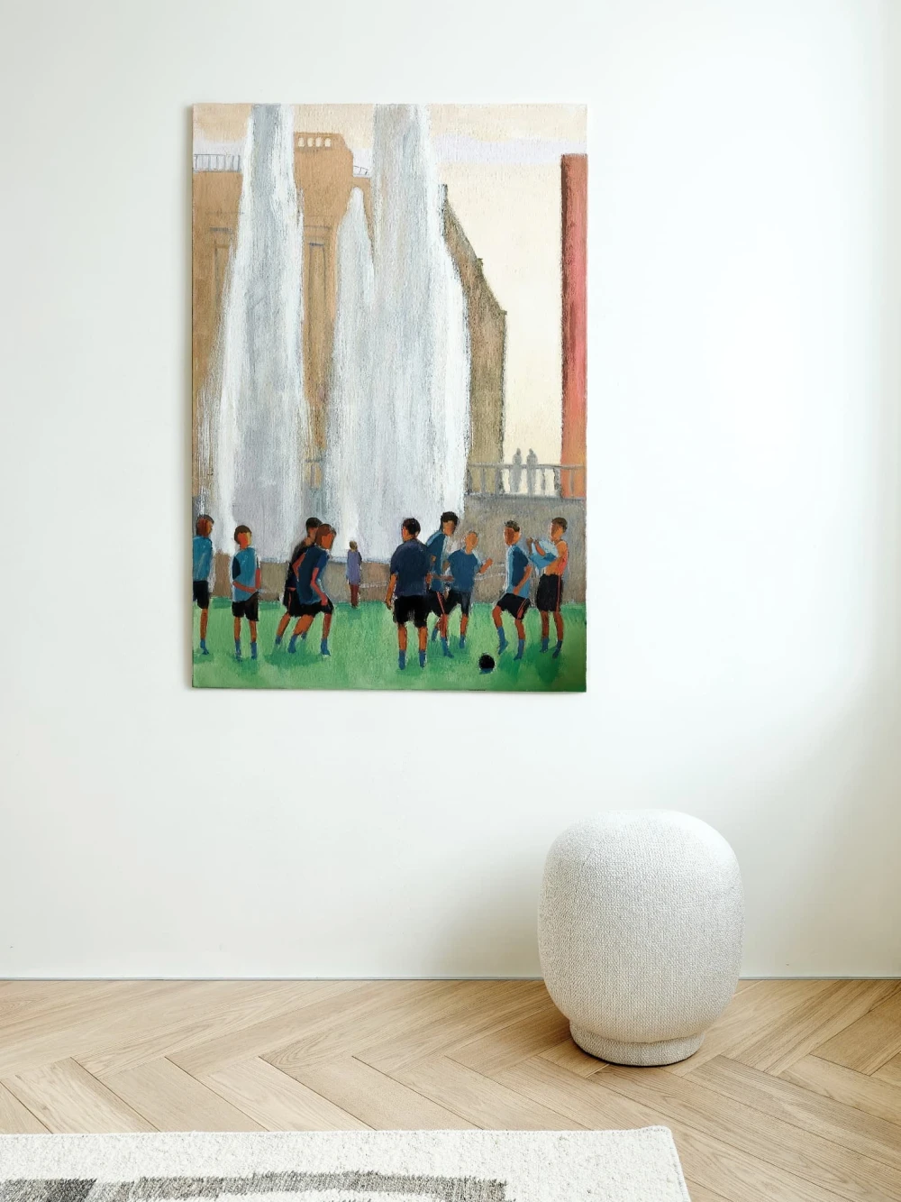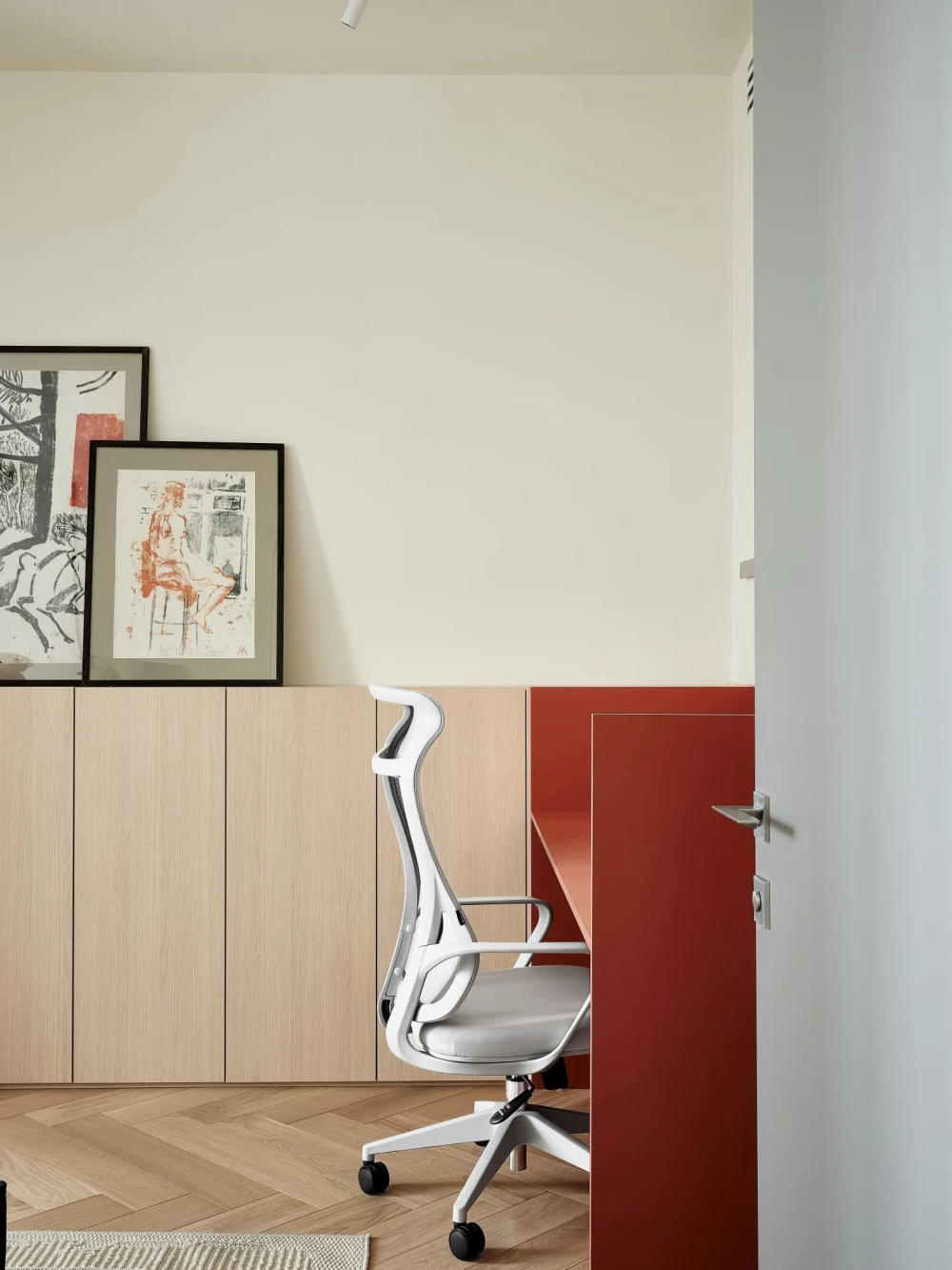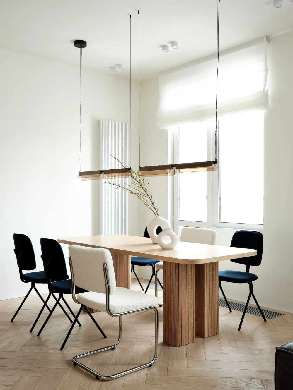 «В отделке использовали паркет «английская елочка» цвета натурального дуба и краску Baked Milk (топленое молоко) для стен. Это создало теплую нейтральную базу, на фоне которой акценты — ультрамариновый синий и сложный терракотовый — звучали выразительно. Мы назвали этот проект Sahara Sand («Песок Сахары») из-за палитры: теплые молочно-белые тона, выжженные терракотовые оттенки и синие акценты напоминают оазис в пустыне».