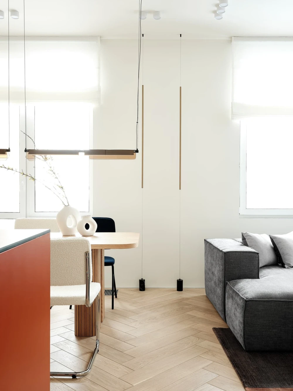 «Проект создавался для семьи из двух IT-специалистов с перспективой дальнейшего расширения. Заказчики много работают из дома, поэтому нам нужно было организовать два отдельных рабочих места, продумать вентиляцию и создать просторную кухню-гостиную с обеденной зоной на 6-10 человек — для еженедельных встреч с друзьями и настольных игр, под которые предстояло предусмотреть отдельные места хранения».