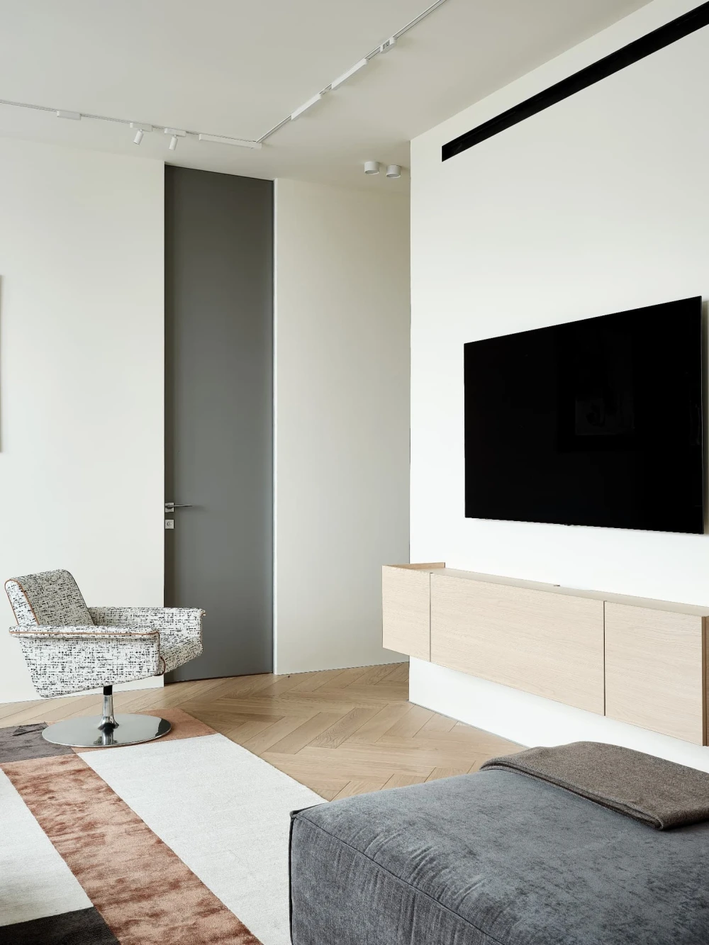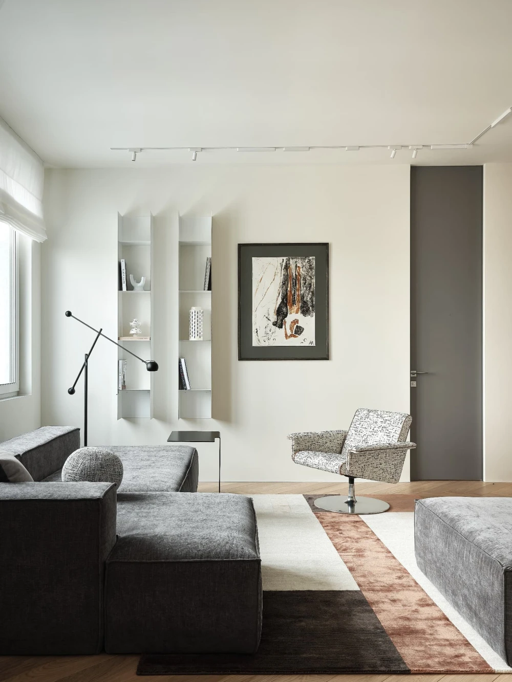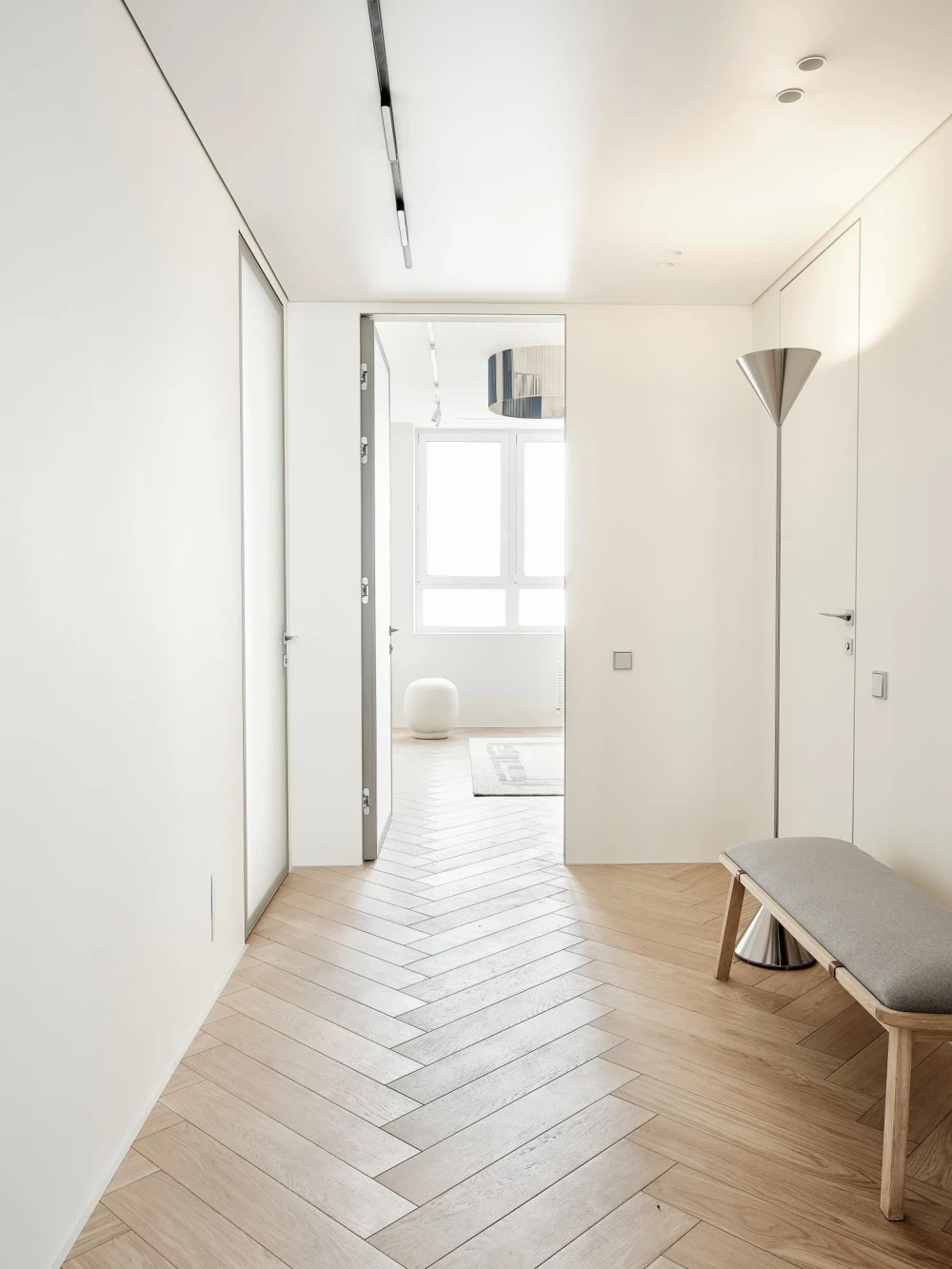 «При первом посещении объекта мы сразу отметили высокий этаж, панорамные виды на центр города и обилие света и воздуха, — рассказывает дизайнер. — Планировка квартиры от застройщика — так называемая «распашонка»: с одной стороны открывается оживленная улица, с другой стороны — двор. Это позволило легко разделить пространство на приватный и гостевой блоки, но потребовалась дополнительная работа над узкой прихожей, маленьким гостевым санузлом и сложной системой коридоров. Подарком от застройщика стала большая кладовая-гардеробная, площадь и периметр которой остались практически неизменными».
