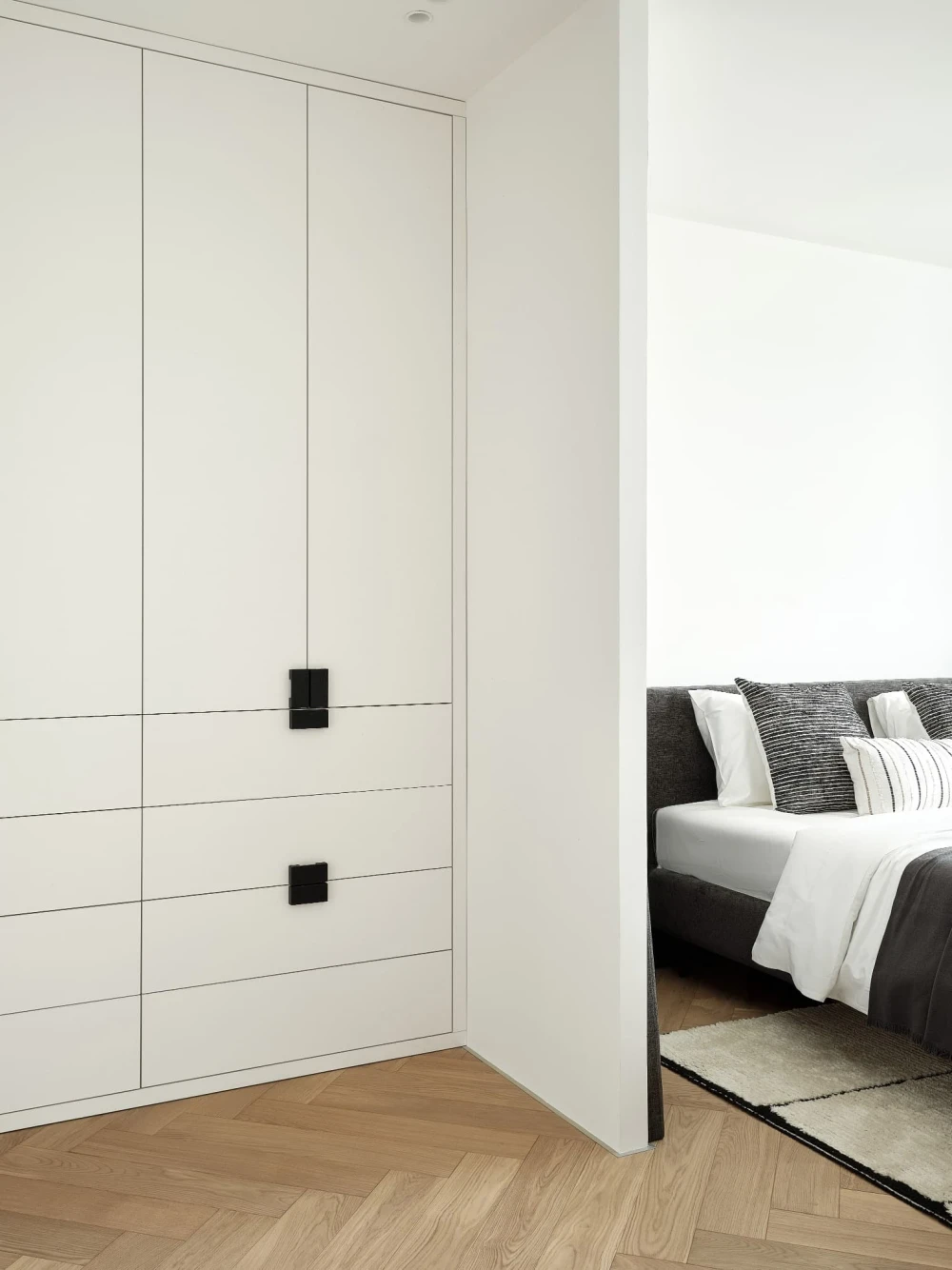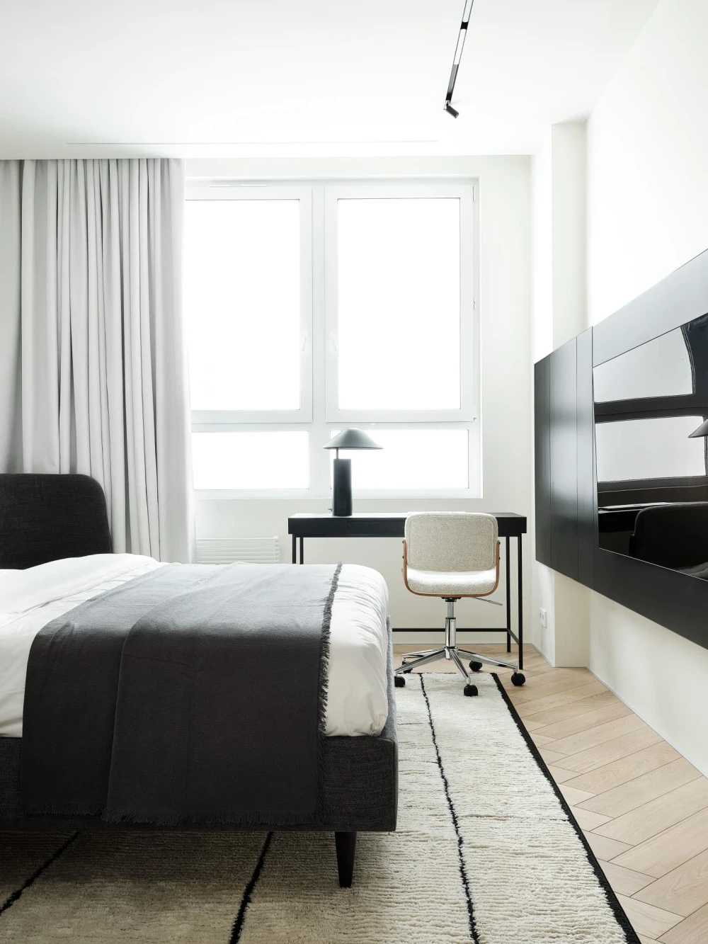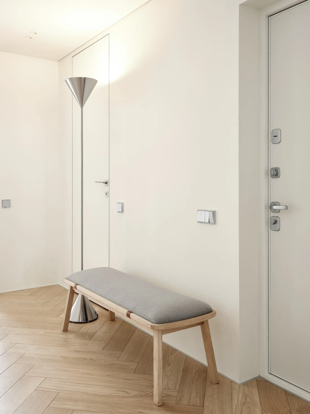 «При первом посещении объекта мы сразу отметили высокий этаж, панорамные виды на центр города и обилие света и воздуха, — рассказывает дизайнер. — Планировка квартиры от застройщика — так называемая «распашонка»: с одной стороны открывается оживленная улица, с другой стороны — двор. Это позволило легко разделить пространство на приватный и гостевой блоки, но потребовалась дополнительная работа над узкой прихожей, маленьким гостевым санузлом и сложной системой коридоров. Подарком от застройщика стала большая кладовая-гардеробная, площадь и периметр которой остались практически неизменными».