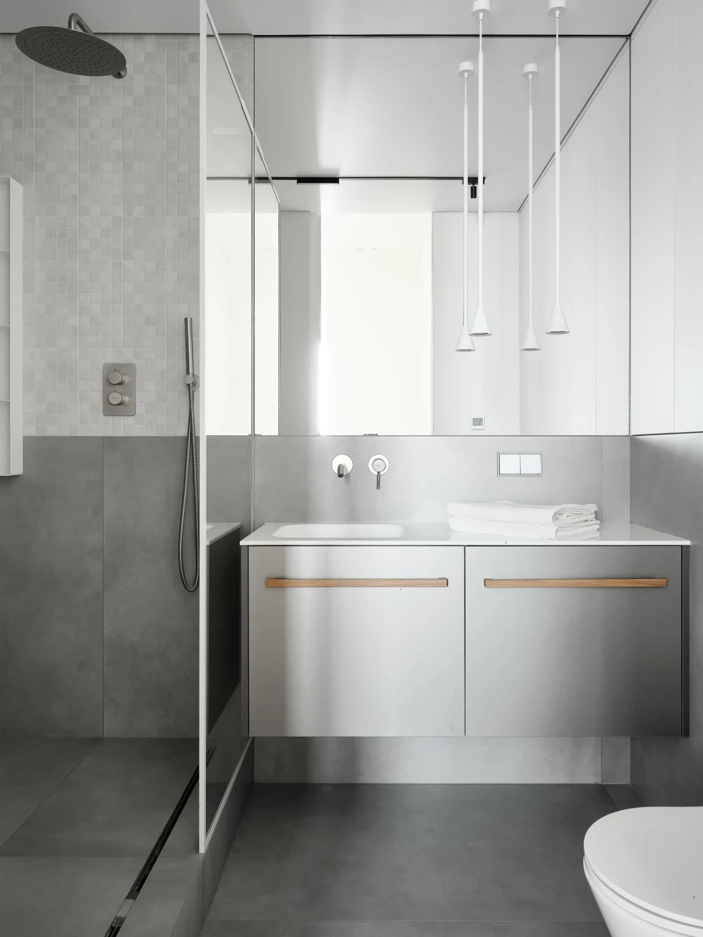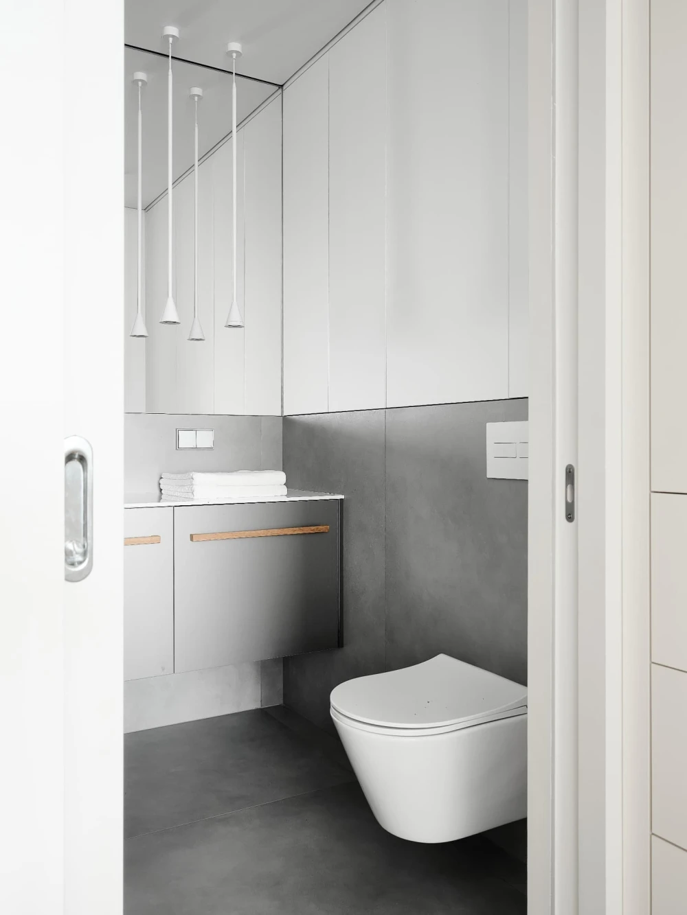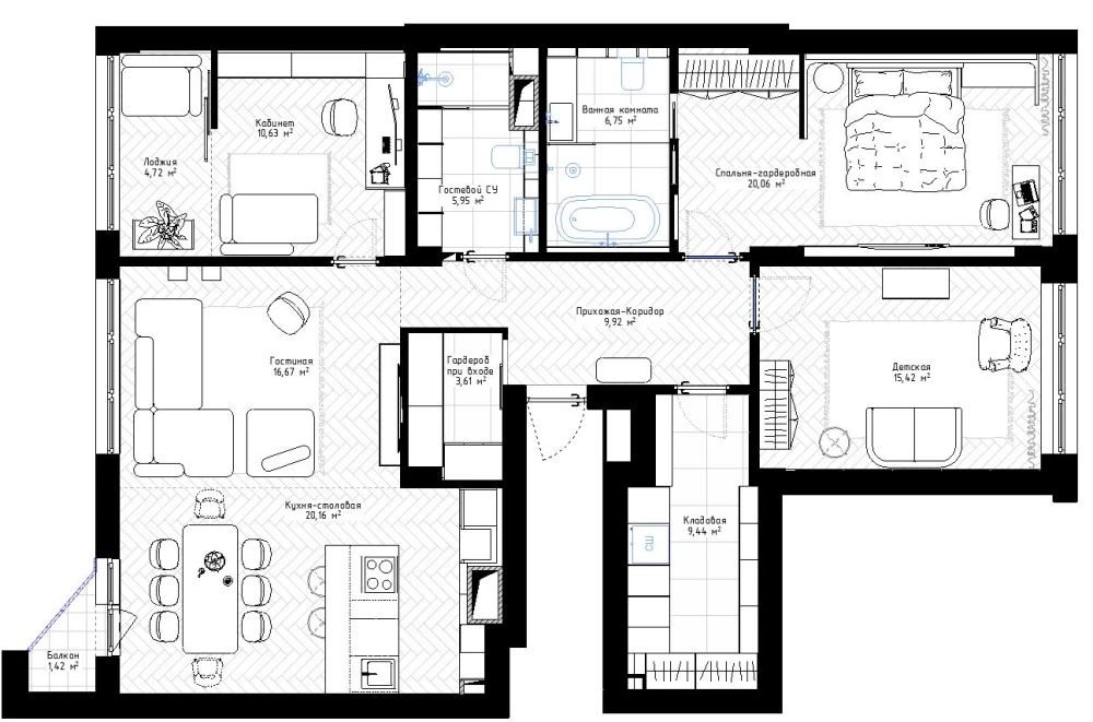 «Мы переосмыслили зону прихожей: добавили гардероб при входе и скорректировали границы санузла, чтобы получить более ровную и правильную транзитную зону к спальням, не пересекающуюся с блоком прихожей. В гостевой блоке, слева от входа, находится просторная кухня-гостиная и та самая обеденная группа для сбора гостей, шумных застолий и раундов настольных игр. Второе помещение в этом блоке — рабочий кабинет. В нем мы старались предусмотреть разные сценарии: как для работы, так и для отдыха в течение дня. К этим помещениям примыкает гостевой санузел, вход в который осуществляется через коридор. Справа от входа расположен мастер-блок со спальней, гардеробной и входом в ванную комнату, детская комната, а также кладовая-постирочная».