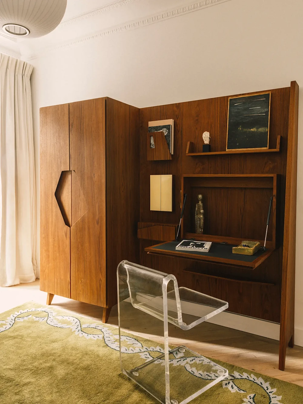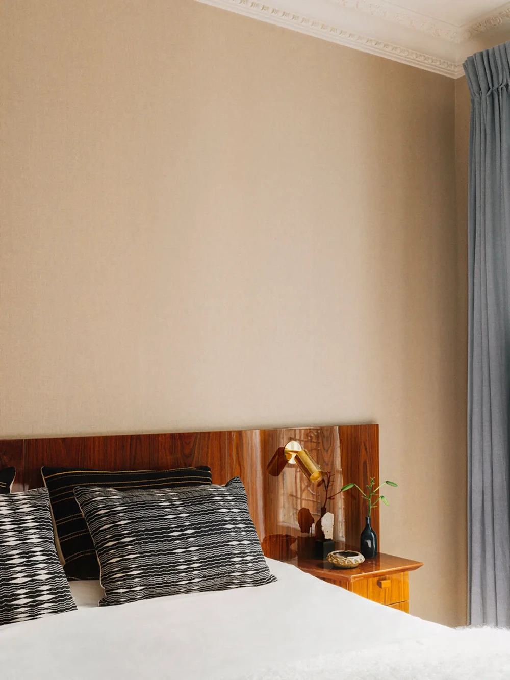 Любовь супругов к моде и путешествиям отражена во всем доме — это проявляется в итальянских мотивах, отсылающих к вилле Планчарт Джо Понти (Gio Ponti), и в изготовленных на заказ предметах — обеденном и письменном столах, изголовье кровати. Философия Понти была для RMGB руководящей силой, которая уравновешивает смелые формы и тщательно продуманные детали. «Мы были вдохновлены его подходом, — говорит Ришманн. — Он сочетает в себе элегантность и современность, что направило нас на выбор форм и текстур для некоторых предметов мебели, изготовленных на заказ. Каждый элемент был задуман так, чтобы быть удобным, функциональным и простым в использовании, не уступая при этом в элегантности».