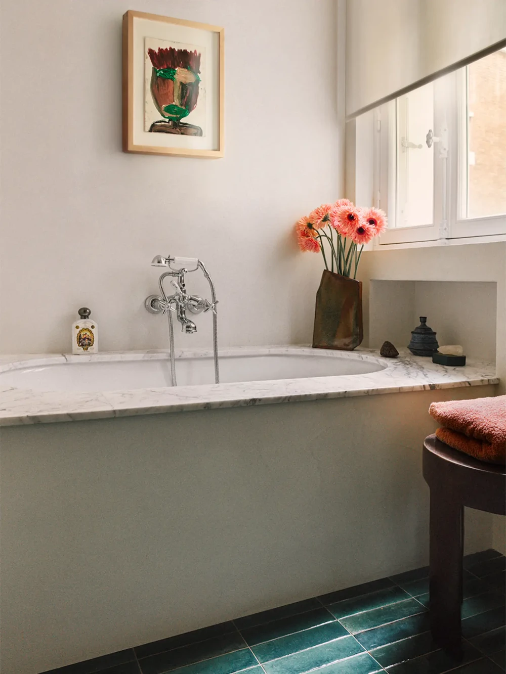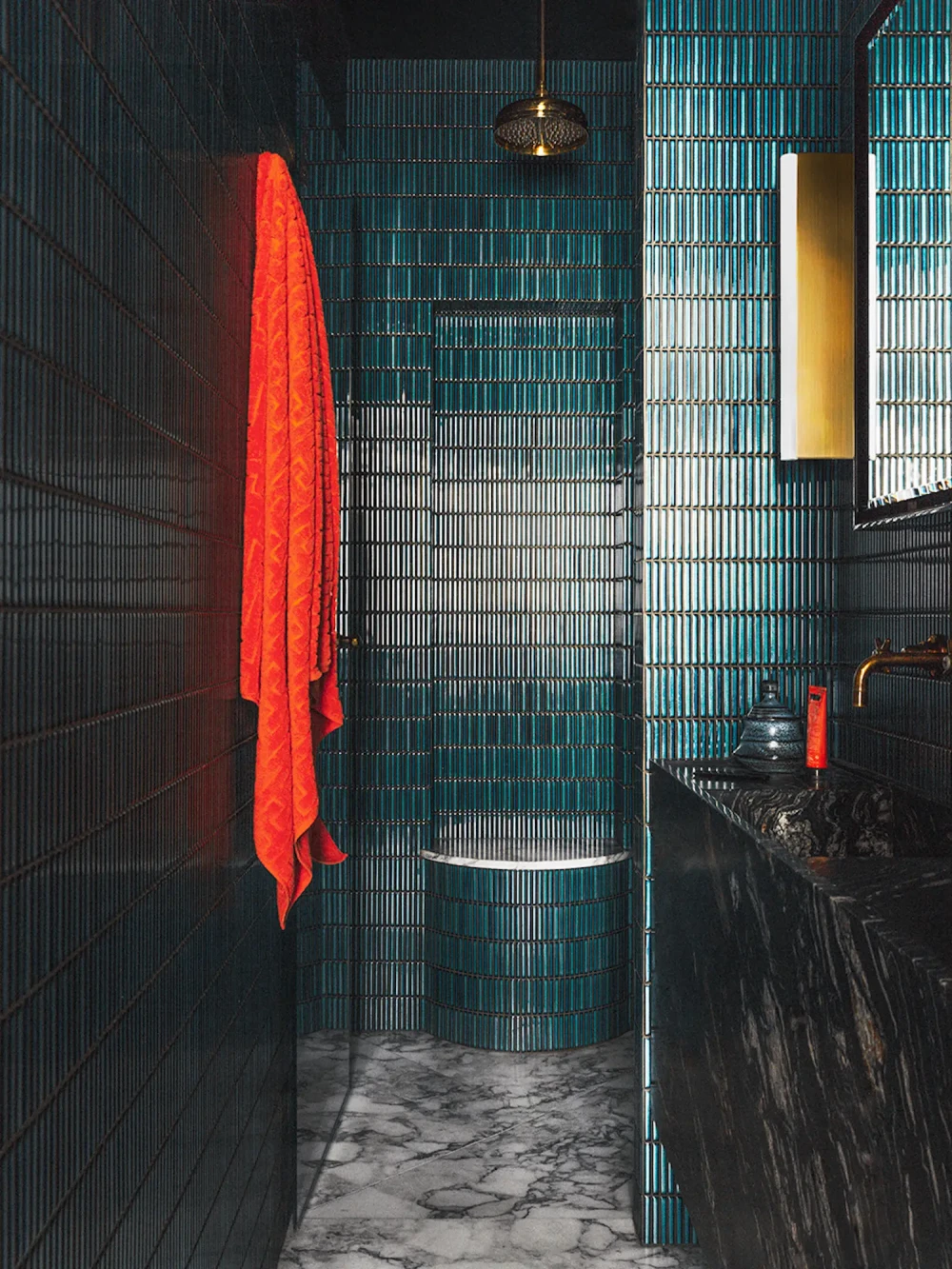 Встроенный шкаф скрывает видеопроектор, а барная стойка объединяет винный шкаф и мобильную тележку для коктейлей — эти решения гармонично вписаны в интерьер и в то же время остаются на втором плане в повседневной жизни. В кабинете тиковая система хранения занимает всю стену, а столовую украшает скульптурный мраморный стол для семейных собраний. Отделка ванной комнаты построена на контрастах: гладкие цементные стены сочетаются с глянцевой терракотовой плиткой, а свет подчеркивает тактильную глубину материалов. Пространство не стремится к строгой формальности, оставаясь живым и адаптивным: его настроение меняется в зависимости от времени суток, людей и их деятельности.