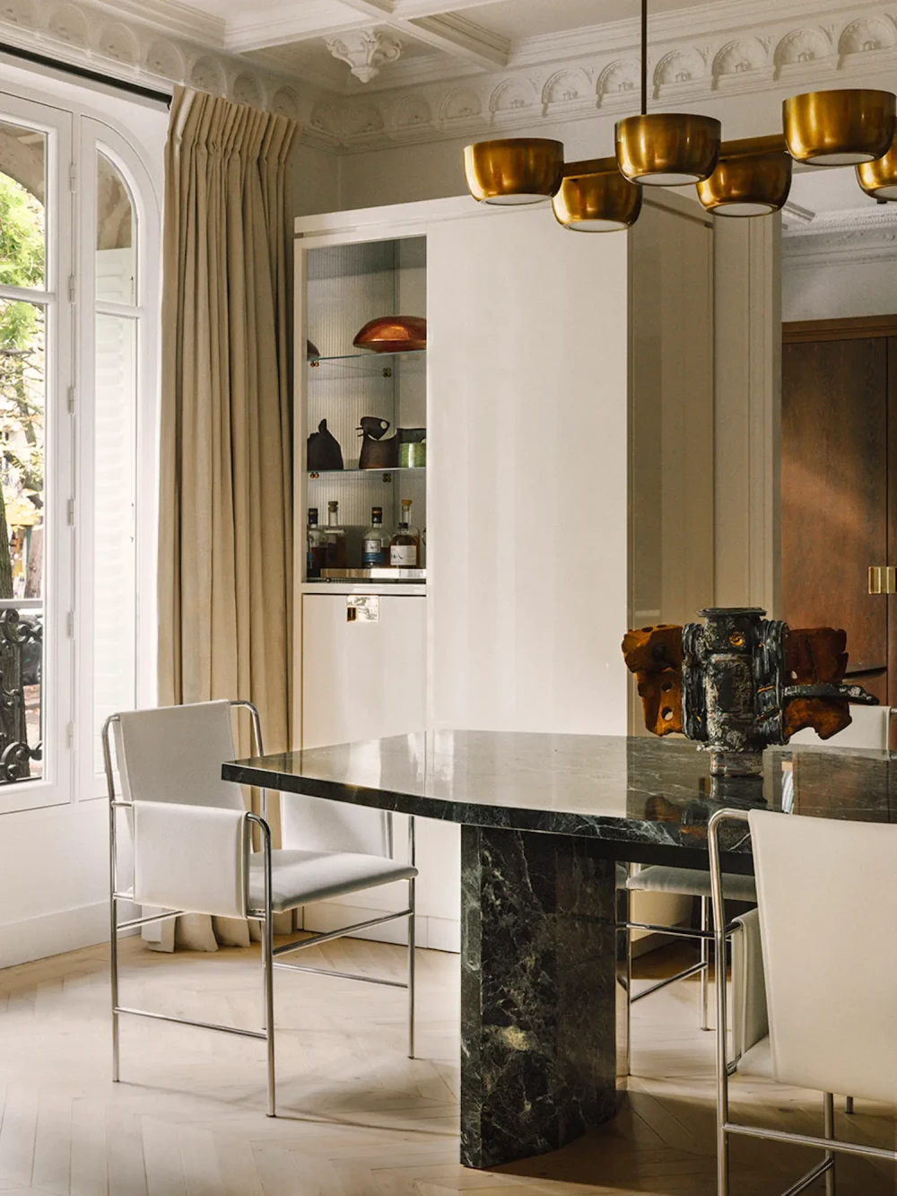 Оригинальные паркетные полы, лепнина и камины были тщательно отреставрированы. В результате получился многослойный интерьер, который выглядит одновременно основательным и динамичным, признает свое архитектурное прошлое и в то же время отвечает постоянно меняющимся аспектам жизни молодой семьи. В каждой комнате материалы взаимодействуют с архитектурой способами, которые являются совершенно уникальными. «Мы хотели установить диалог между искусством и архитектурой с помощью материалов, света, пропорций и ремесленных техник», — говорит Жибер. Лавовый камень, патинированная сталь и дуб соседствуют с мохеровым бархатом, глазурованной терракотой и хлопковыми обоями. Выбор каждого материала является продуманным ответом на то, как должна выглядеть и функционировать комната.