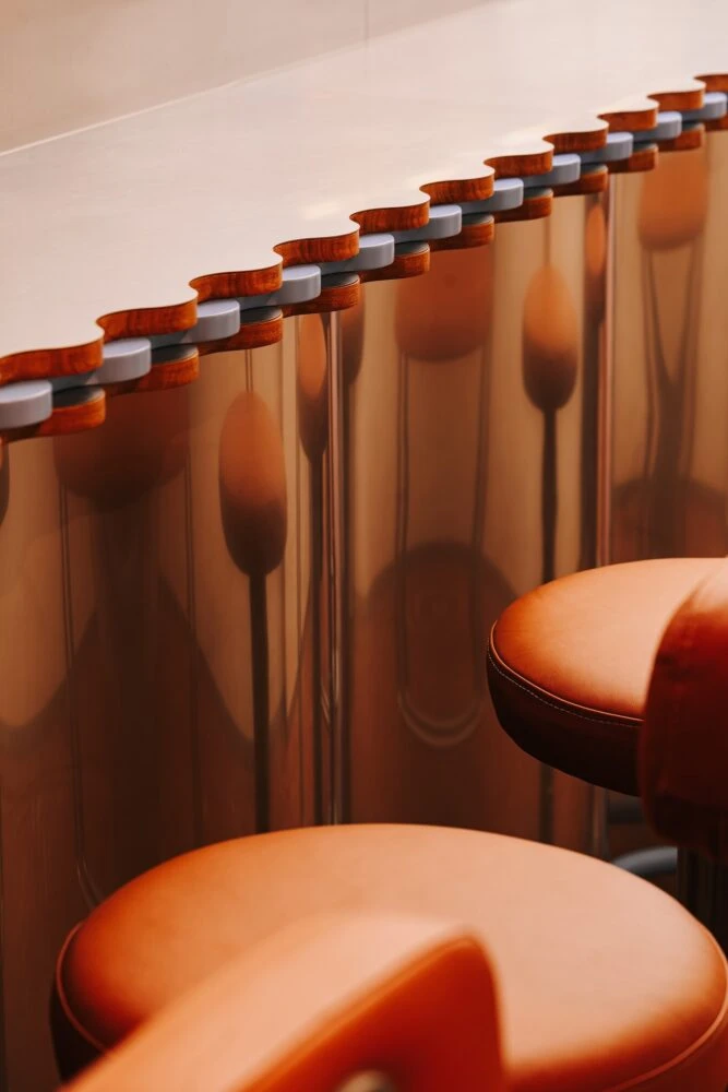 Основным источником вдохновения для дизайнеров стала техника приготовления smash, когда шарик фарша прижимают к горячей поверхности для максимального контакта с ней, достигая карамелизации и глубины вкуса. В интерьере этот процесс «переведен» в архитектуру: текучие линии и плавные формы напоминают о трансформации продукта, карамельные оттенки отсылают к аппетитной корочке, а элементы из металла служат аллюзией на кухонные аксессуары.