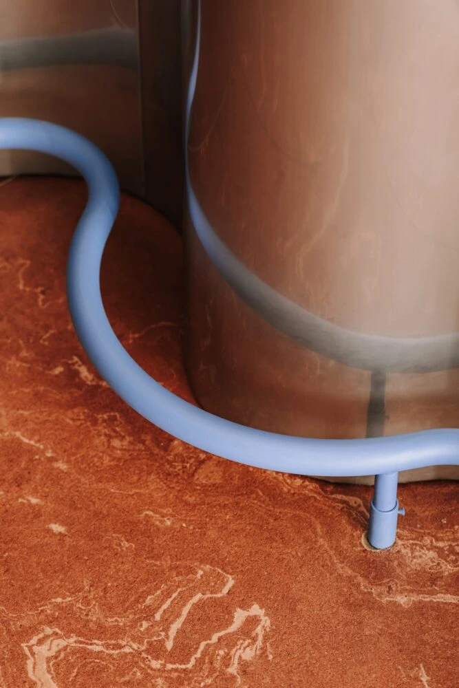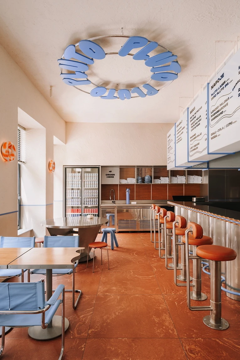 Ядром пространства выступает открытый гриль, обрамленный металлической конструкцией в духе уличного фудкорта. Перед ним — вытянутая барная стойка, превращающая процесс приготовления в шоу для гостей. Трехслойная волнистая столешница — это отсылка к многослойности бургера. Важную роль в проекте играет освещение: стеклянные блоки неправильной формы рассеивают свет, создавая легкий эффект тумана, напоминающего горячий пар. Теплая карамельная палитра разбавлена точечными акцентами в небесно-голубом — фирменном цвете Pluto.