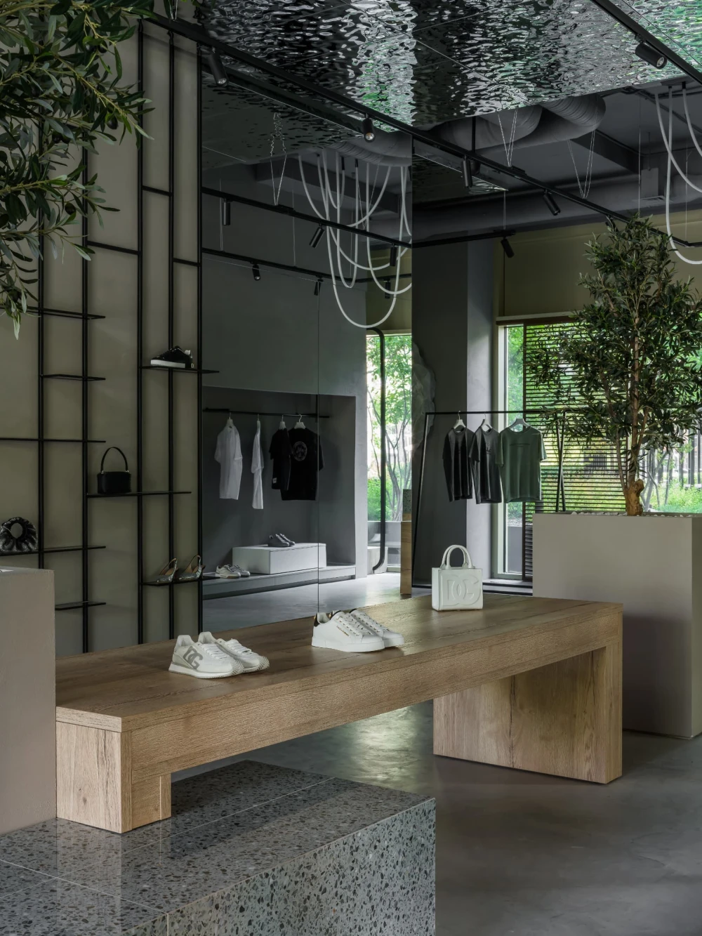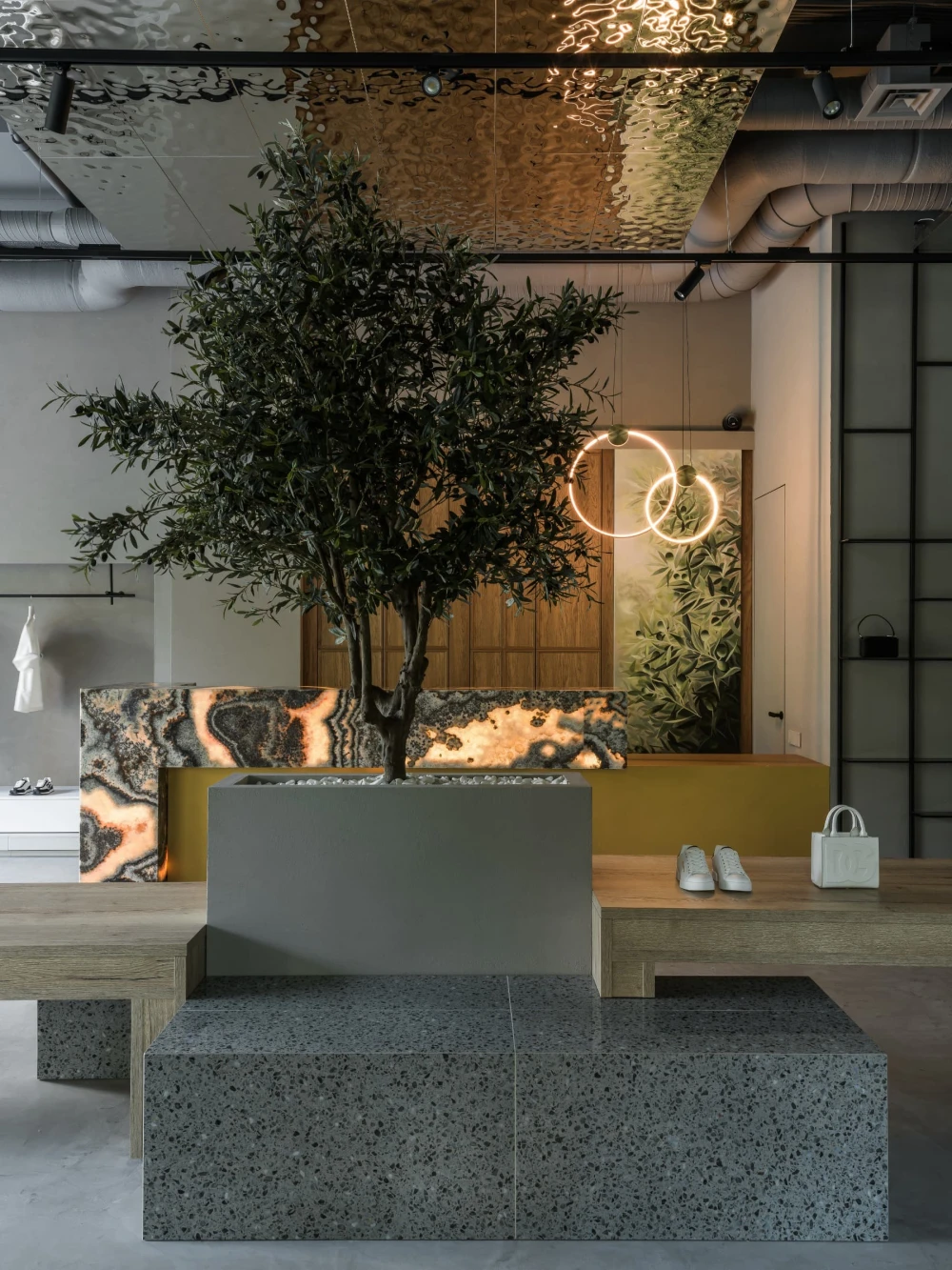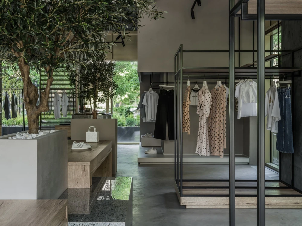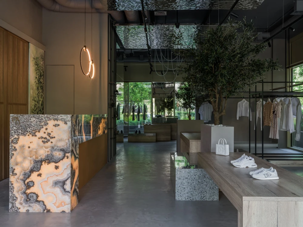«Центральная часть бутика — настоящий манифест архитектурной поэзии. Оливковые деревья, установленные прямо в торговом зале, отсылают к средиземноморской природе, а тумбы с керамогранитом под терраццо приглашают присесть и зарядить телефон. Дополняет композицию декоративная скала — внушительный арт-объект, который разделяет пространство торгового зала от зоны ожидания и, конечно, привлекает внимание всех посетителей».