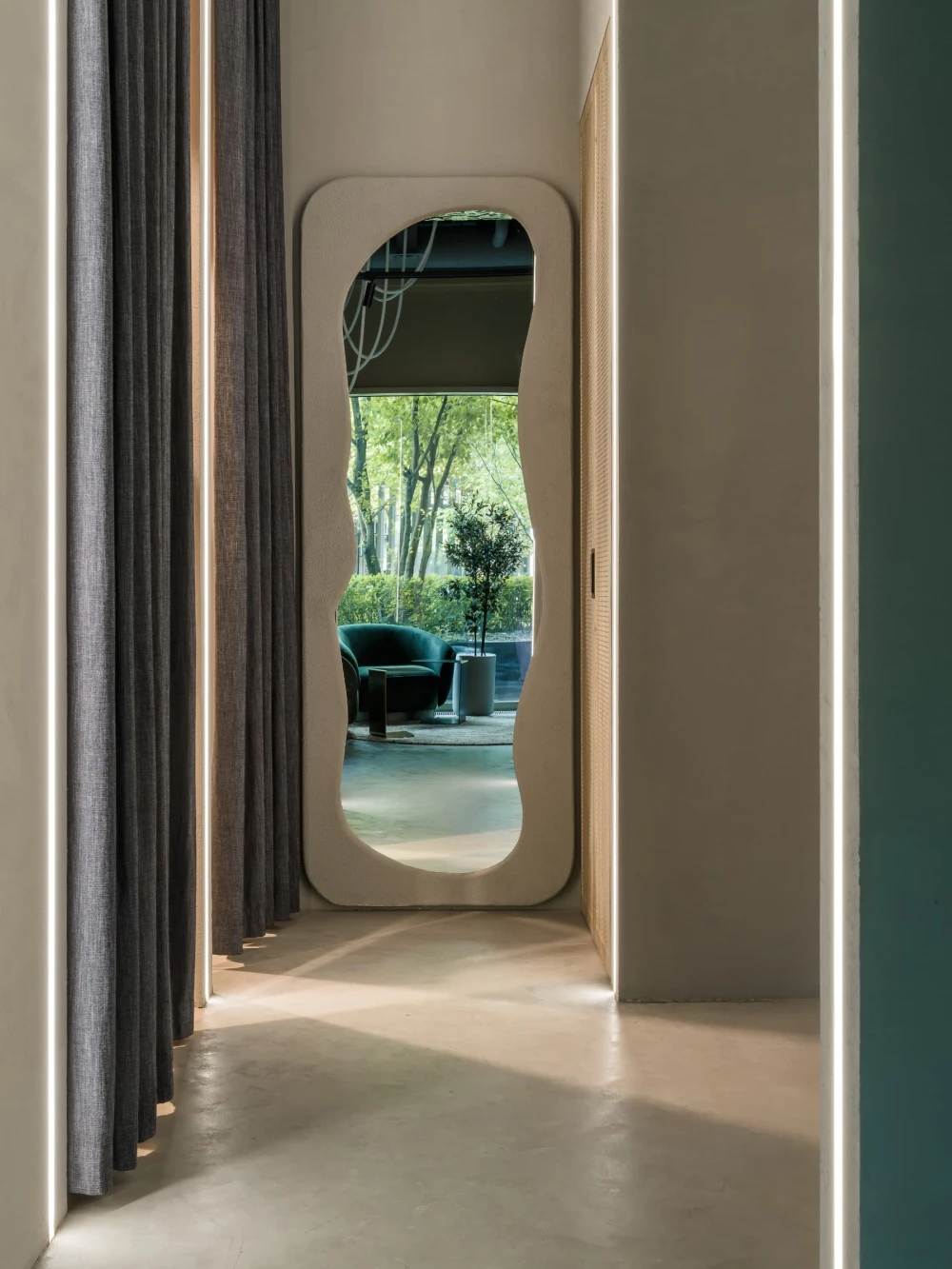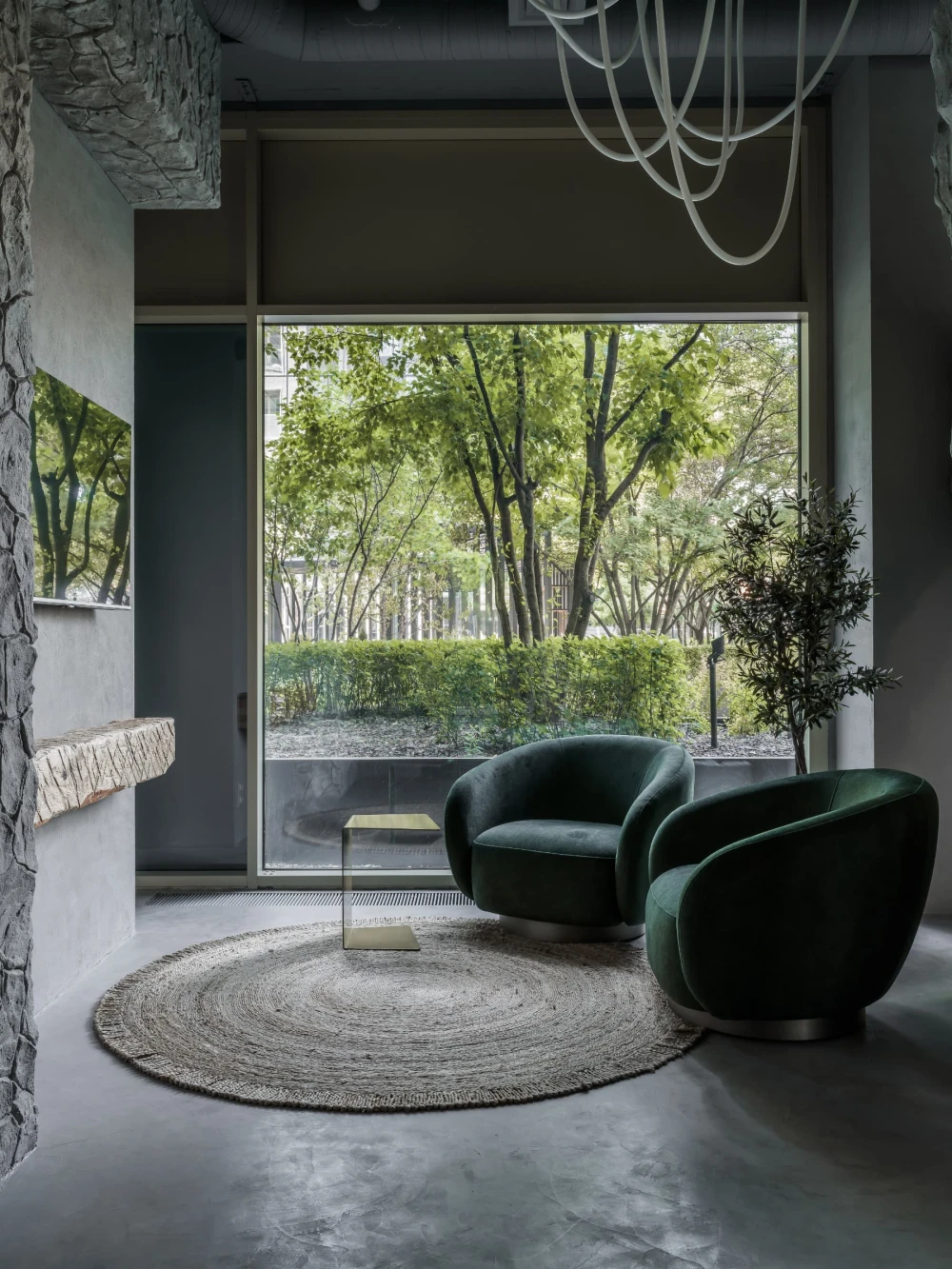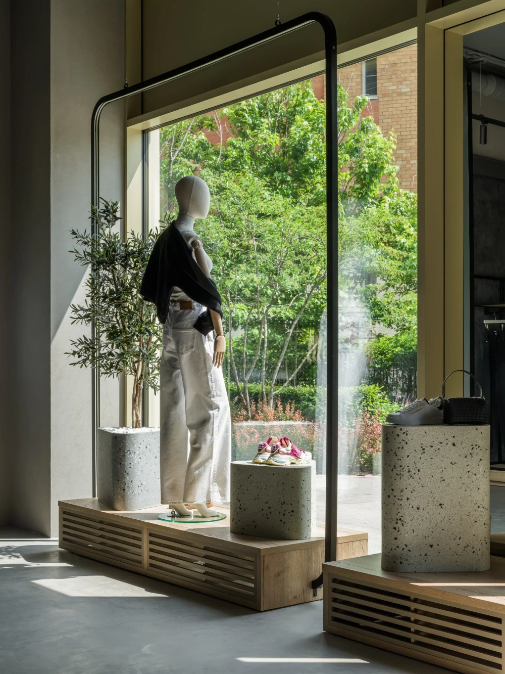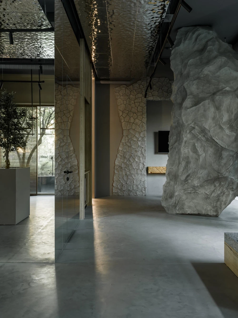 «Центральная часть бутика — настоящий манифест архитектурной поэзии. Оливковые деревья, установленные прямо в торговом зале, отсылают к средиземноморской природе, а тумбы с керамогранитом под терраццо приглашают присесть и зарядить телефон. Дополняет композицию декоративная скала — внушительный арт-объект, который разделяет пространство торгового зала от зоны ожидания и, конечно, привлекает внимание всех посетителей».