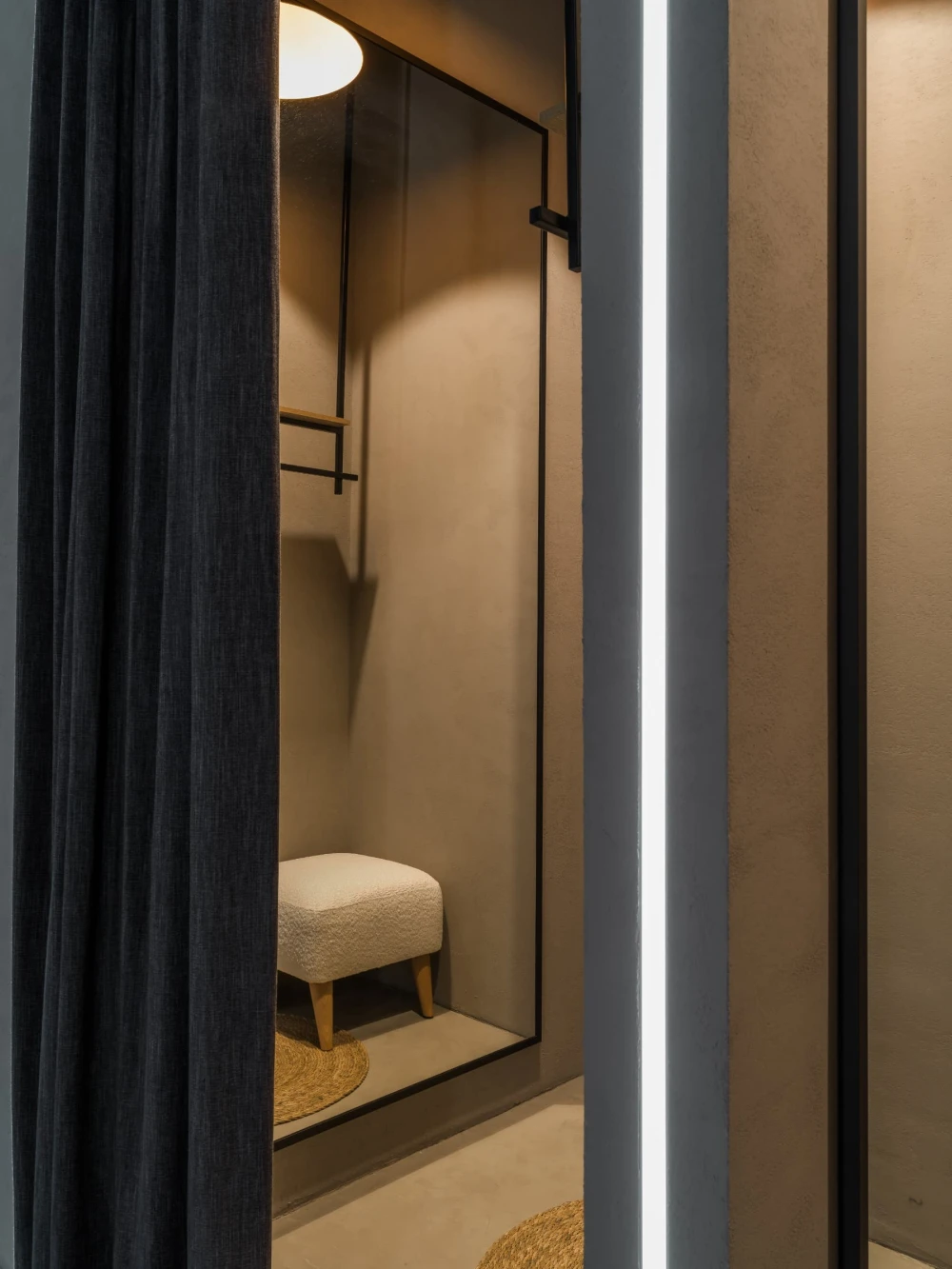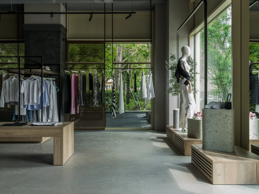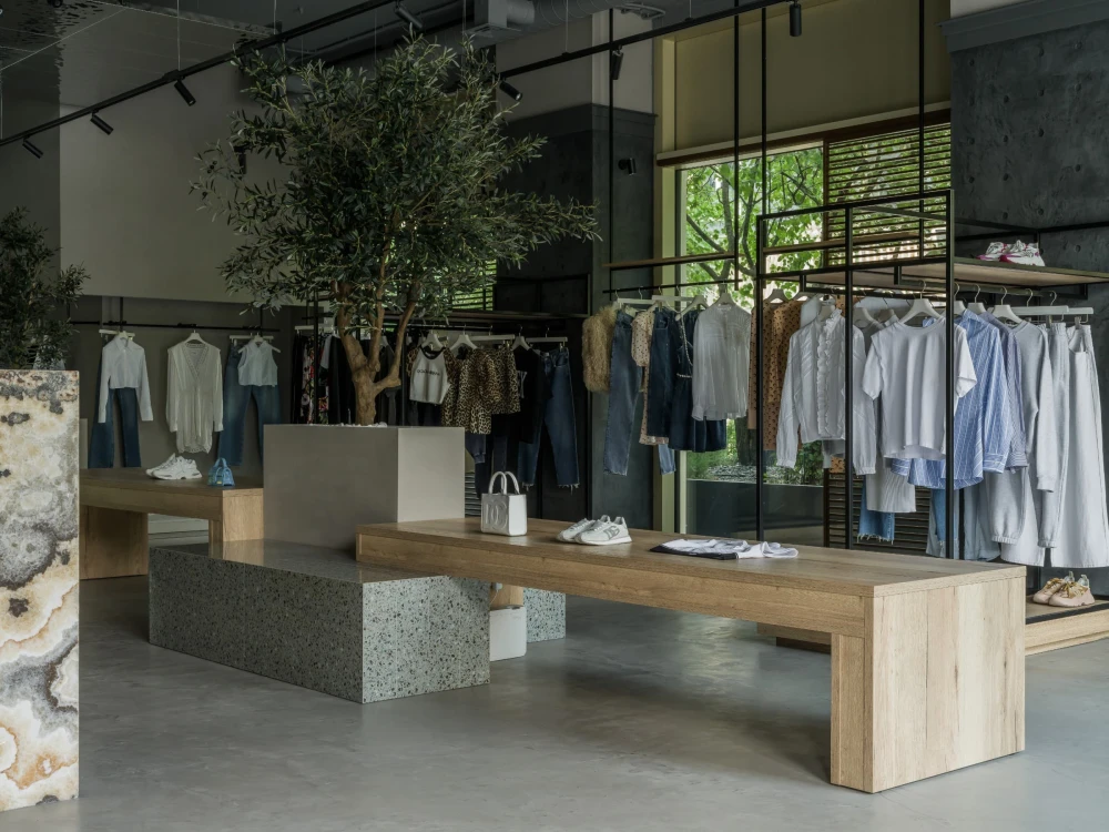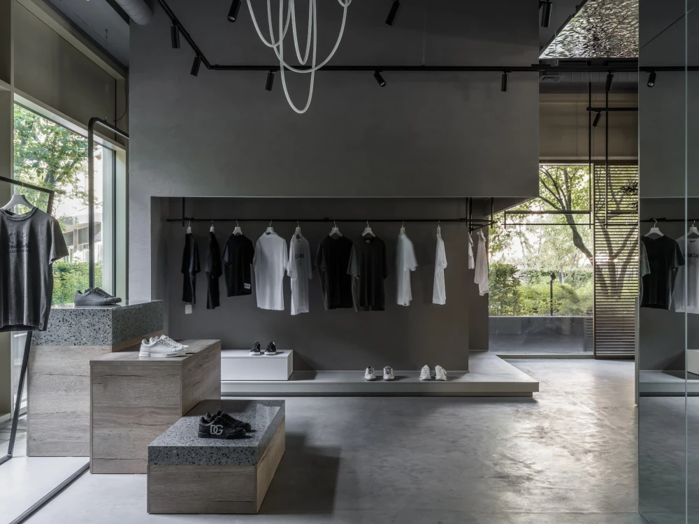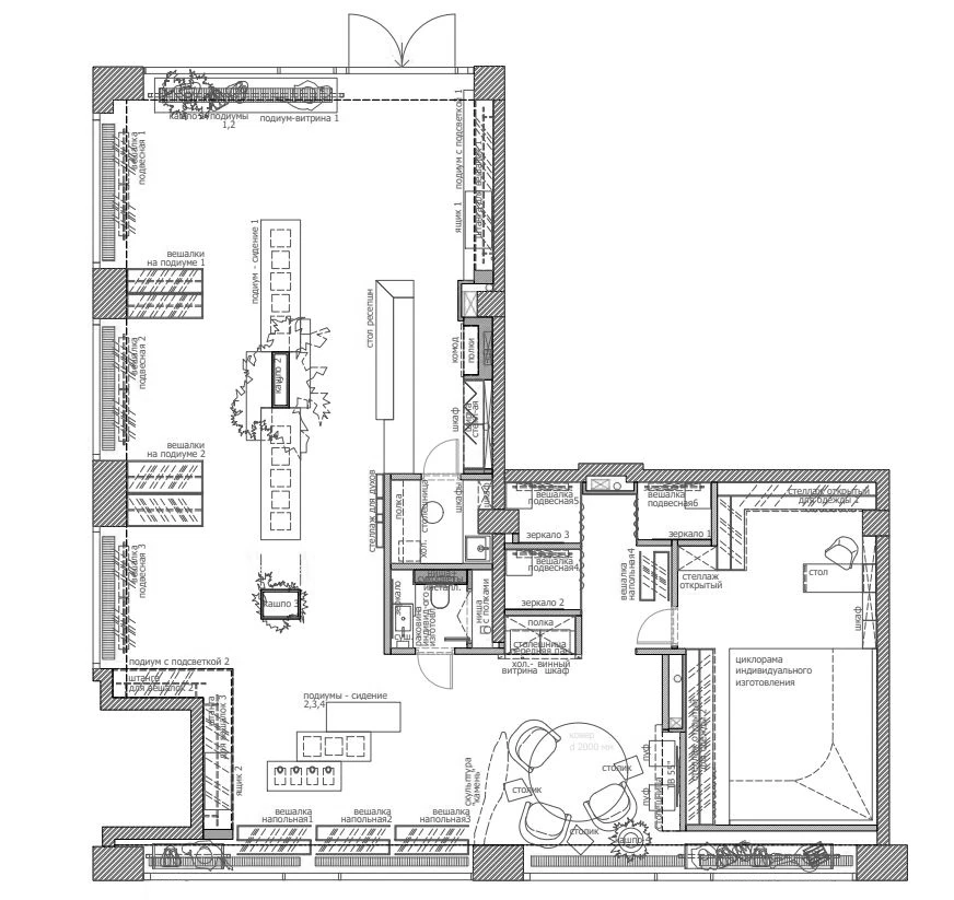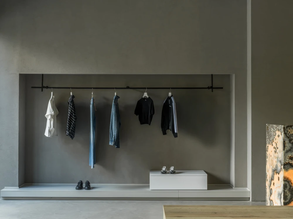 «Пространство разделили на несколько функциональных зон: просторный торговый зал с кассовой зоной и двумя примерочными, зона отдыха и ожидания, санузел для посетителей и складское помещение с зоной для проведения съемок, где оборудовали настоящую циклораму — профессиональное пространство для модных съемок и визуального контента. Зона ожидания рядом с примерочными оформлена как камерное атмосферное место отдыха, где можно не только расслабиться, но и выпить кофе — для этого предусмотрена небольшая, но уютная кухня».