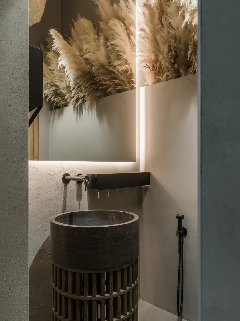 «Кассовая стойка изготовлена из выразительного натурального оникса, а потолок украшен панелями с эффектом ряби на воде. Нейтральный бетонный пол, нарочито потрескавшаяся штукатурка на черных полуколоннах — эти детали неслучайны, они несут ассоциативную и символическую нагрузку. Интерьер остается минималистичным, но не холодным, напротив, он наполнен эмоцией».