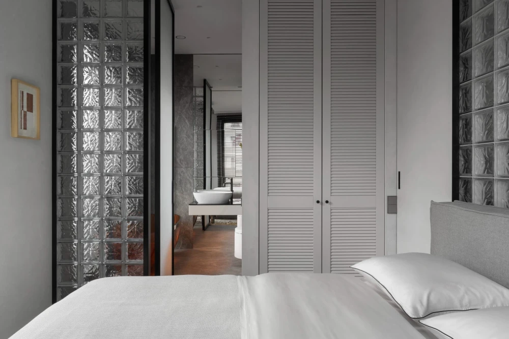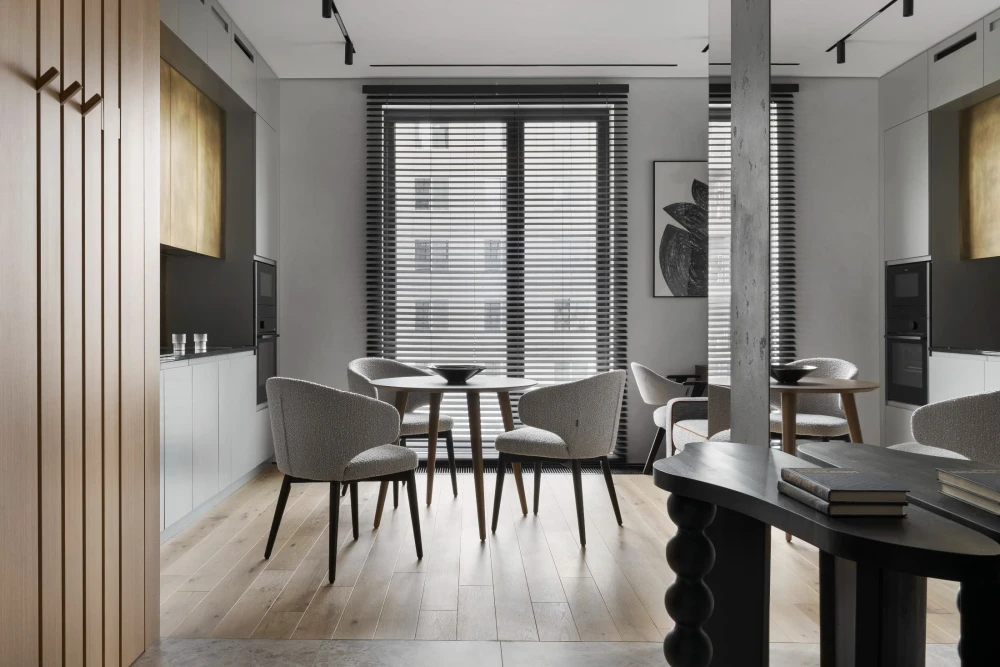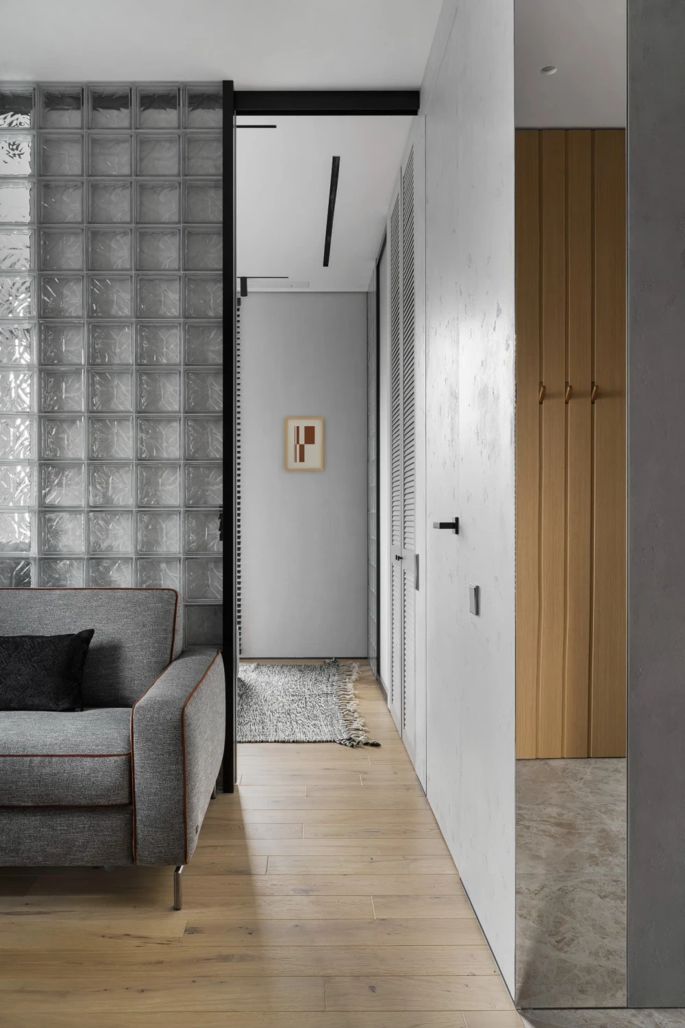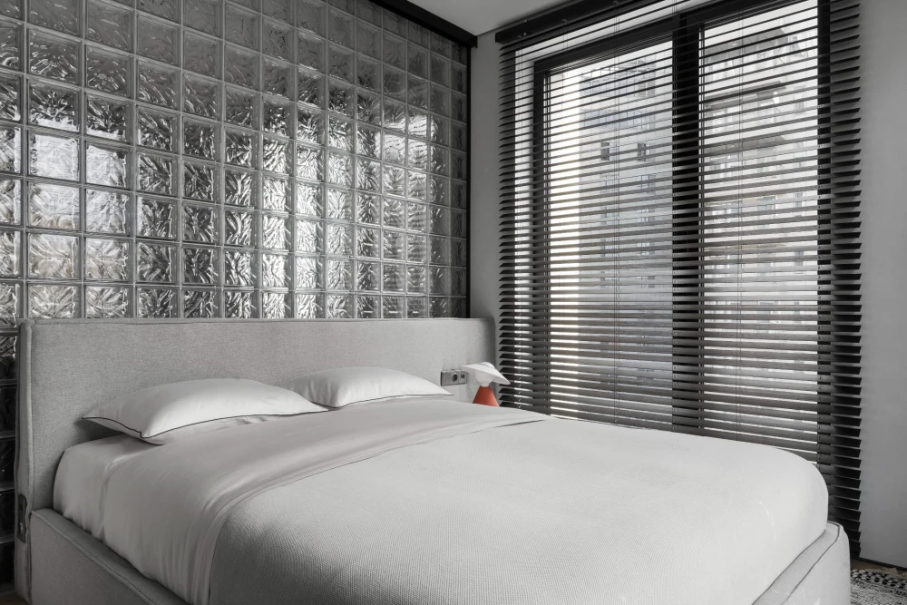 «Небольшой метраж квартиры — 45 кв. метров — требовал по-настоящему интересных приемов зонирования, — рассказывает дизайнер. — Пространство решили не дробить на глухие комнаты, поэтому на помощь пришли светопрозрачные перегородки из стеклоблоков. Они визуально увеличили площадь и обеспечили целостность интерьера. Изначально на объекте были выделены только мокрые точки — вокруг них уже были возведены стены, которые пришлось корректировать. Мы перенесли некоторые проходы, чтобы сделать сценарии движения более эргономичными. Залитую дневным светом половину дома отвели под объединенную кухню-гостиную и спальню, а в глубине помещения разместили санузлы, гардеробную и компактный хаммам».