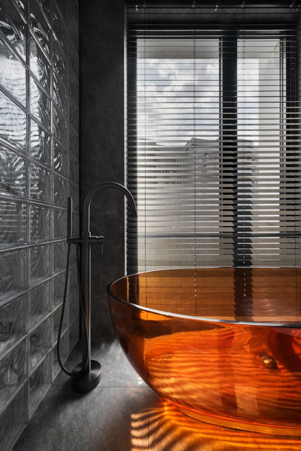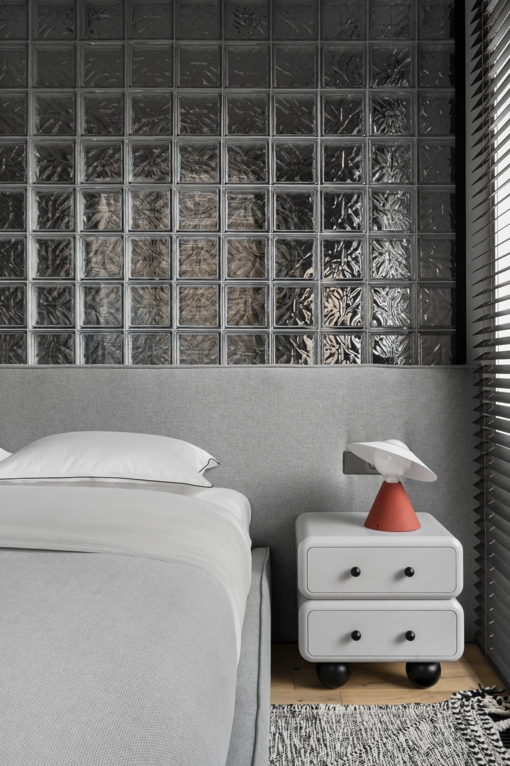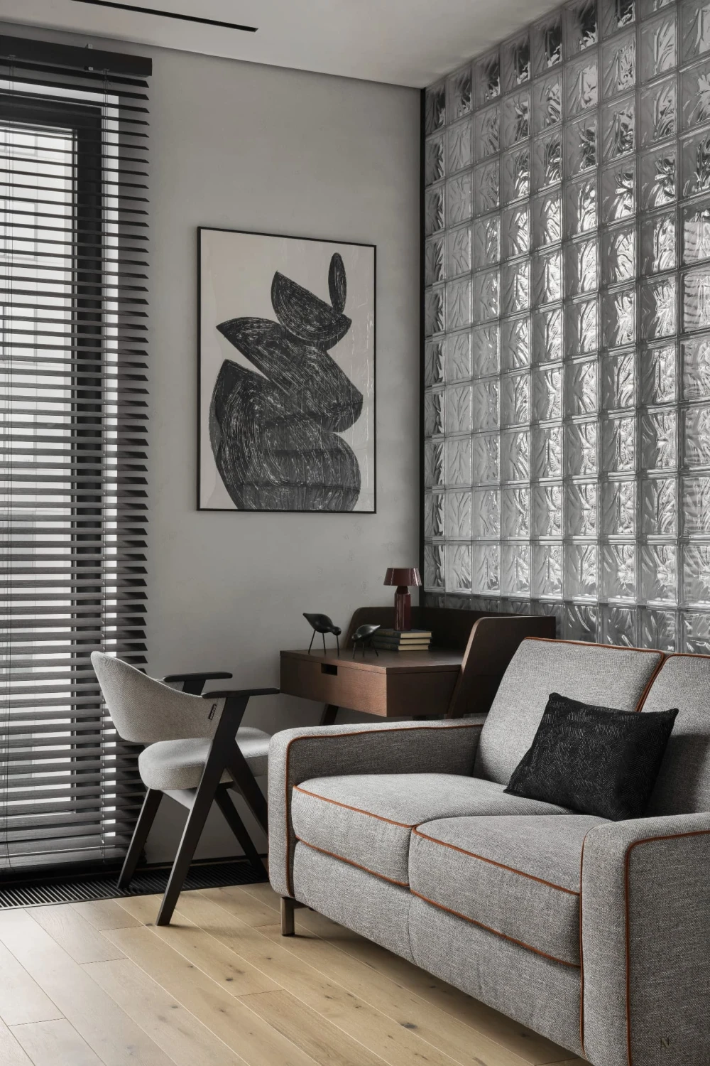 «Небольшой метраж квартиры — 45 кв. метров — требовал по-настоящему интересных приемов зонирования, — рассказывает дизайнер. — Пространство решили не дробить на глухие комнаты, поэтому на помощь пришли светопрозрачные перегородки из стеклоблоков. Они визуально увеличили площадь и обеспечили целостность интерьера. Изначально на объекте были выделены только мокрые точки — вокруг них уже были возведены стены, которые пришлось корректировать. Мы перенесли некоторые проходы, чтобы сделать сценарии движения более эргономичными. Залитую дневным светом половину дома отвели под объединенную кухню-гостиную и спальню, а в глубине помещения разместили санузлы, гардеробную и компактный хаммам».