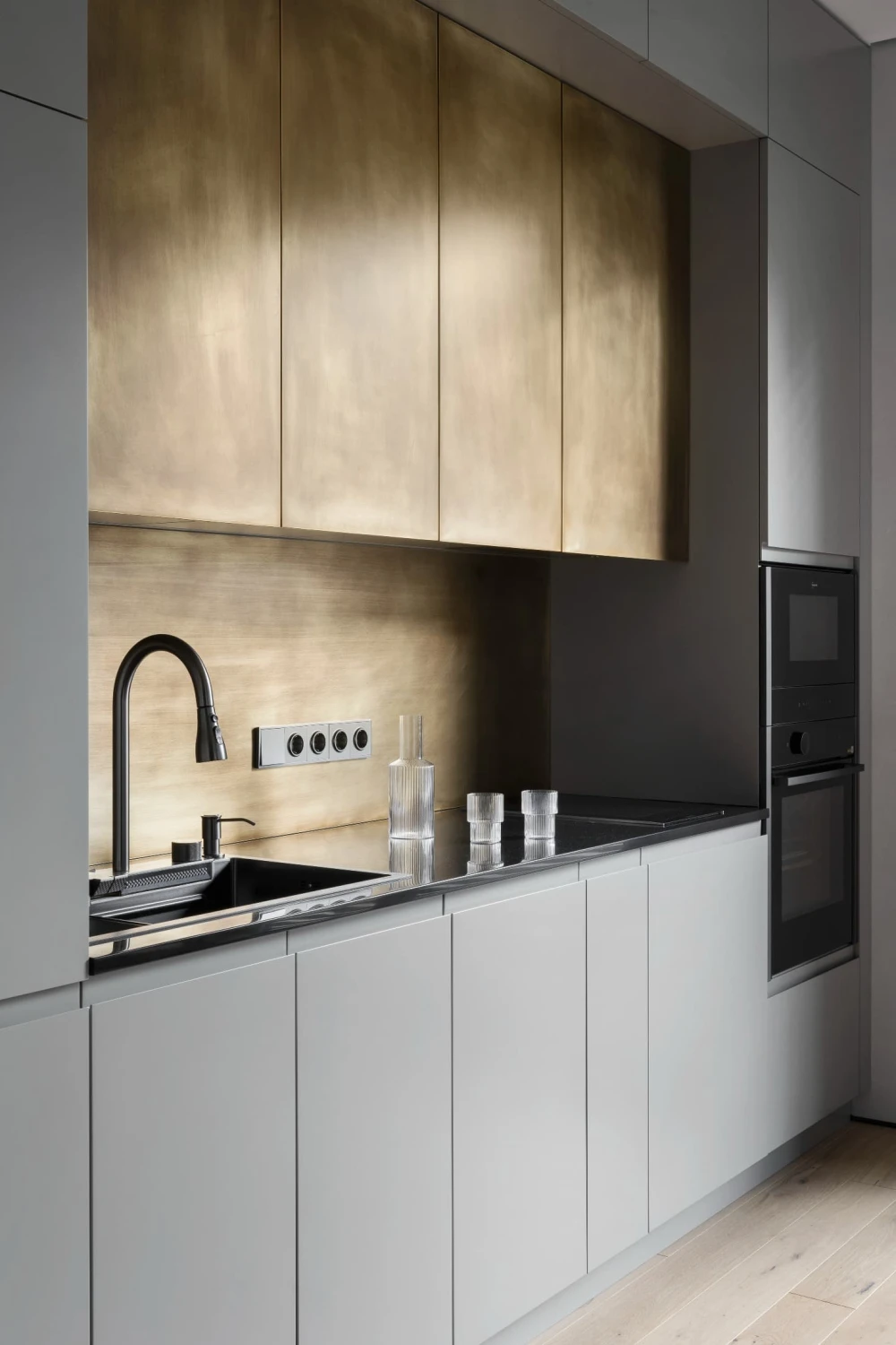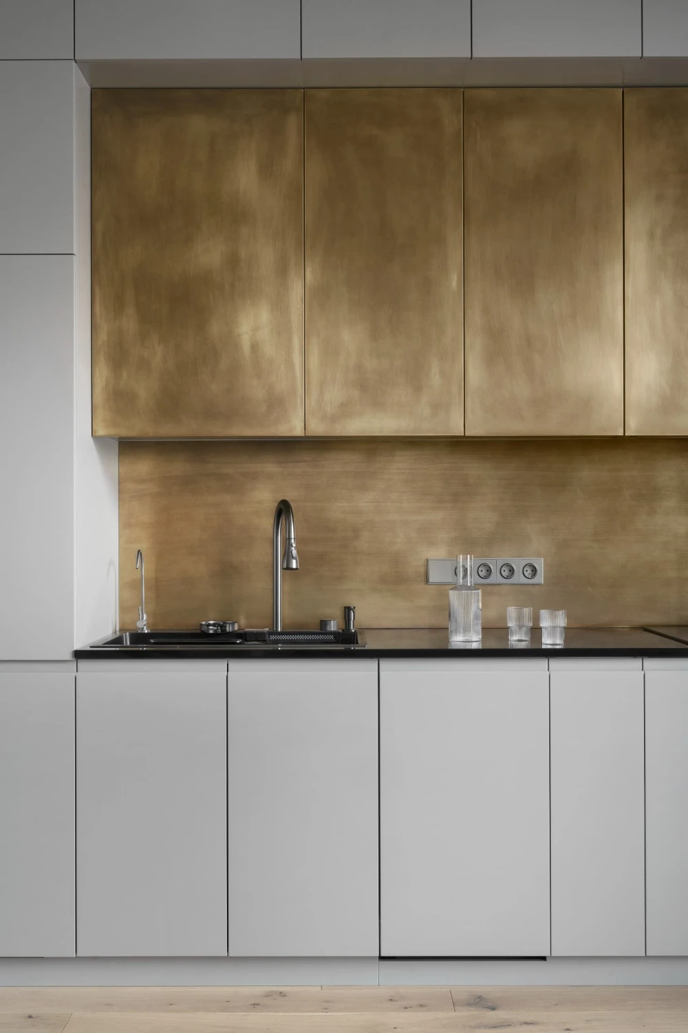 «Характер заказчика как нельзя лучше отразил экспериментальный кухонный гарнитур: фартук и центральные секции выделены яркой текстурой металла. Реализовать эту задумку было непросто: сначала мы рассматривали декоративную штукатурку с металлизированным эффектом, потом жидкий металл. В итоге решением стала патинированная латунь, которую для долговечности покрыли защитным лаком. Нейтральная обеденная группа и эргономичный диван оттеняют эту эффектную фактуру».