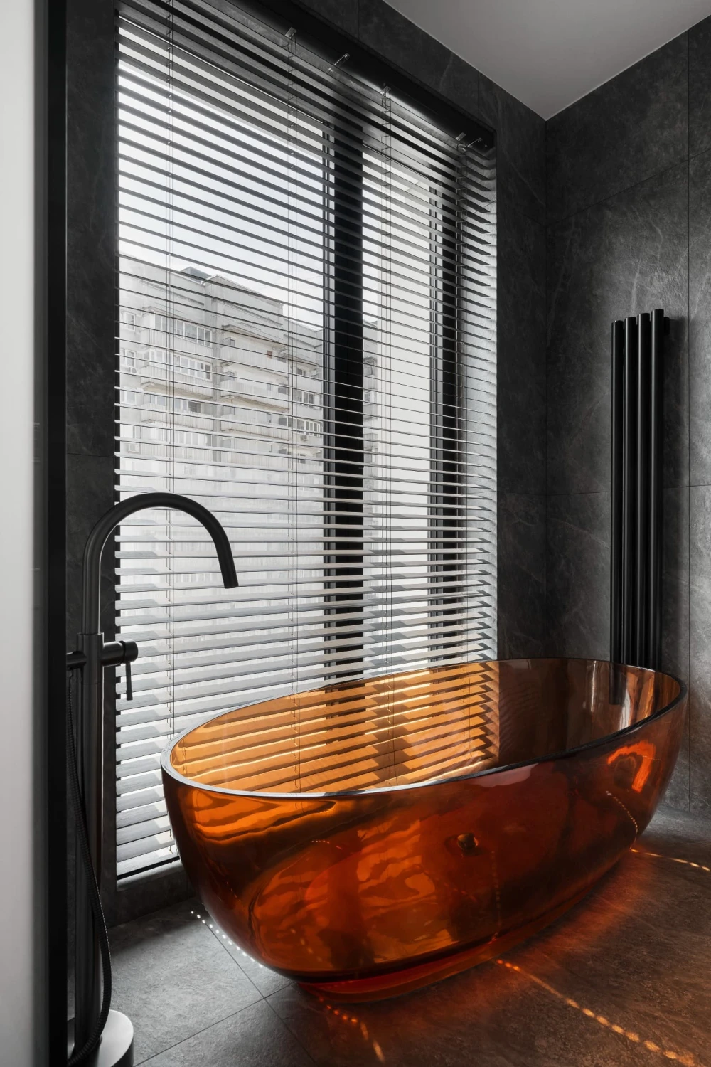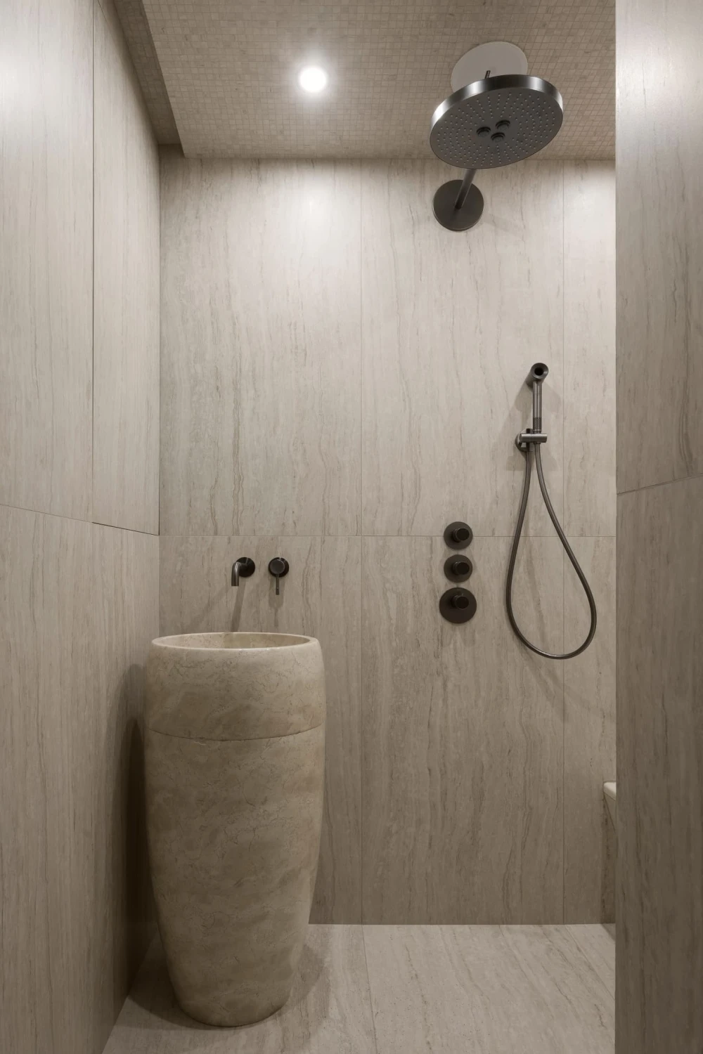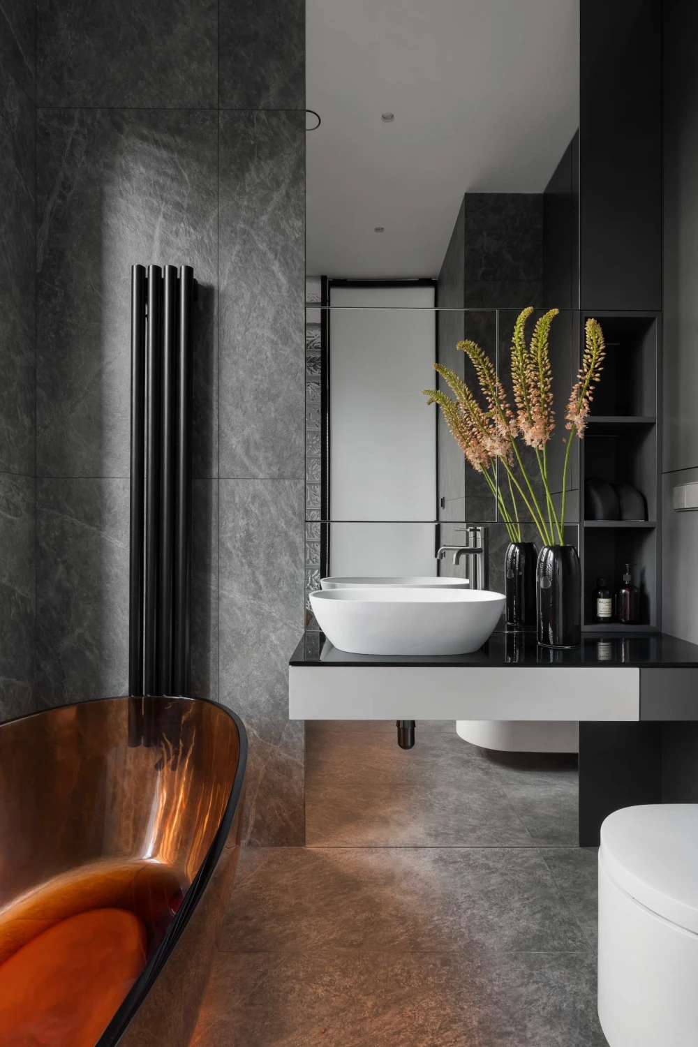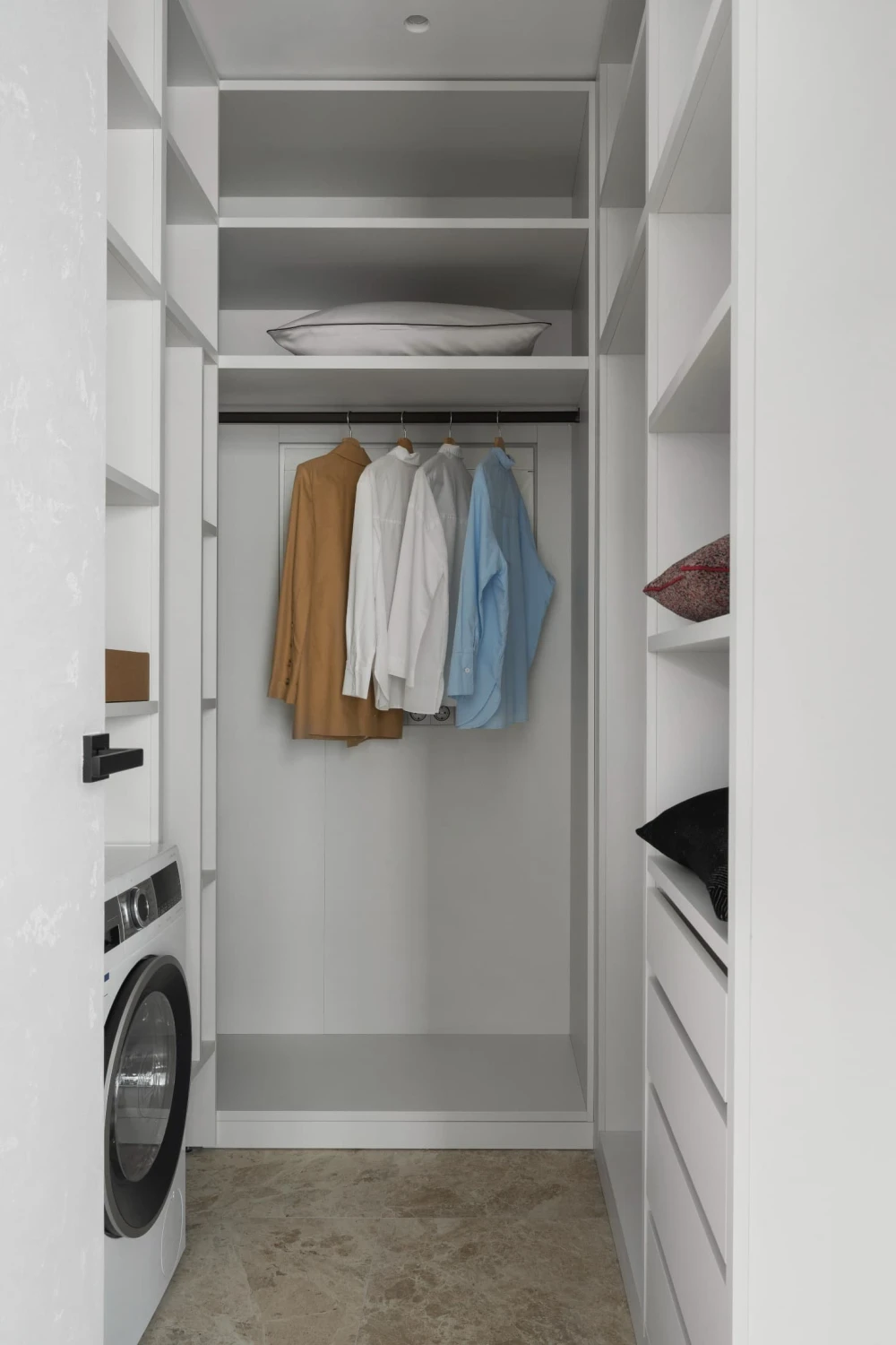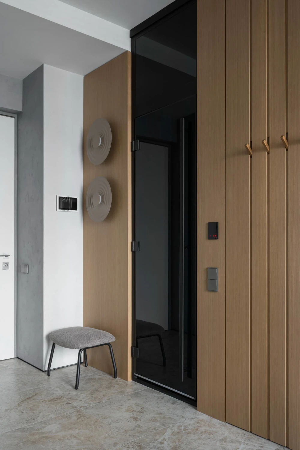 «За белой дверью скрывается вместительная гардеробная с постирочной зоной, объем которой не перегружает пространство благодаря системе обратного открывания. Изюминкой проекта стал полноценный хаммам — редкое решение для квартир такого метража. Он разместился за черной стеклянной дверью с нетипично высокой фрамугой, которая помогла замаскировать конструктивные особенности потолка и сохранить чистоту дизайнерской концепции».
