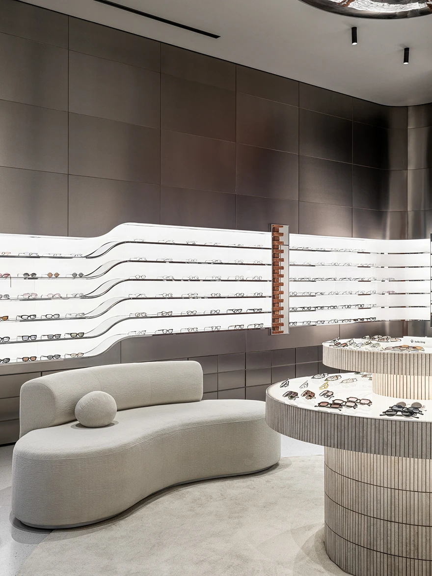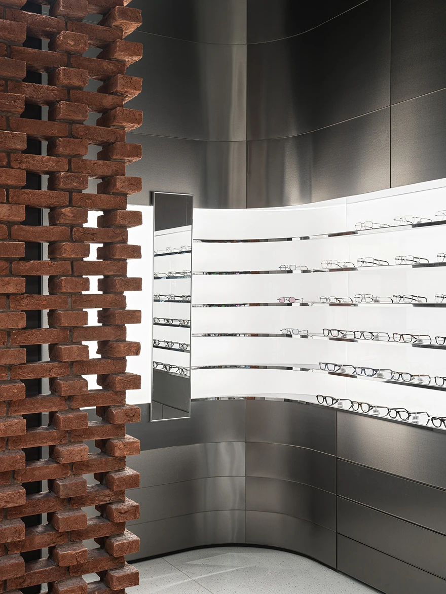 Округлые органические формы пространства символизируют совершенство технологий и природную естественность. А перегородка из клинкерного кирпича соединяет фасад шоурума с его интерьером и обеспечивает гармоничный переход извне вовнутрь. Система встроенных полок и световых ниш эффектно презентует ассортимент очков и создает комфортное освещение для примерки.