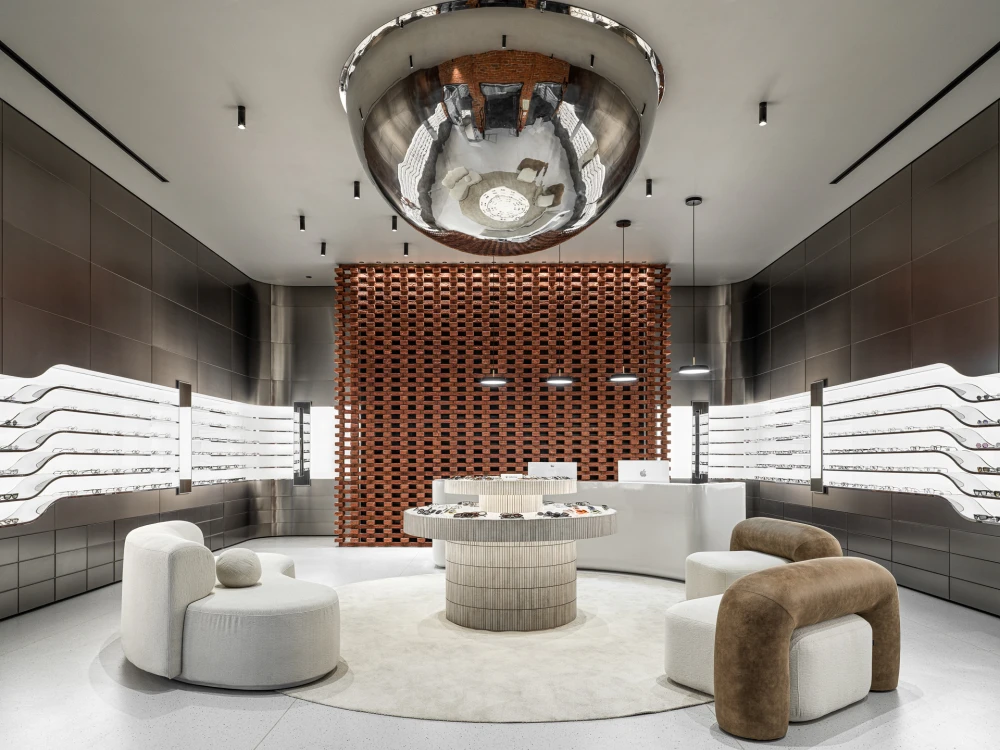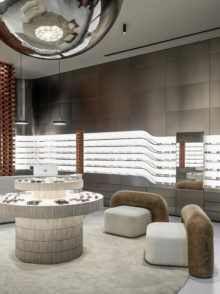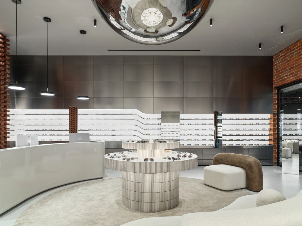 В пространстве площадью 95 кв. метров сформировали основной зал для экспозиции и продажи, медицинский кабинет для проверки зрения и функциональный хозяйственный блок. В центре внимания — избранная коллекция очков, эффектно выделенная хромированной полусферой. Вокруг нее расположена лаунж-зона, комфортная для неспешного выбора, общения и ожидания.