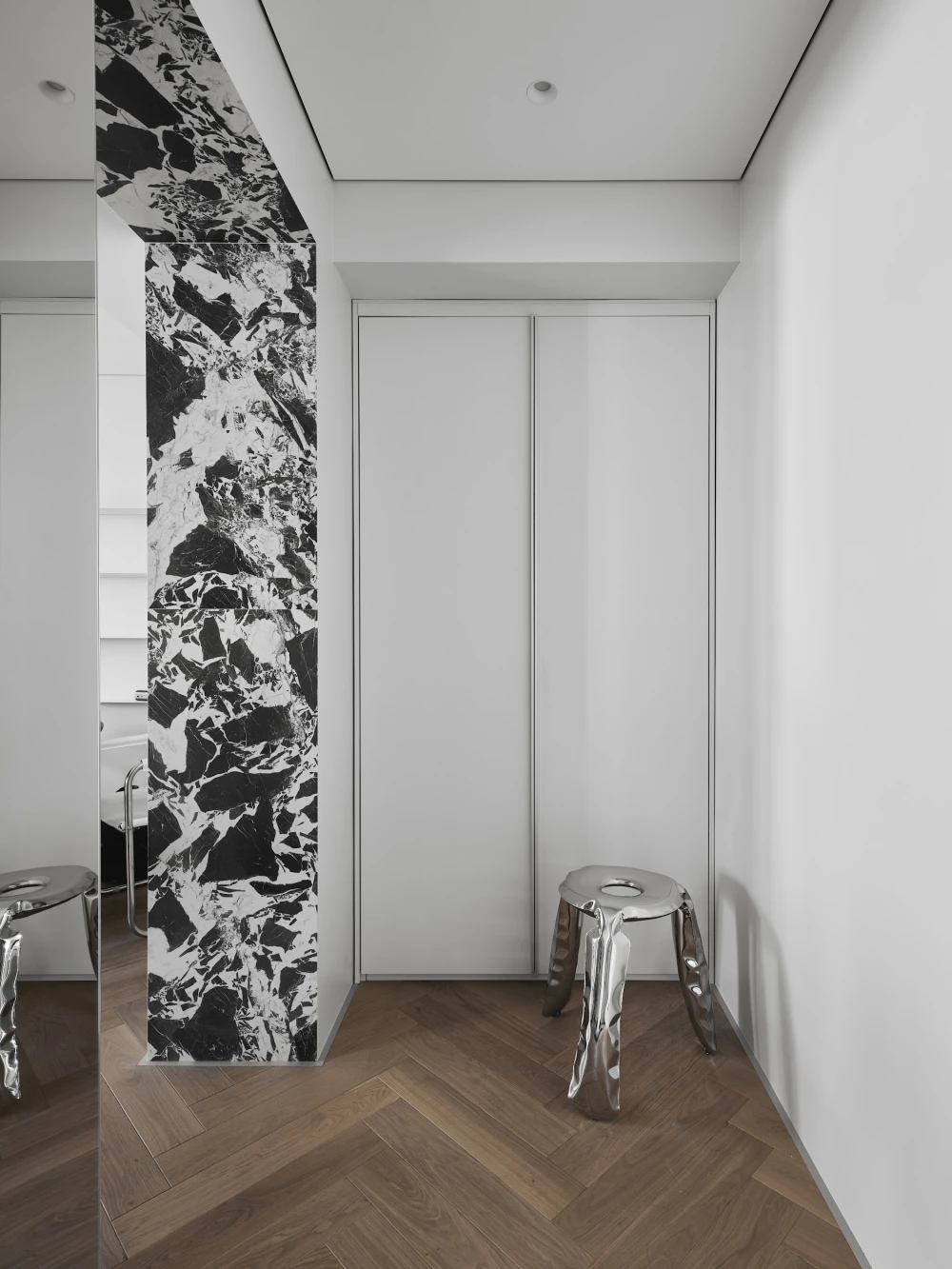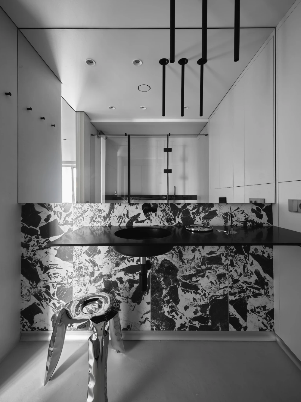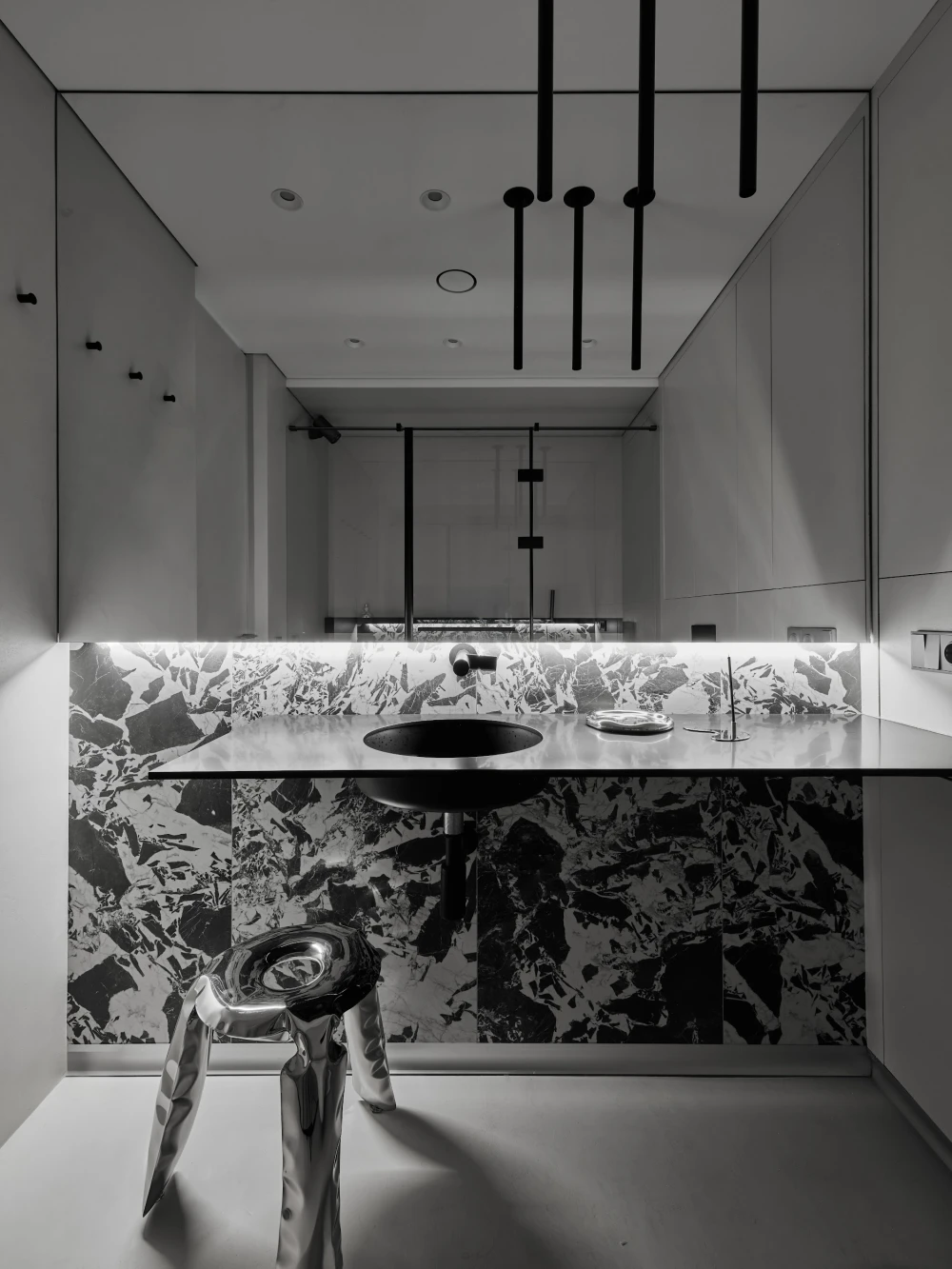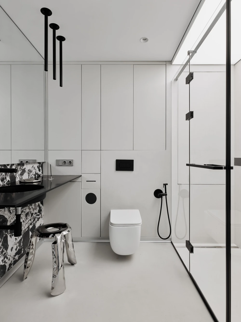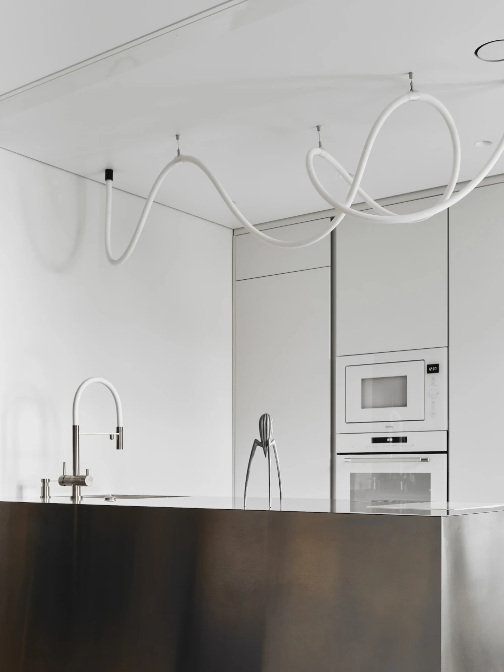 «Мы сознательно отказались от визуального шума, сосредоточившись на композиции, материалах и нюансах, — рассказывает Евгений. — Нержавеющая сталь, натуральный камень, белые плоскости, теплый паркет — все собрано в сбалансированную спокойную структуру, где нет ничего лишнего. Особую роль сыграл декор, собранный женой из разных уголков мира: он привнес в интерьер не только индивидуальность, но и личную историю — тонкую, но ощущаемую. Это не стилизованный интерьер, а среда, в которой нам по-настоящему комфортно».