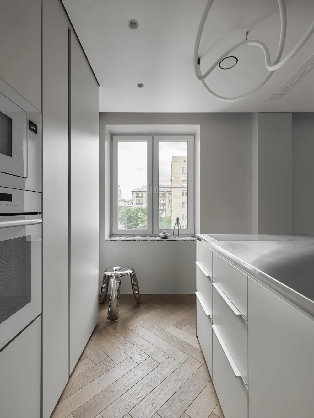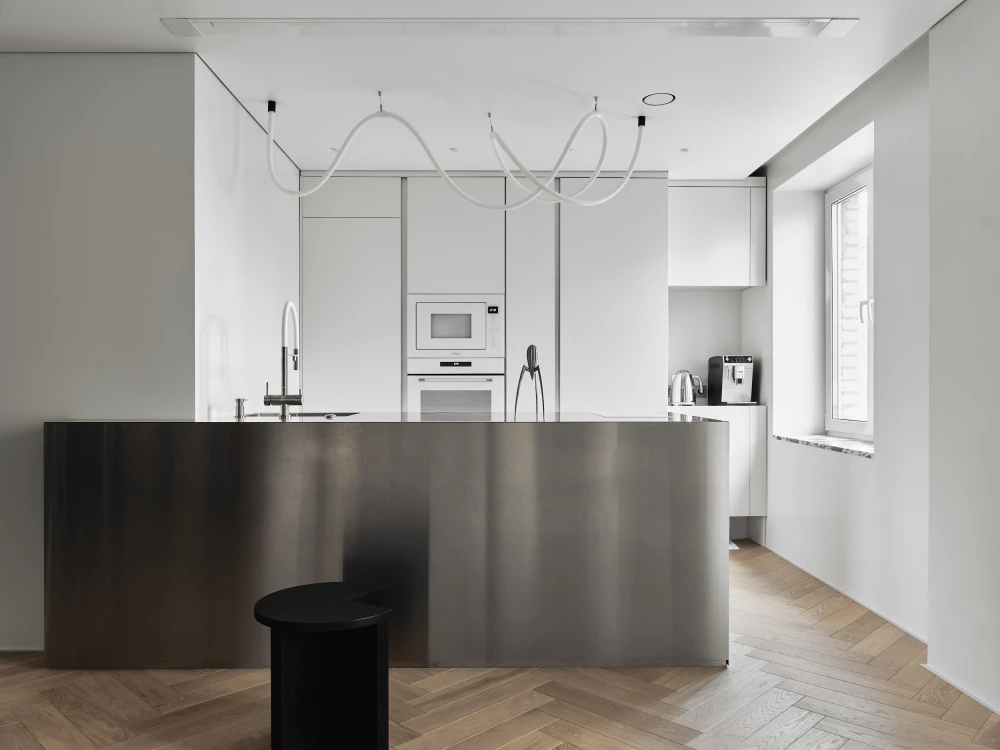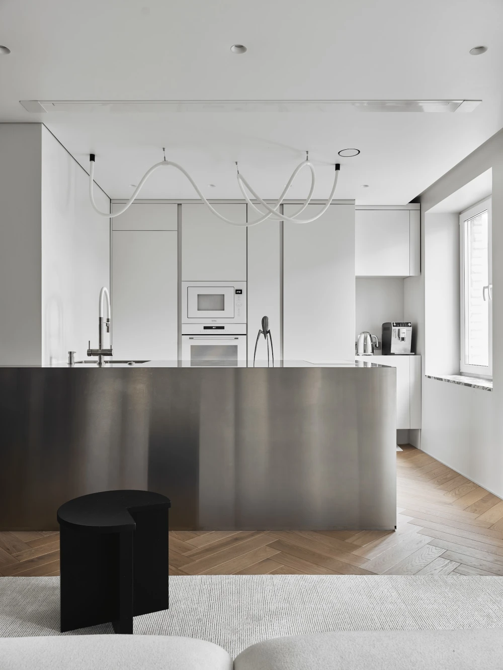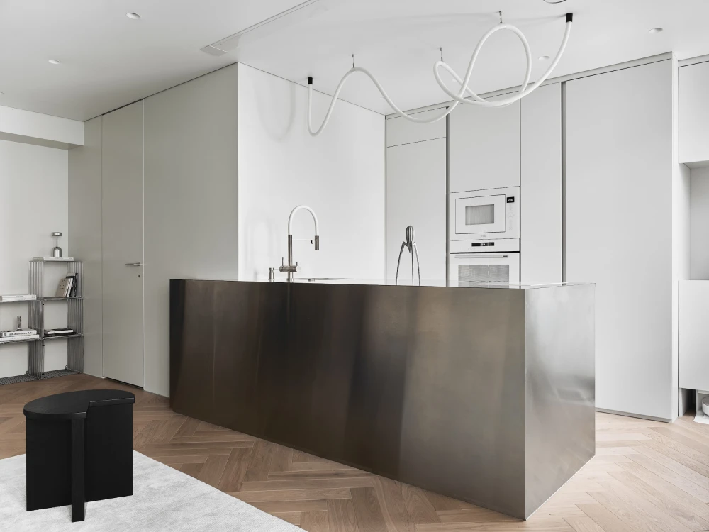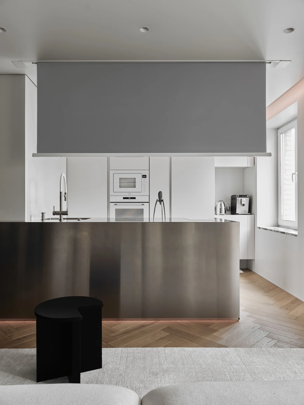 «Кухонный остров из стали стал композиционным центром пространства, а встроенные системы хранения и скрытые проемы подчеркивают цельность решений. Технологически мы обновили все: заменили инженерные системы, интегрировали умный дом с централизованным управлением. На кухне в потолок встроено скрытое полотно проектора, которое выдвигается по сценарию».