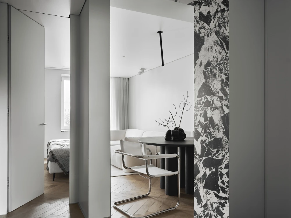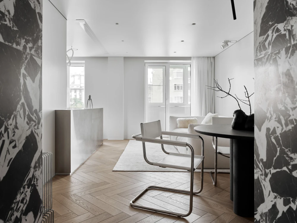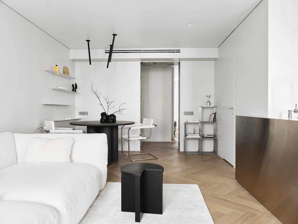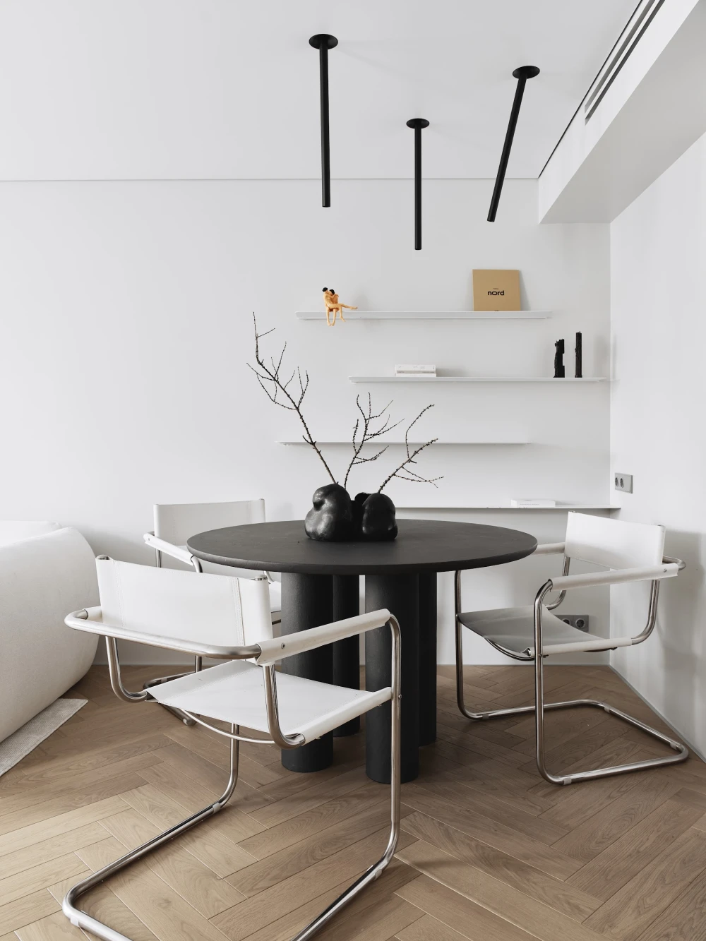 Эта квартира в московском старом фонде — глубоко личный проект дизайнера Евгения Малышкина, который он создавал для себя и своей супруги. Как сооснователь дизайн-бюро NORD, он воплотил в этом пространстве площадью 51 кв. метр свой главный эстетический принцип — гармонию контрастов. Интерьер отражает полное единство пары во взглядах на стиль, их стремление к чистоте форм и отсутствию визуального шума.