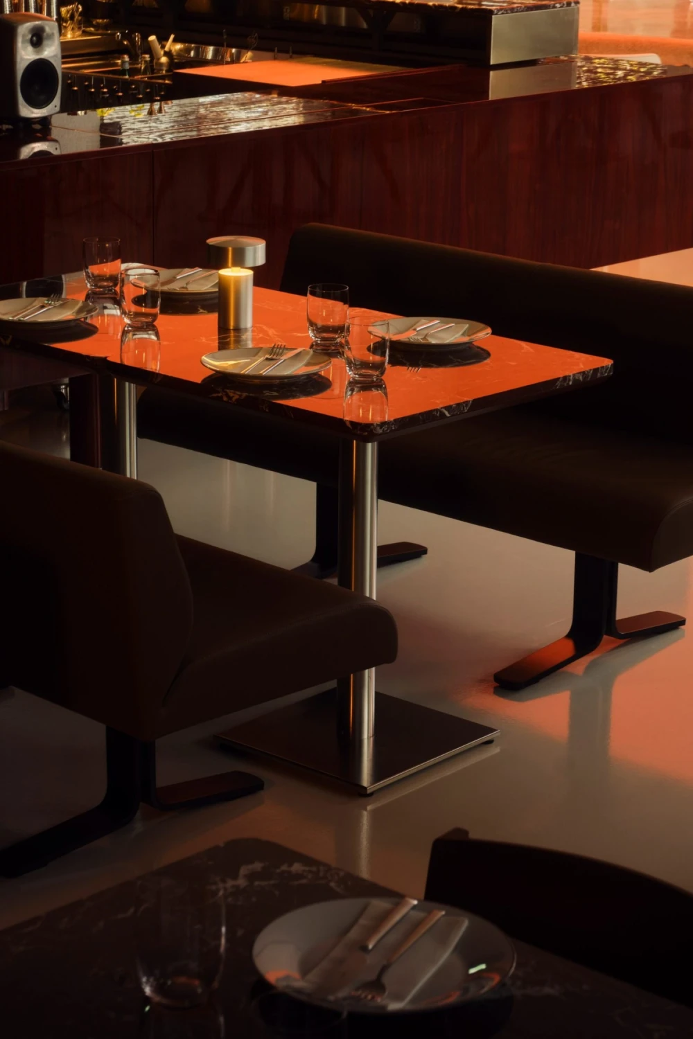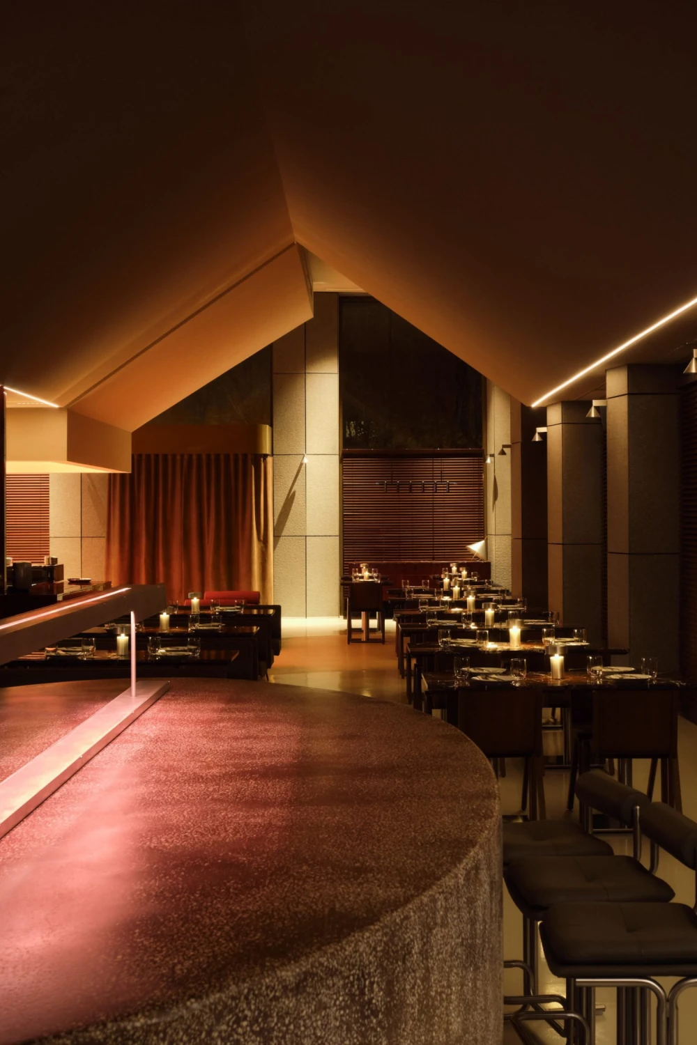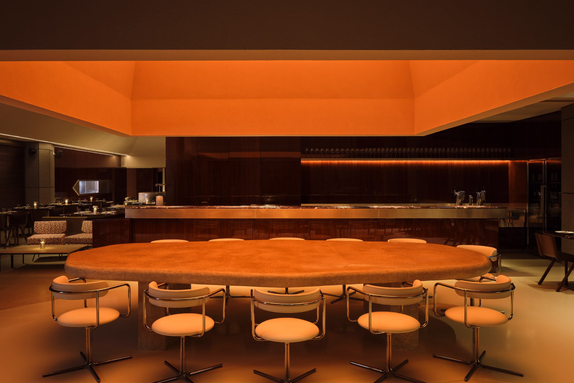 Ресторан расположился на первом этаже современного офисного здания в Бухаресте, вдохновленного ар-деко. Интерьер продолжает язык архитектуры: так, отделка пола, сочетающая микробетон и терраццо, переосмысливают геометрический ритм колонн фасада. Центральное место занимает округлый общий стол из терраццо. Над ним разместился скульптурный потолочный короб со встроенным освещением, который дизайнеры называют «вулканом света». Он излучает теплое оранжевое свечение, напоминающее лаву. При желании оттенок можно изменить на желтый или красный, чтобы создать немного другое настроение в интерьере. Сложную геометрию пространства дополнительно подчеркивают светодиодные тонкие полосы у основания потолочных скатов.