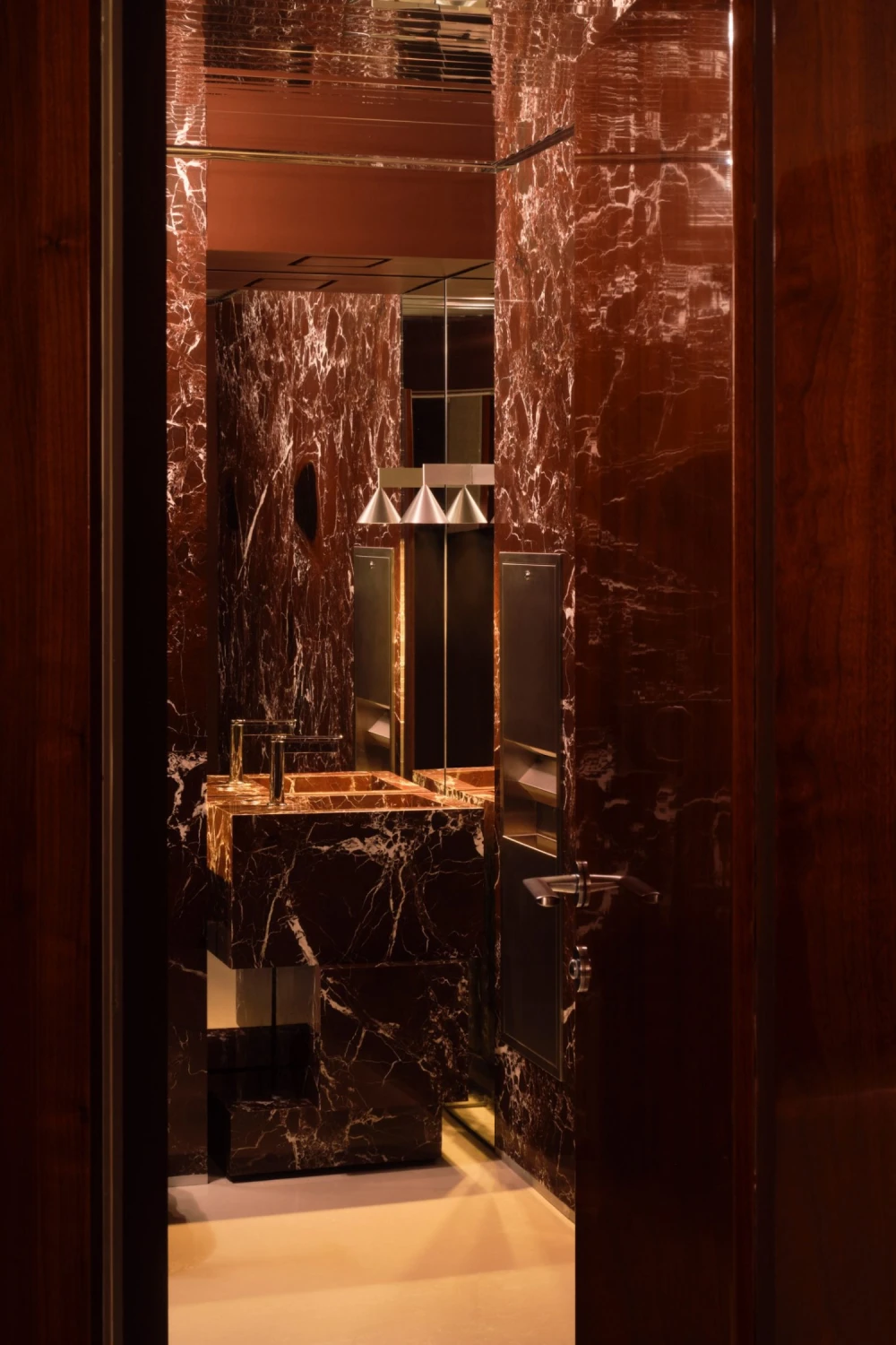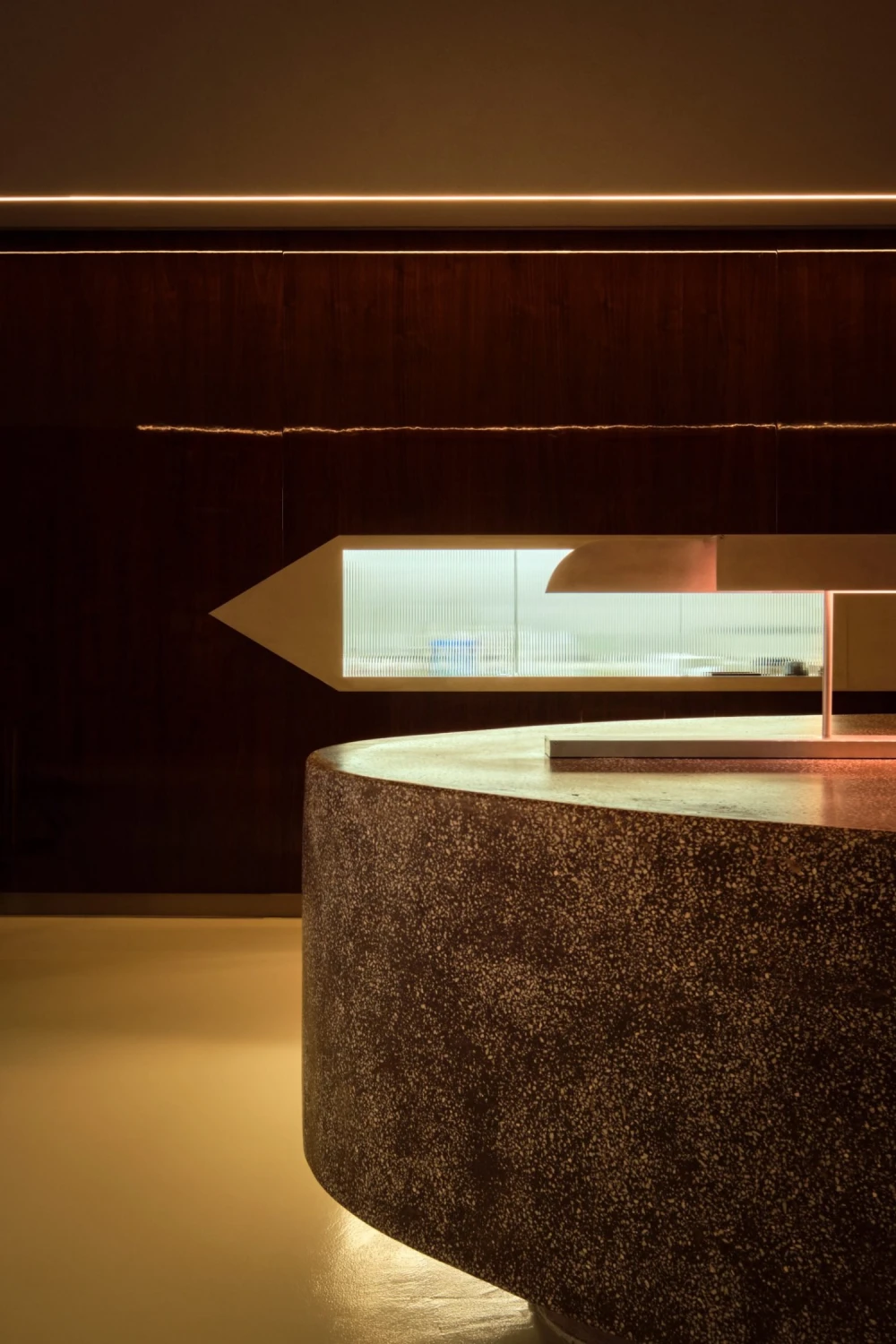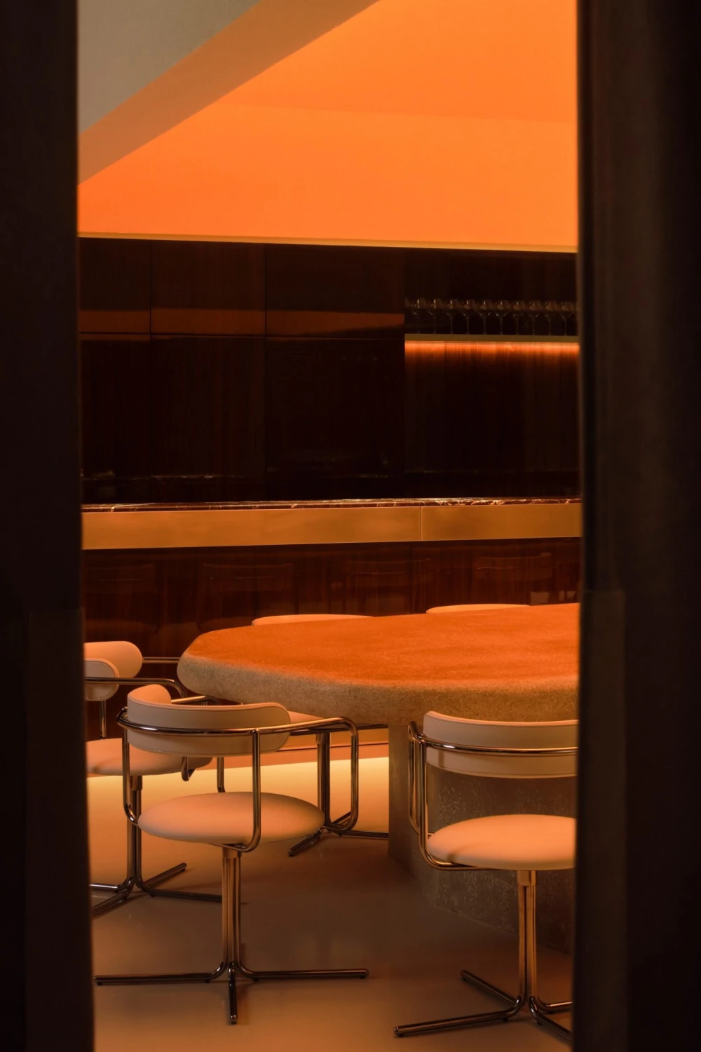 Ресторан расположился на первом этаже современного офисного здания в Бухаресте, вдохновленного ар-деко. Интерьер продолжает язык архитектуры: так, отделка пола, сочетающая микробетон и терраццо, переосмысливают геометрический ритм колонн фасада. Центральное место занимает округлый общий стол из терраццо. Над ним разместился скульптурный потолочный короб со встроенным освещением, который дизайнеры называют «вулканом света». Он излучает теплое оранжевое свечение, напоминающее лаву. При желании оттенок можно изменить на желтый или красный, чтобы создать немного другое настроение в интерьере. Сложную геометрию пространства дополнительно подчеркивают светодиодные тонкие полосы у основания потолочных скатов.