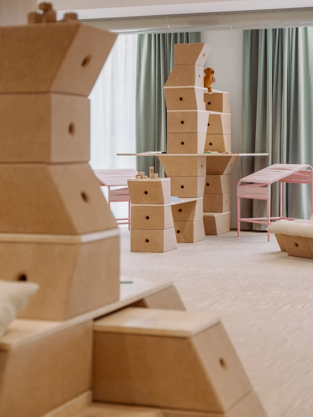 Детская зона Gioco Triennale оснащена мебелью студии Smarin. Здесь представлены модульные блоки из пробки и плоские сосновые панели, из которых дети могут конструировать скамейки, столы и игровые структуры. Все элементы сделаны без гвоздей и шурупов, что делает пространство безопасным для игр.