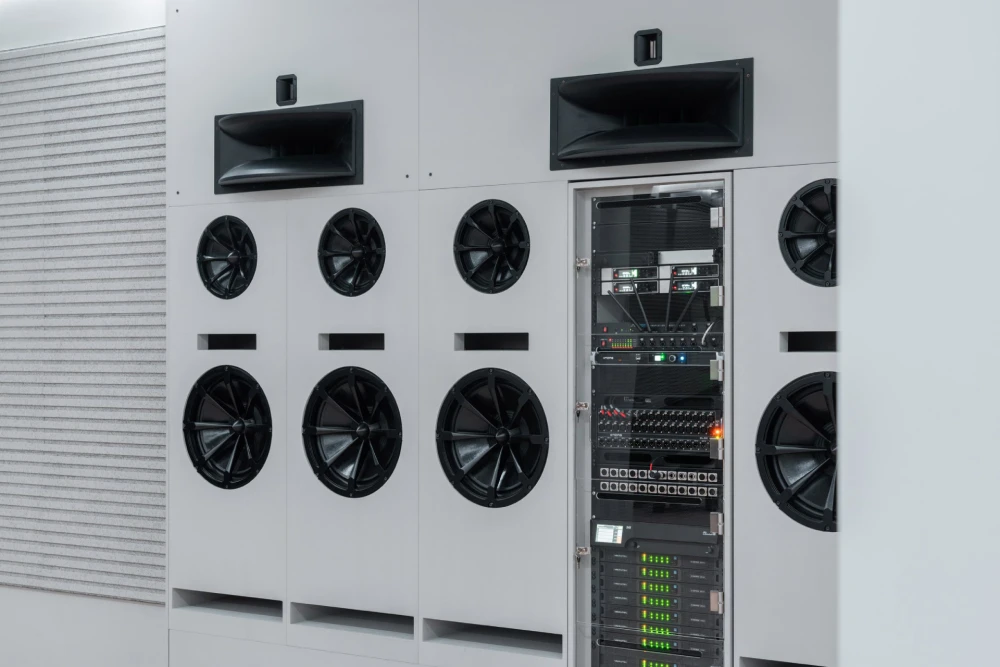 «В зоне Voce Triennale мы сделали интерьер максимально лаконичным, убрав лишние визуальные раздражители, чтобы тон здесь задавала музыка», — поясняет Боэри. Стены и потолок облицованы звукопоглощающими, звуконепроницаемыми и отражающими панелями, пространство дополняют динамическая система освещения и коктейльный бар. Художник Марчелло Малооберти разработал неоновую вывеску, отсылающую к эстетике ночной жизни, а дизайнер Филипп Малуэн создал для зала модульную систему мебели: массивный диван и группу кресел из темно-зеленого войлока с декоративными швами.
