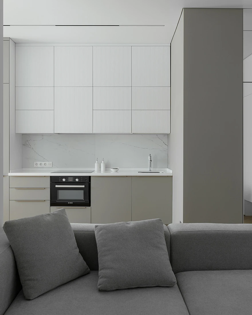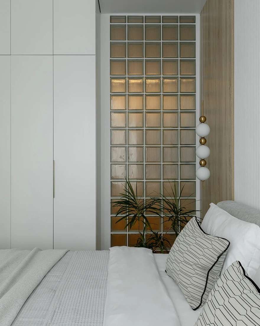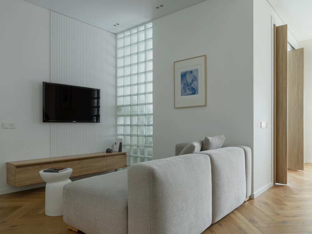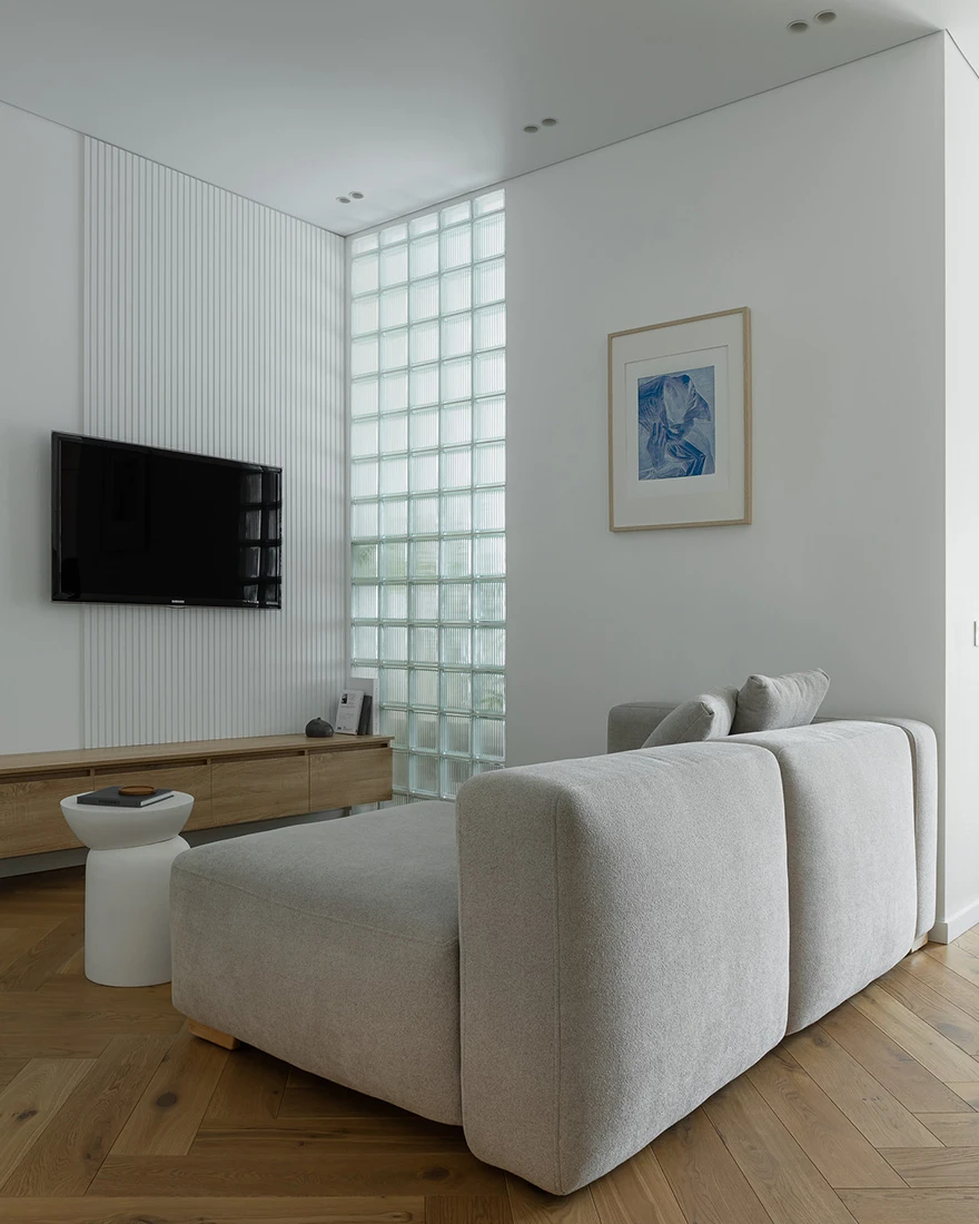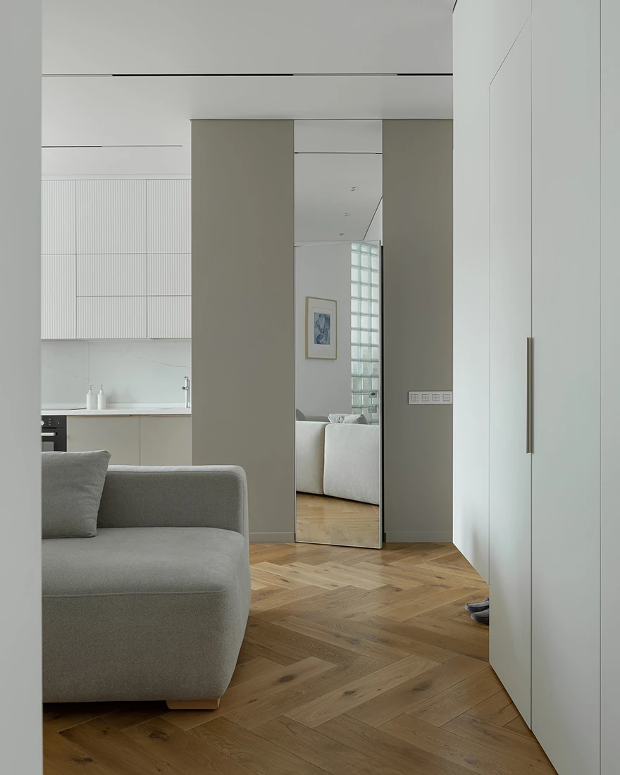 Интерьер выдержан в спокойной природной гамме. «Получился лаконичный минимализм. Белый цвет стен делает квартиру визуально просторнее, а мягкая мебель нейтрального серого цвета и латунные ручки на шкафах балансируют интерьер. Также спальню от гостиной отделяет стена из стеклоблоков, тем самым мы не теряем свет из окна. Для меня ценно, что я реализовал все запросы и пожелания заказчиков, сделав для них комфортный интерьер для жизни», — завершает дизайнер.